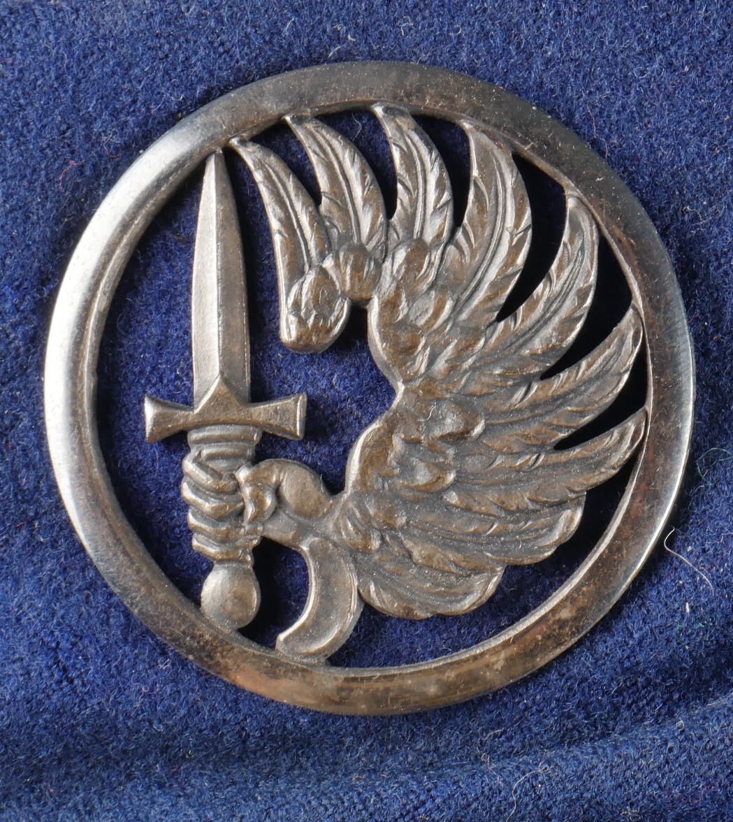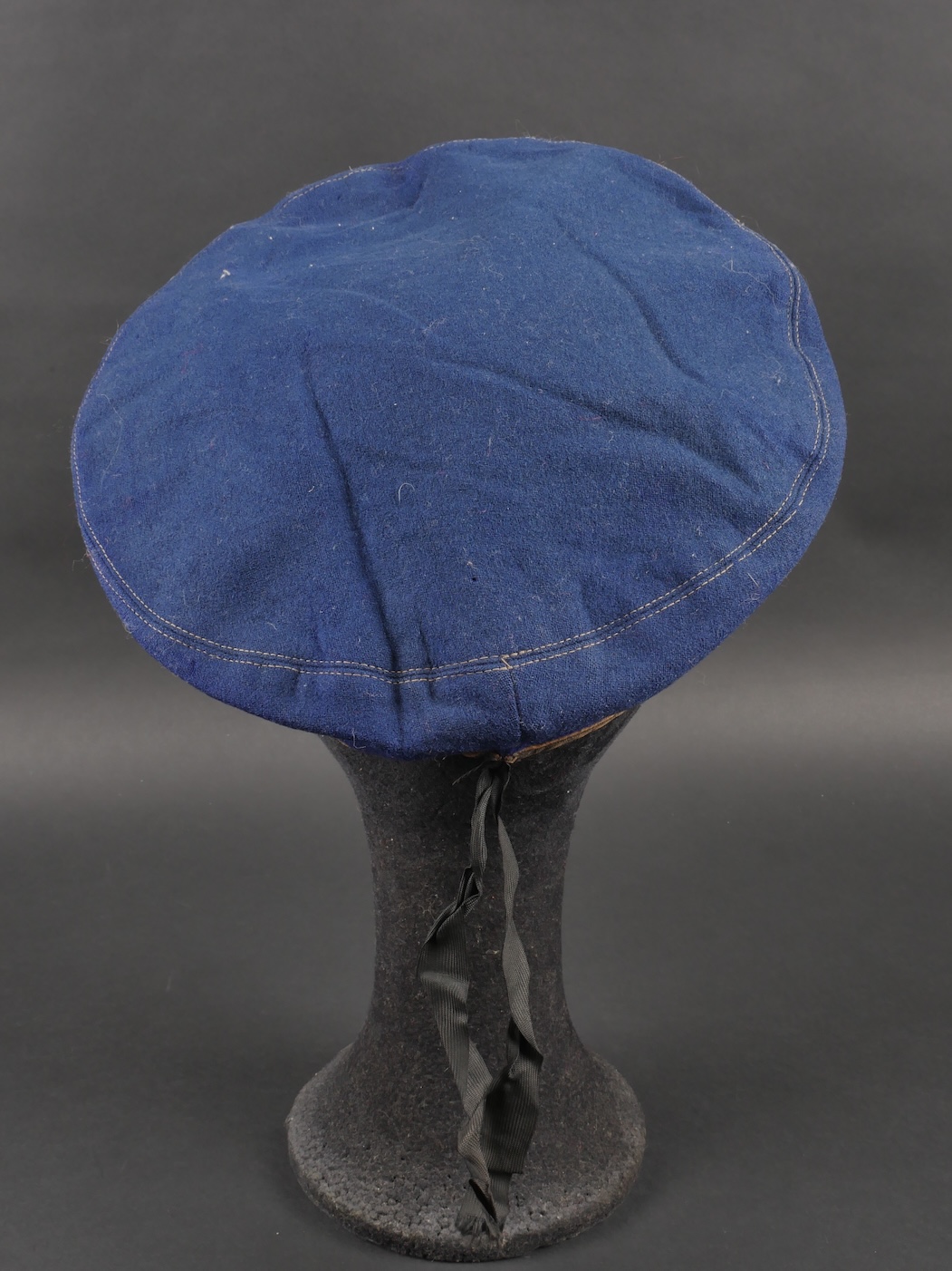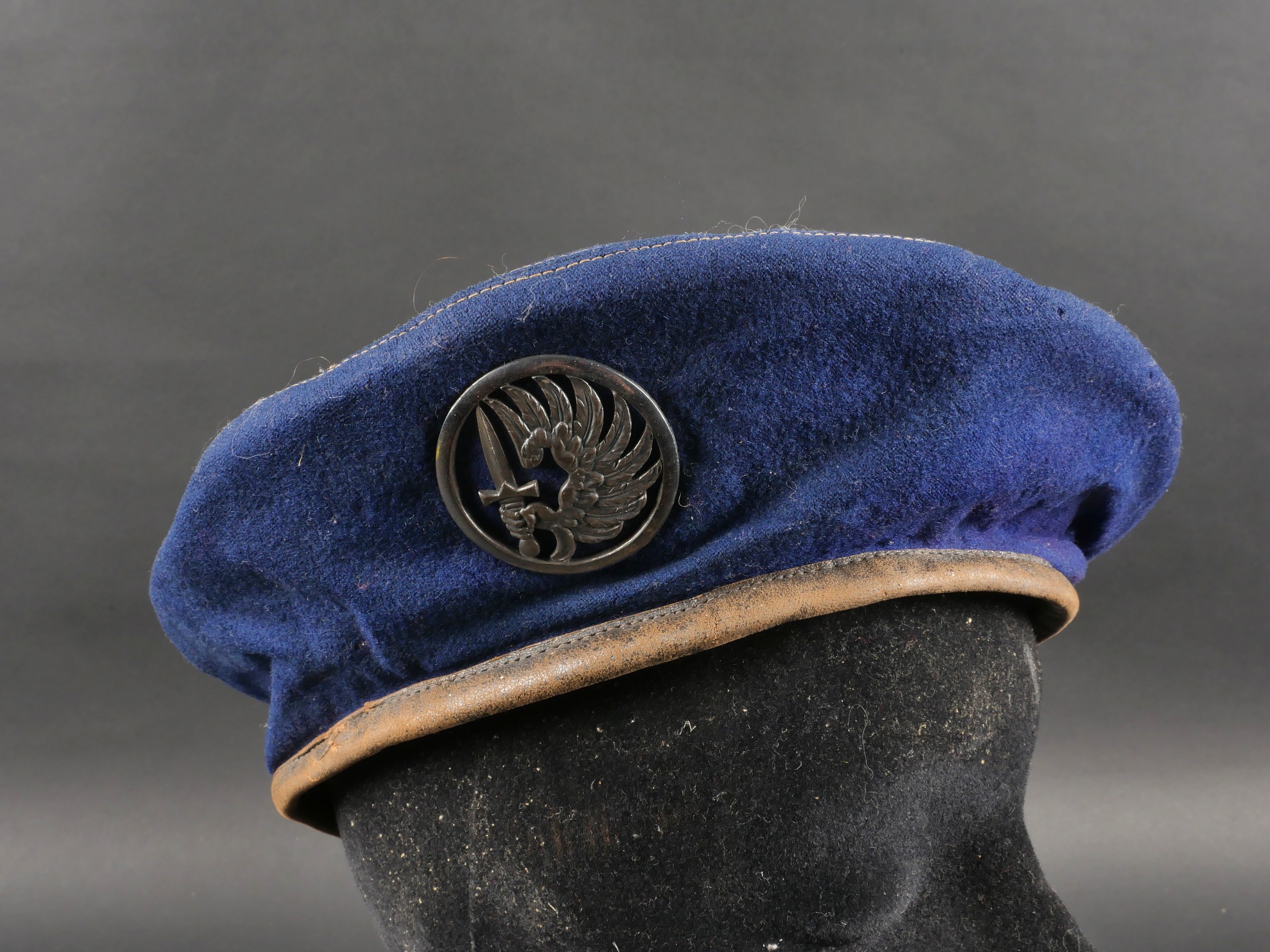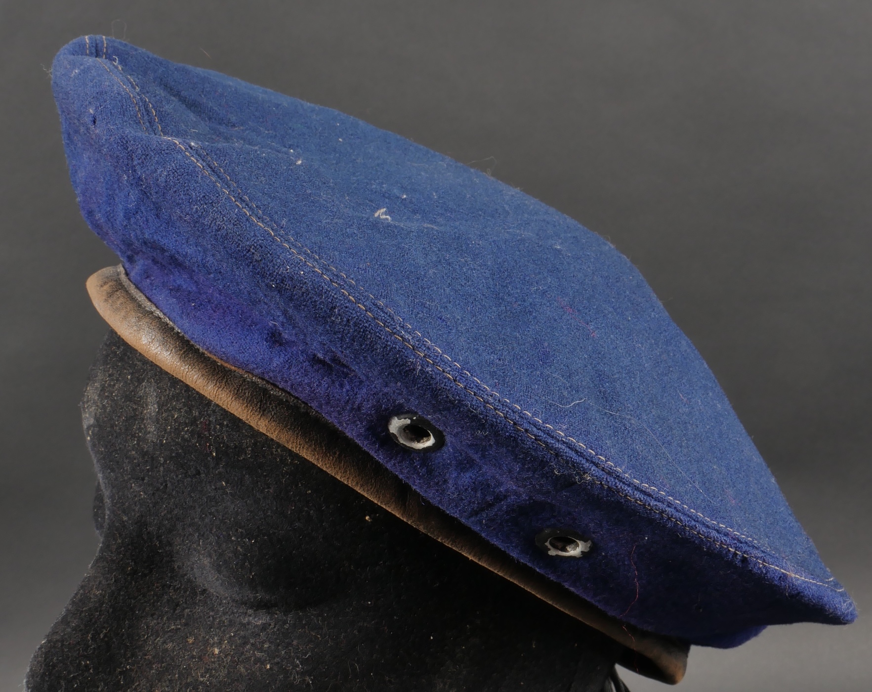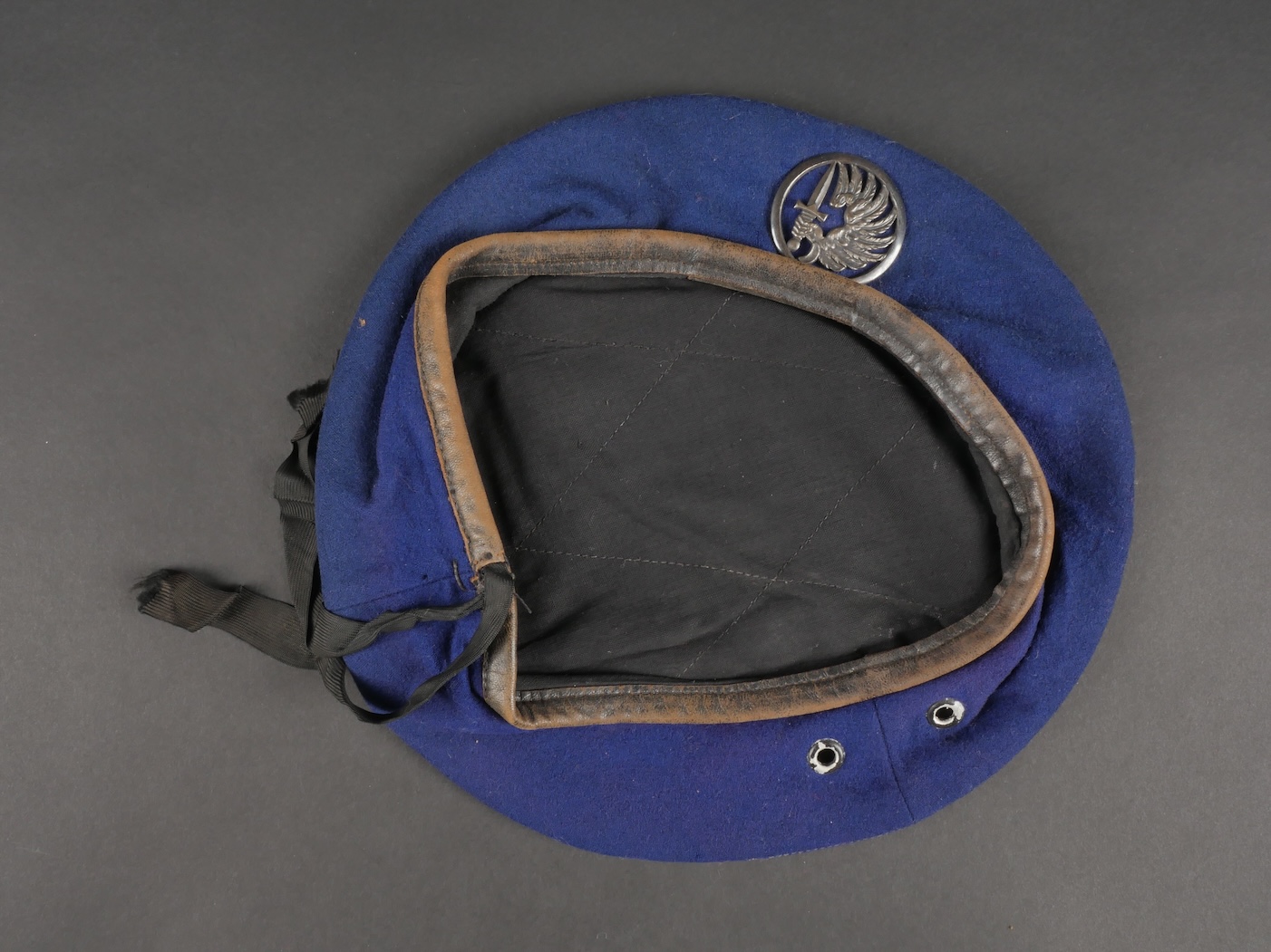 Béret Bleu Roy type commando en trois parties de fabrication réglementaire, Modèle 46. Doublure en coton noir quadrillée, 2 œillets en aluminium. Pourtour en cuir noirci. L’insigne est... en savoir plus