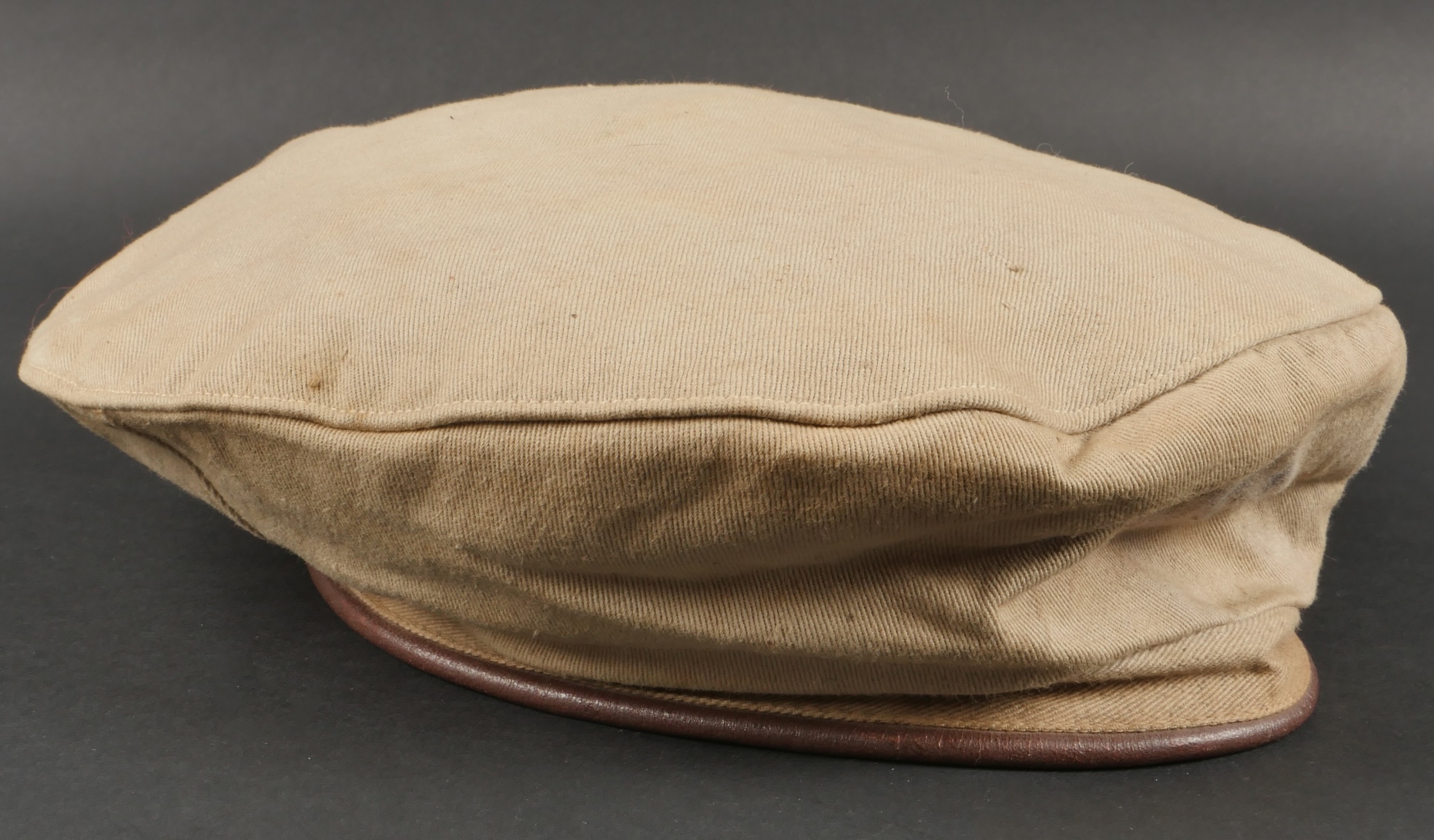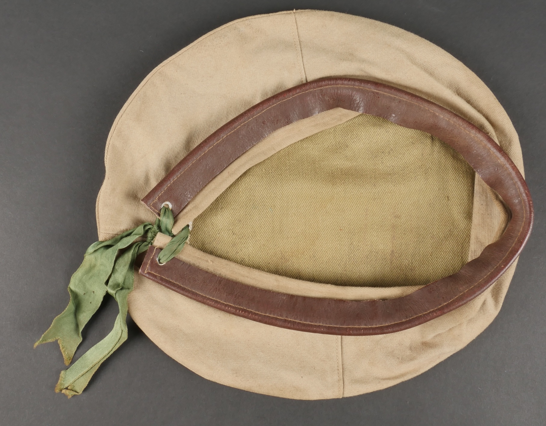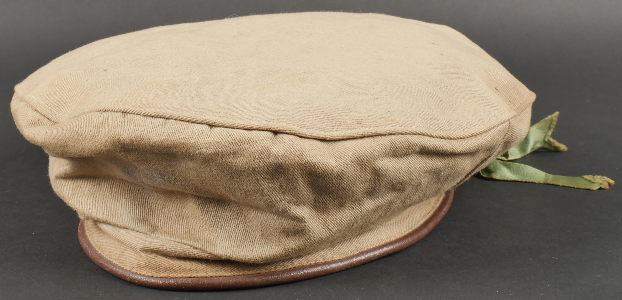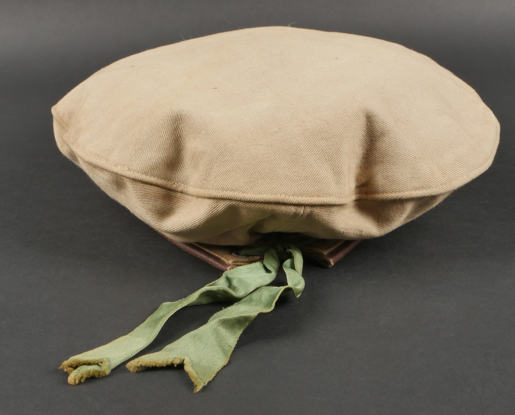 Béret dit Gurkha de confection française. Confectionné en 3 parties, en coton kaki clair. Flots vert correspondant à l’arme du Train passants par 4 œillets en aluminium. Bandeau en cuir... en savoir plus