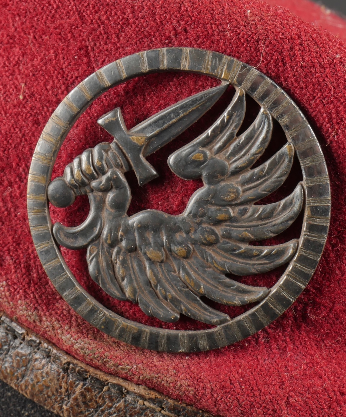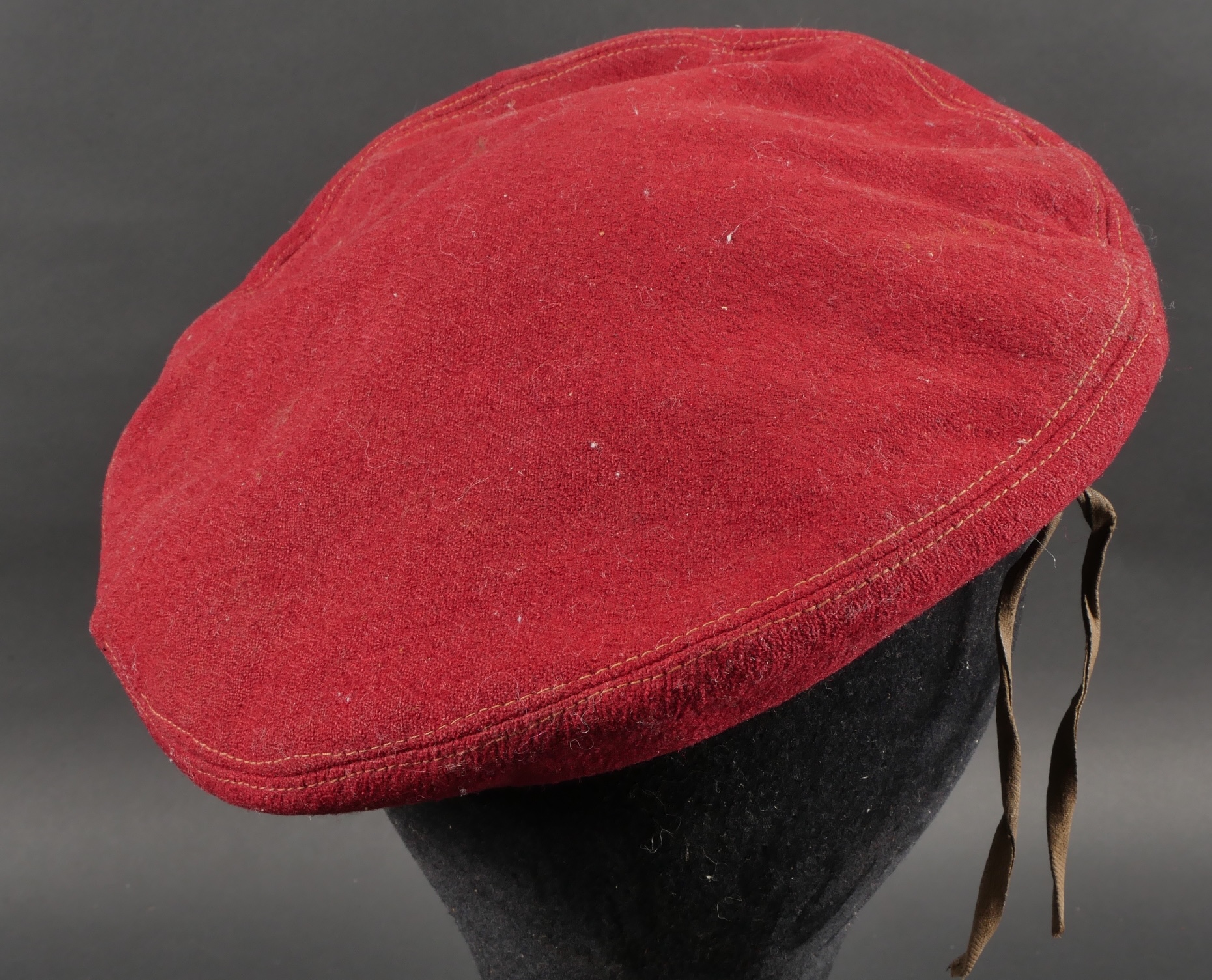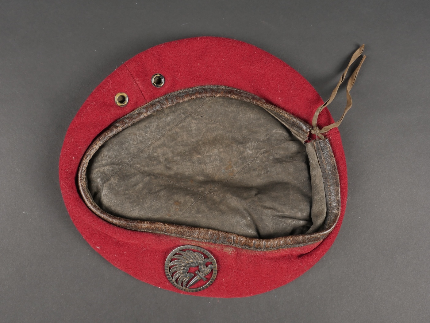 Béret parachutiste type Commando, confectionné par un tailleur en 3 parties. Doublure en coton noir, coutures en forme de losanges. 2 œillets portants encore leur peinture d’époque.... en savoir plus