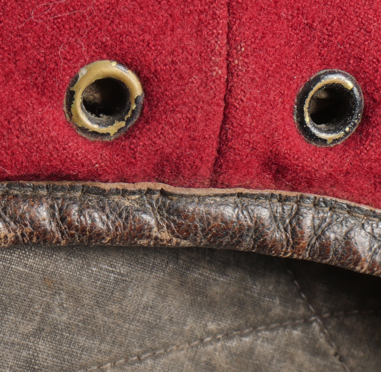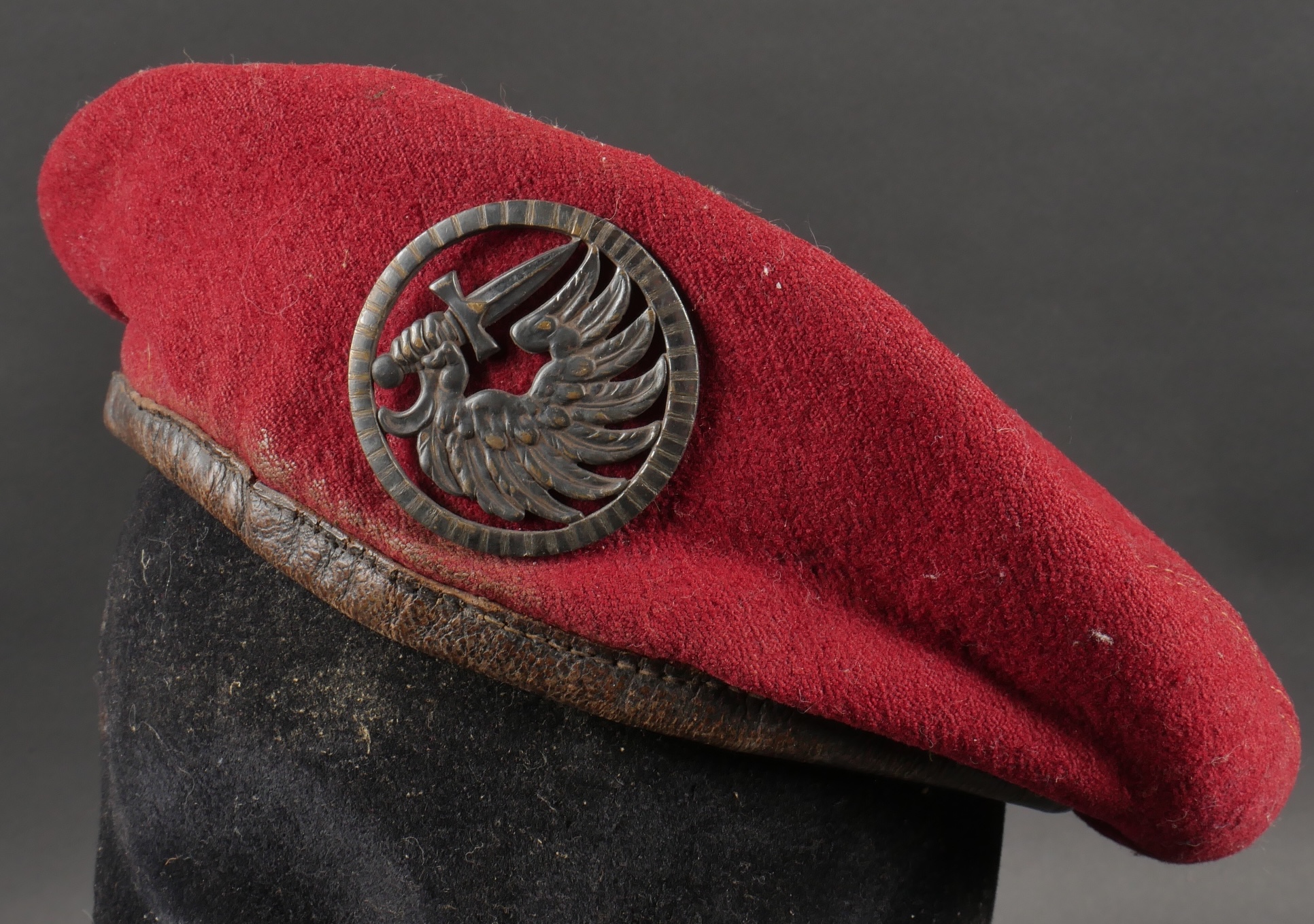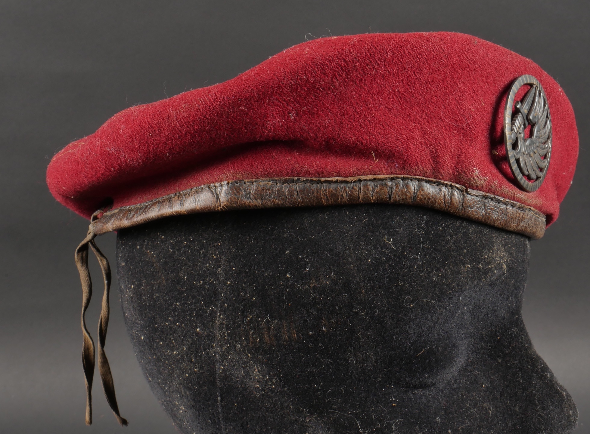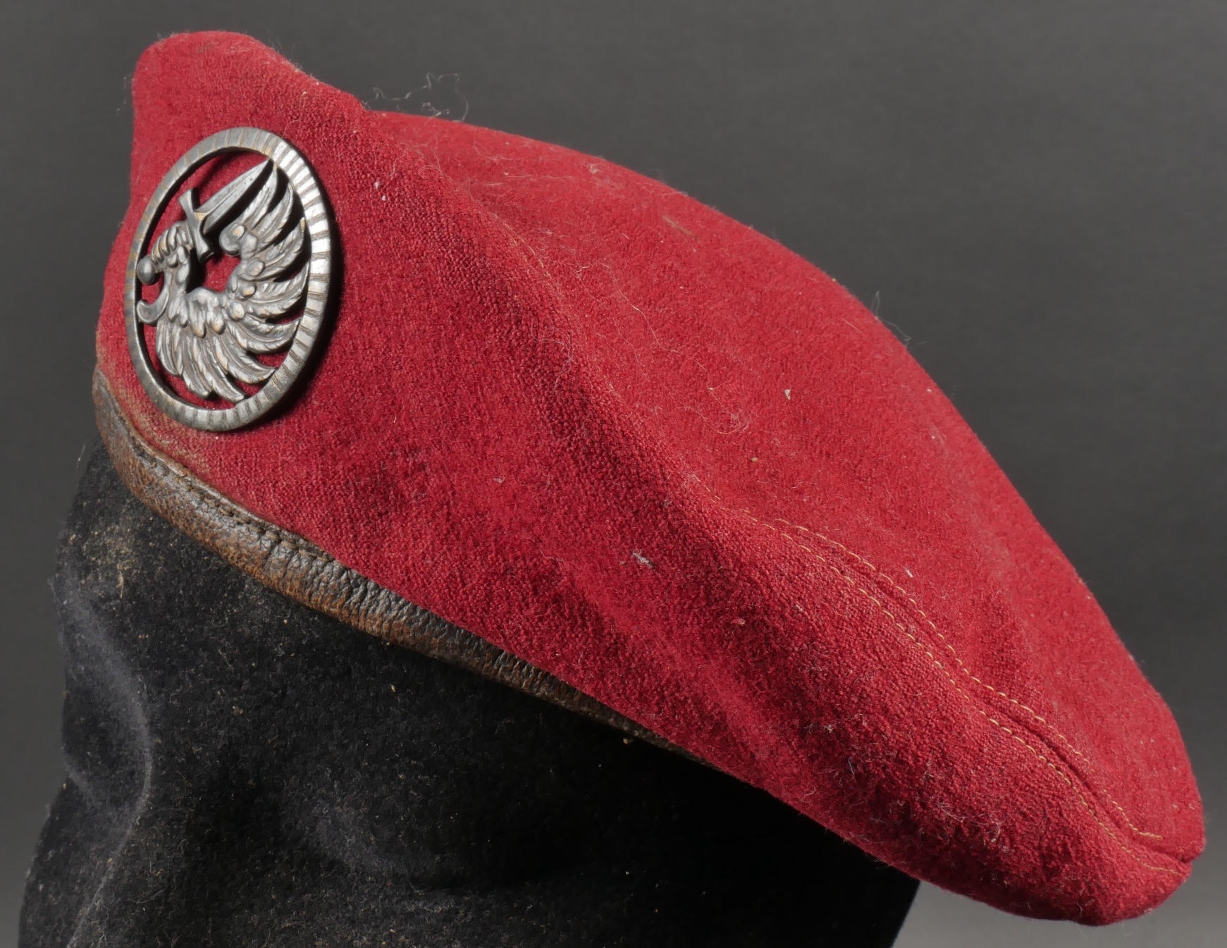 Béret parachutiste type Commando, confectionné par un tailleur en 3 parties. Doublure en coton noir, coutures en forme de losanges. 2 œillets portants encore leur peinture d’époque.... en savoir plus