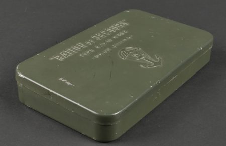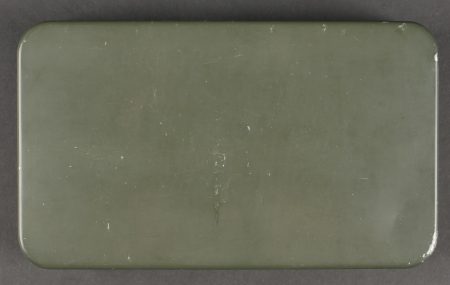 Boîte de ration type FOM102. Ration individuelle de combat en fer blanc, vide, peinture à 95%. Couvercle bien marqué Ration de secours type FOM 102, 2 jours ainsi qu’un parachute... en savoir plus