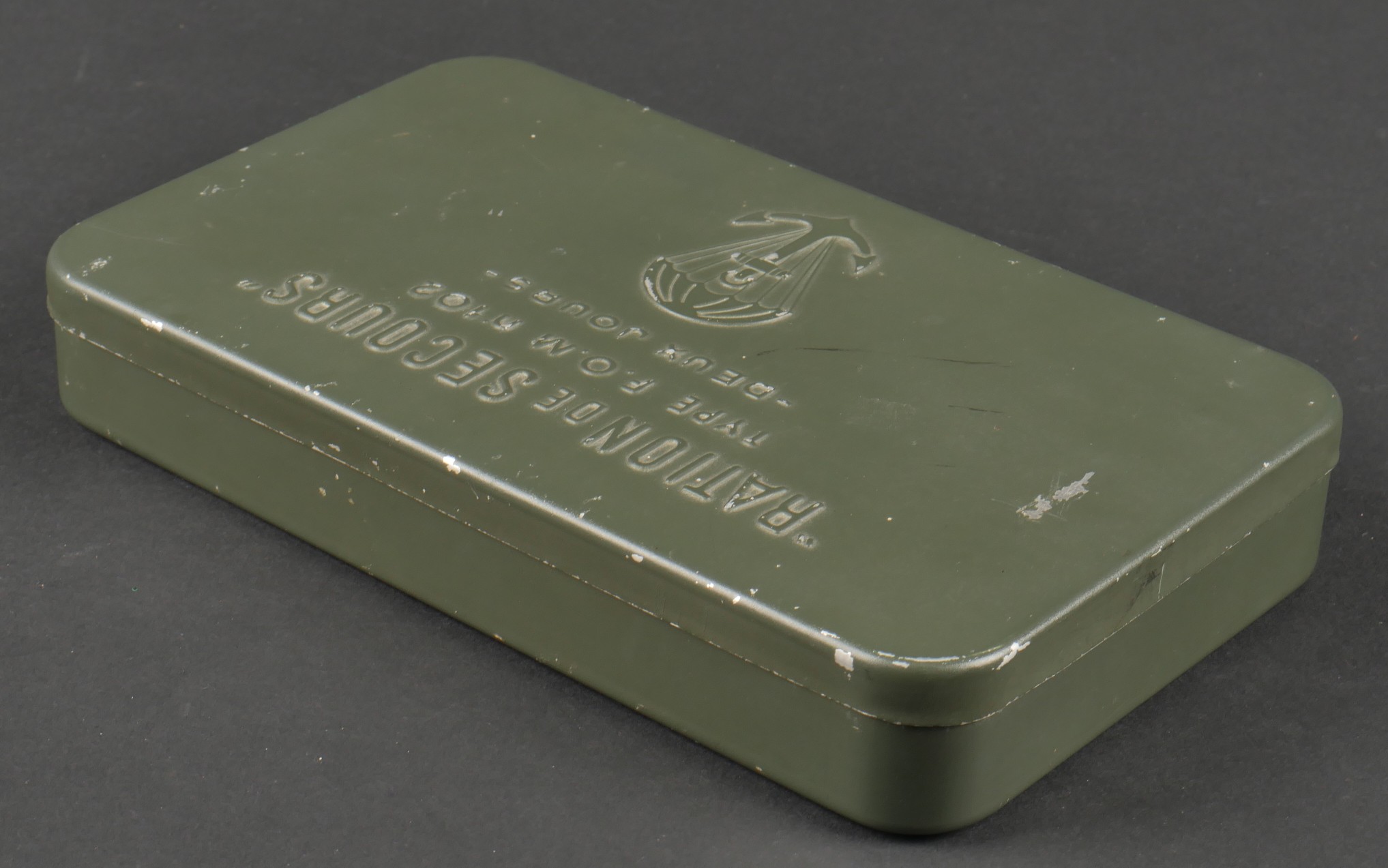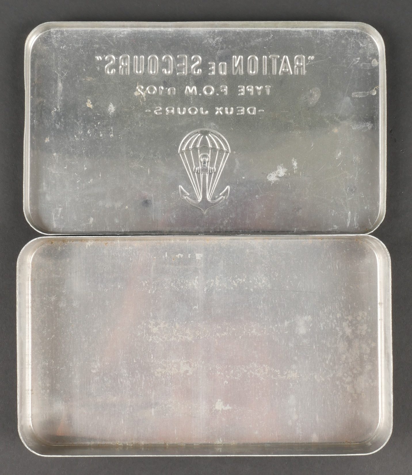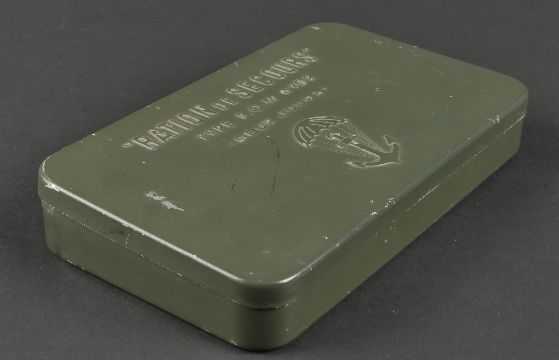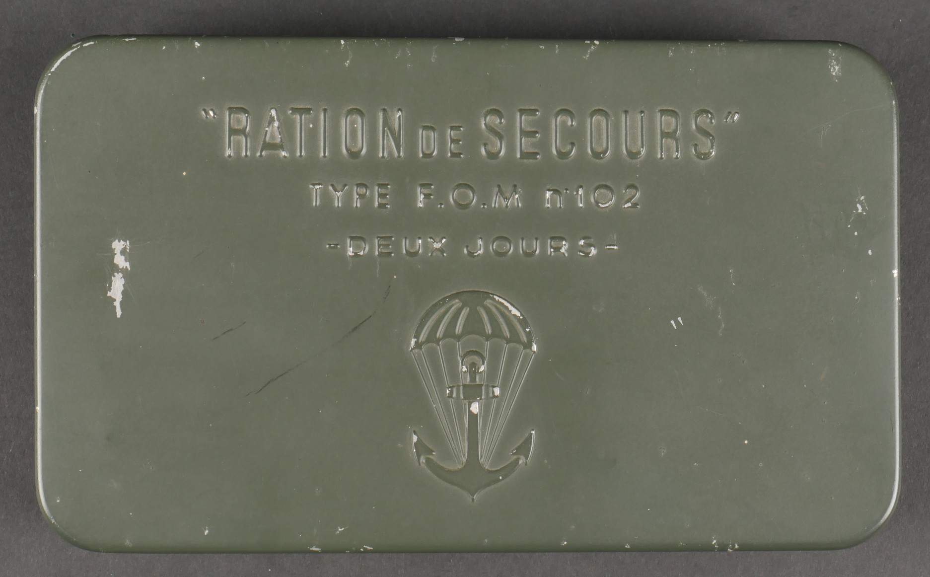 Boîte de ration type FOM102. Ration individuelle de combat en fer blanc, vide, peinture à 95%. Couvercle bien marqué Ration de secours type FOM 102, 2 jours ainsi qu’un parachute... en savoir plus
