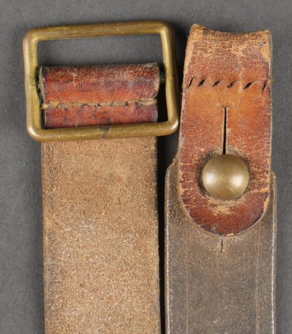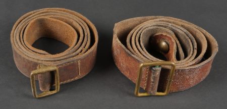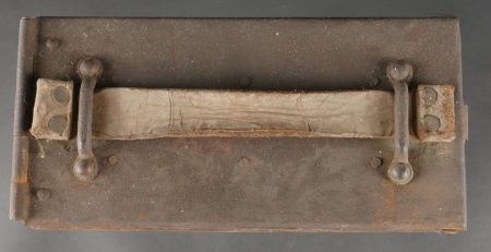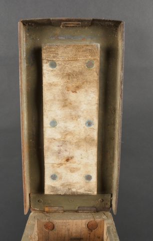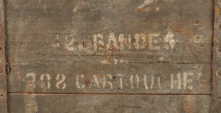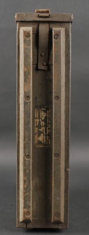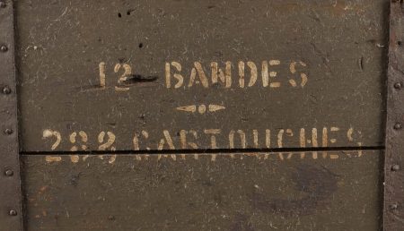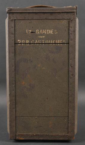 Boite Hotchkiss et bretelles. Comprenant une belle caisse à munitions pour bandes Hotchkiss, en bois, marquage 12 bandes 288 cartouches, peinture verte d’origine, avec ses poignées cuir,... en savoir plus