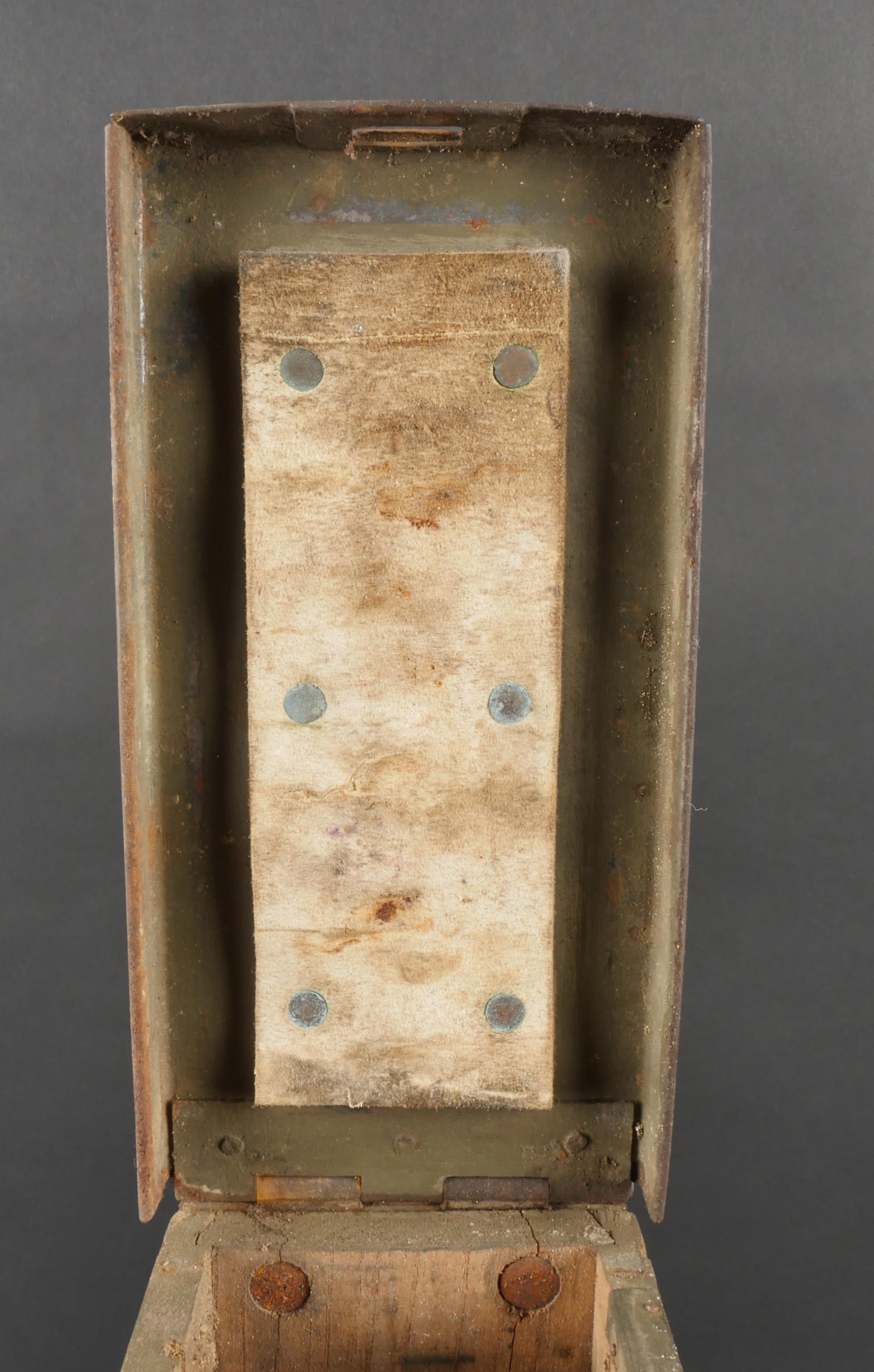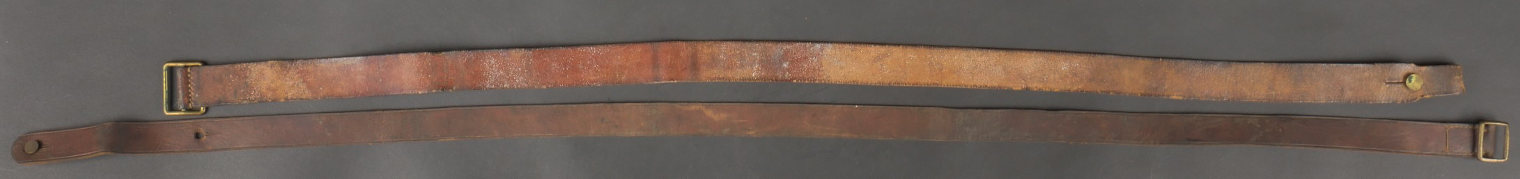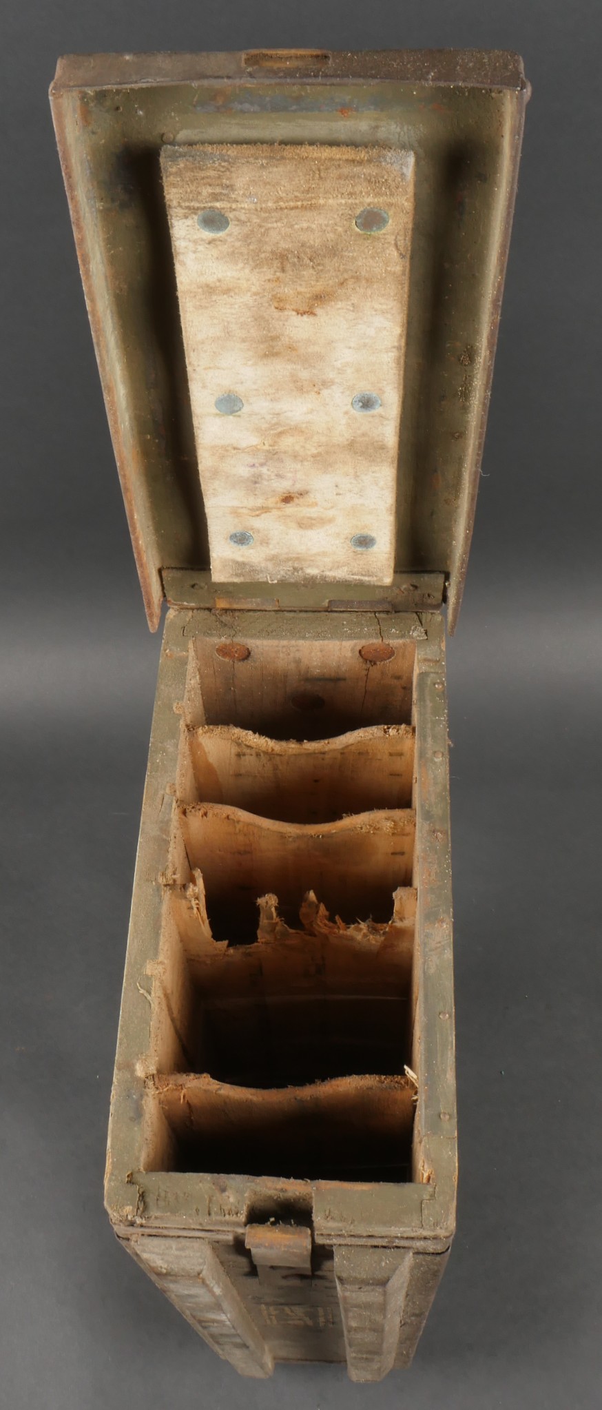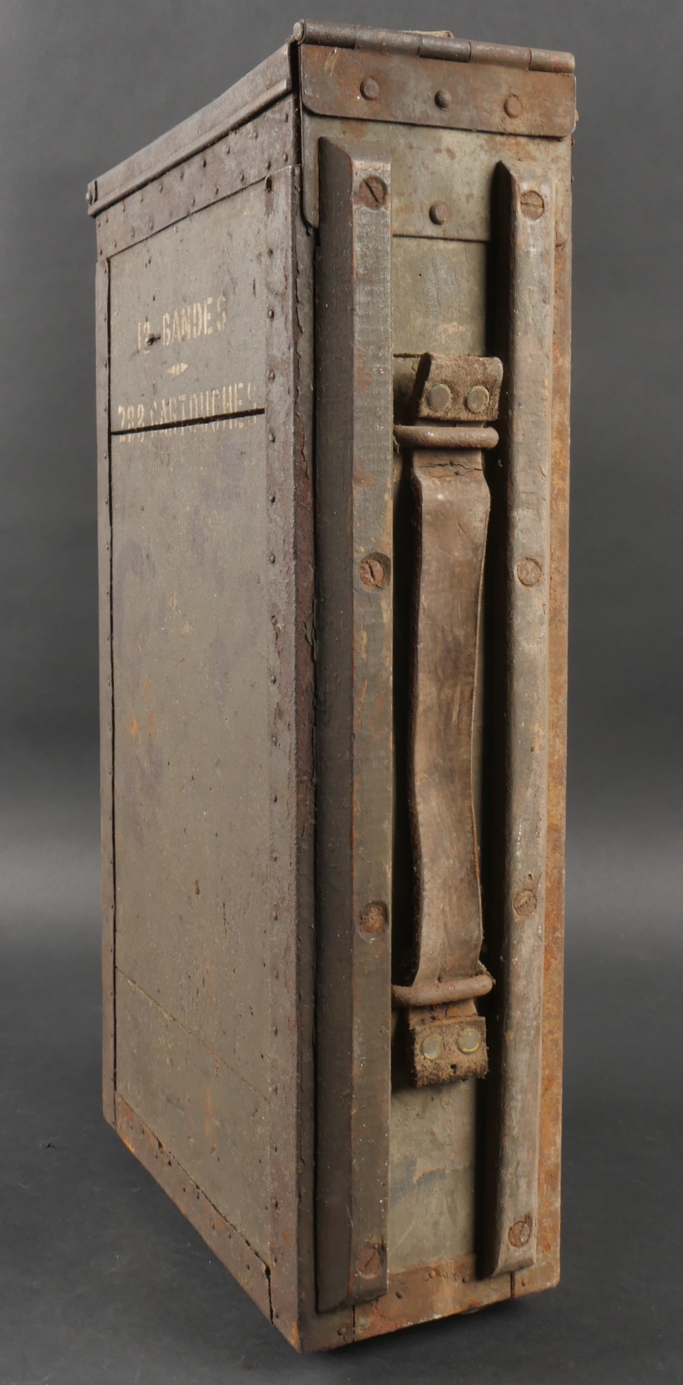 Boite Hotchkiss et bretelles. Comprenant une belle caisse à munitions pour bandes Hotchkiss, en bois, marquage 12 bandes 288 cartouches, peinture verte d’origine, avec ses poignées cuir,... en savoir plus