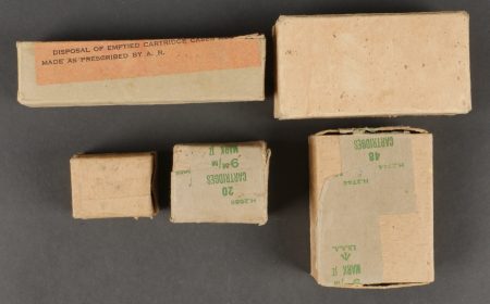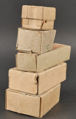 Boîtes de cartouches 9mm. Comprenant une boîte pour cartouches de revolver 380 datée 29 juin 1944, fabrication canadienne. Une boîte de 20 cartouches de fabrication anglaise. Une boîte de 48... en savoir plus