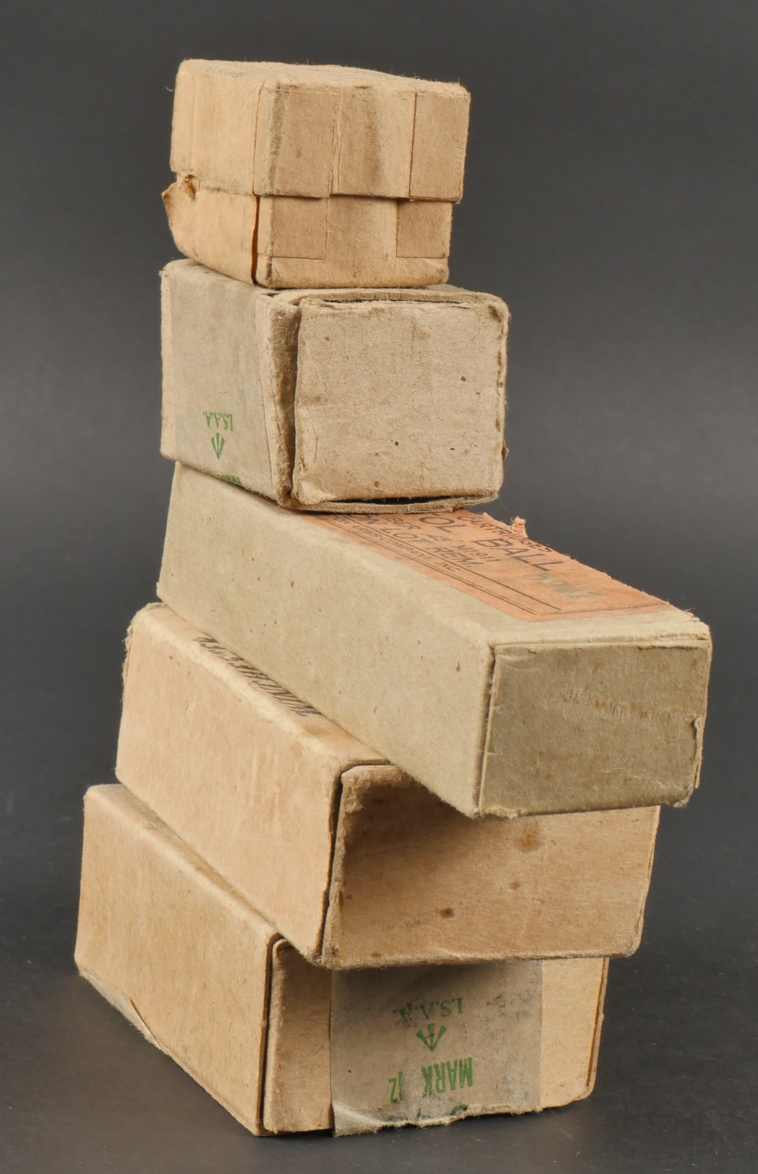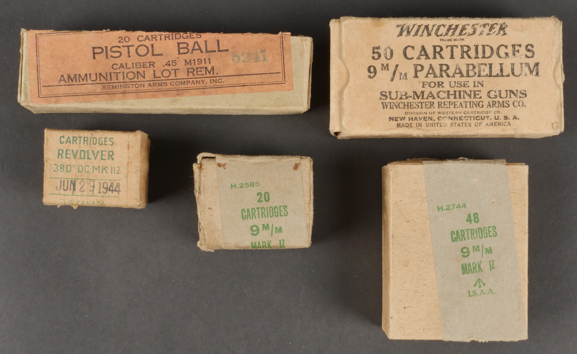 Boîtes de cartouches 9mm. Comprenant une boîte pour cartouches de revolver 380 datée 29 juin 1944, fabrication canadienne. Une boîte de 20 cartouches de fabrication anglaise. Une boîte de 48... en savoir plus