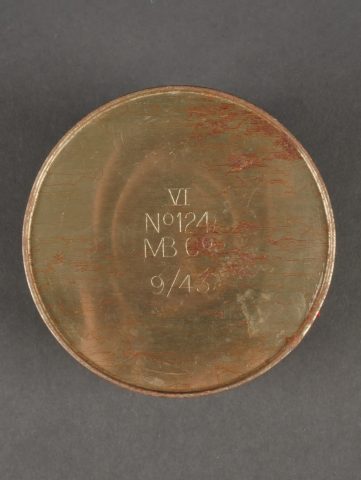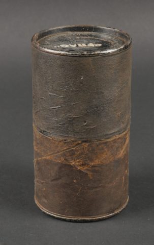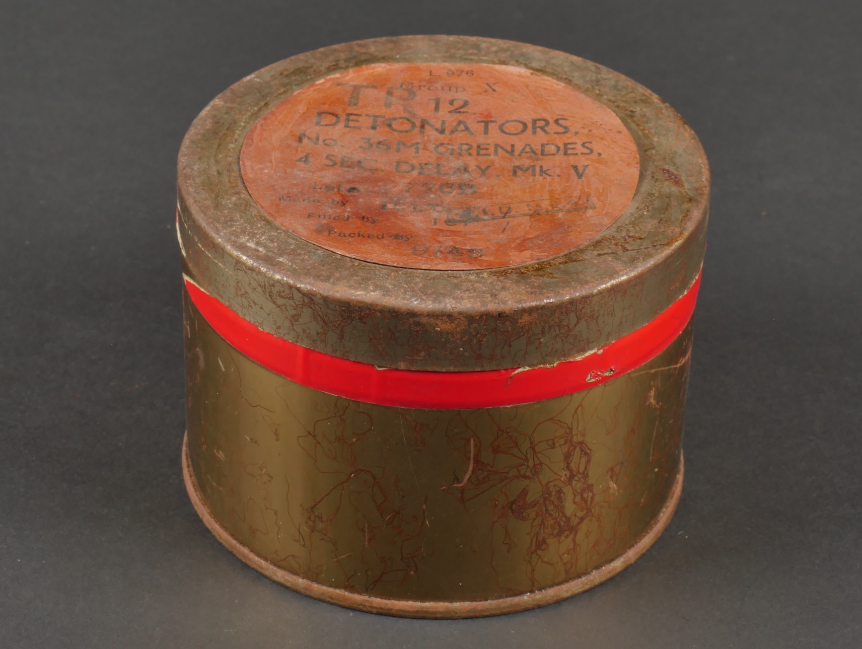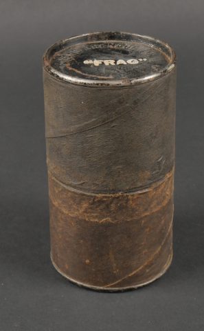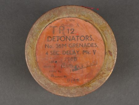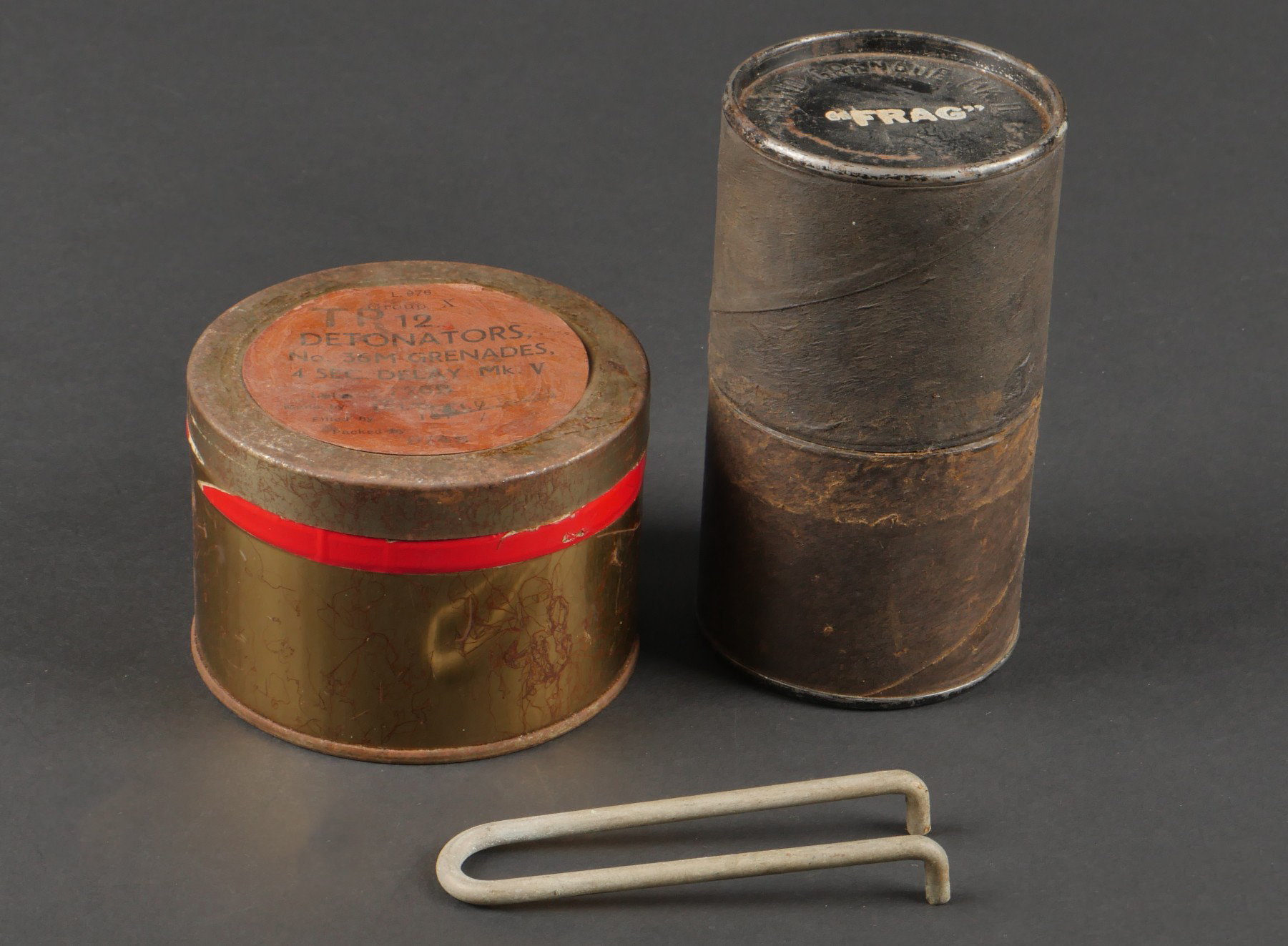 Boîtes de détonateurs. Comprenant une boîte en métal ronde à couvercle amovible destinée à recevoir 12 détonateurs de grenades modèle 1936, étiquette sur le couvercle d’origine datée 943, papier de contrôle à l’intérieur avec la même date, frappée au fond VI 124 943. Une clé de démontage pour grenade Mills. Un container en carton pour grenade Mk2 US, bien marqué Frag à la peinture blanche aux deux extrémités. Detonator boxes. A round metal box with removable lid for 12 grenade detonators model 1936 with original label on the lid dated 943 and an internal inspection slip with the same date stamped VI 124 943 on the base. A Mills grenade disassembly key. A cardboard cylinder for US Mk2 grenade clearly marked Frag in white paint at both ends.