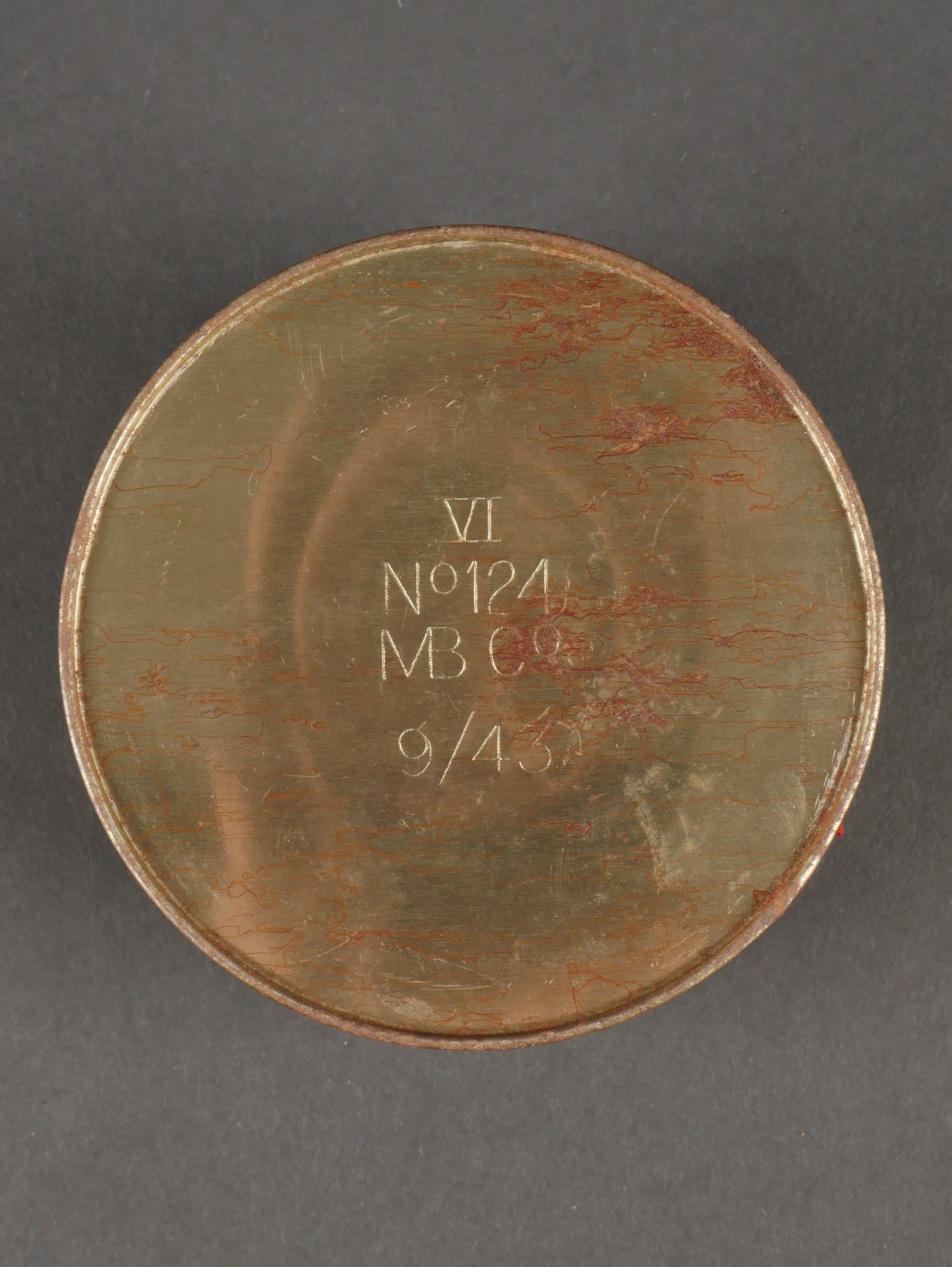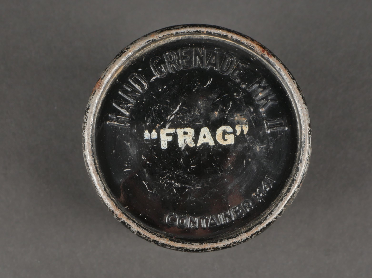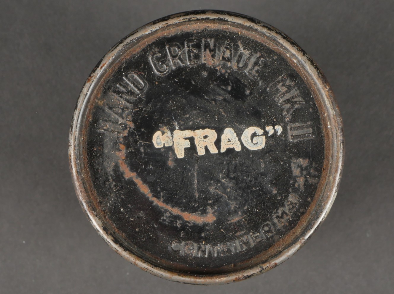 Boîtes de détonateurs. Comprenant une boîte en métal ronde à couvercle amovible destinée à recevoir 12 détonateurs de grenades modèle 1936, étiquette sur le couvercle d’origine datée 943, papier de contrôle à l’intérieur avec la même date, frappée au fond VI 124 943. Une clé de démontage pour grenade Mills. Un container en carton pour grenade Mk2 US, bien marqué Frag à la peinture blanche aux deux extrémités. Detonator boxes. A round metal box with removable lid for 12 grenade detonators model 1936 with original label on the lid dated 943 and an internal inspection slip with the same date stamped VI 124 943 on the base. A Mills grenade disassembly key. A cardboard cylinder for US Mk2 grenade clearly marked Frag in white paint at both ends.