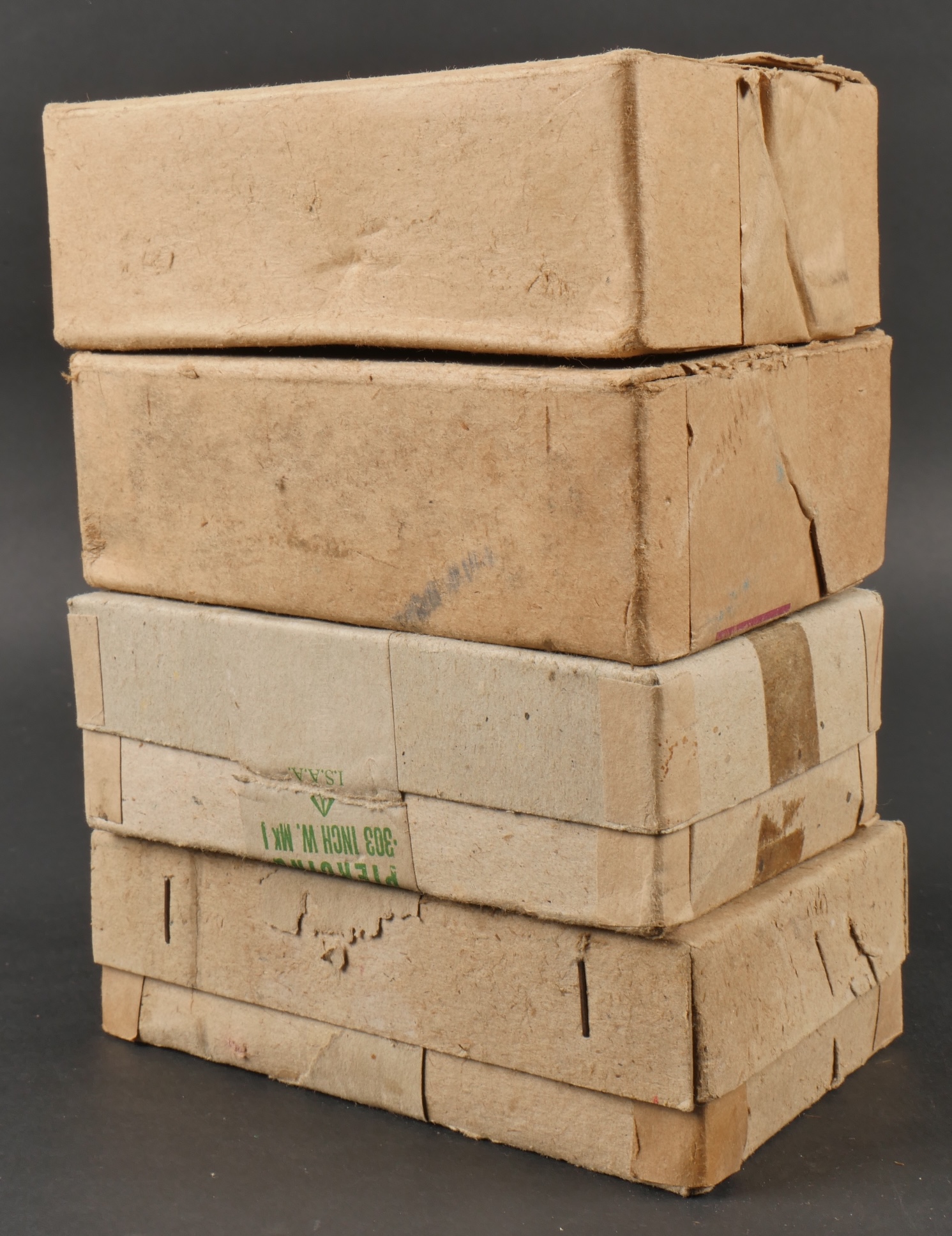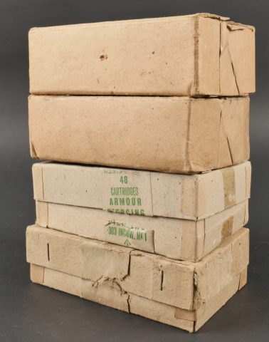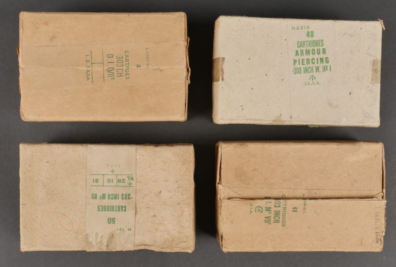 Boîtes de munitions de parachutage vides. Comprenant deux boîtes de 303 canadiennes dont une possède encore son papier de protection intérieur ainsi qu’un marquage au tampon 1MK7. Deux... en savoir plus