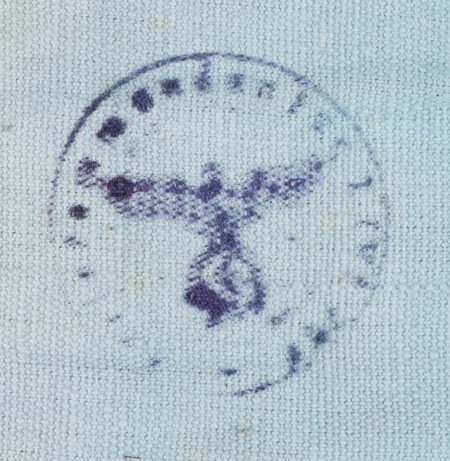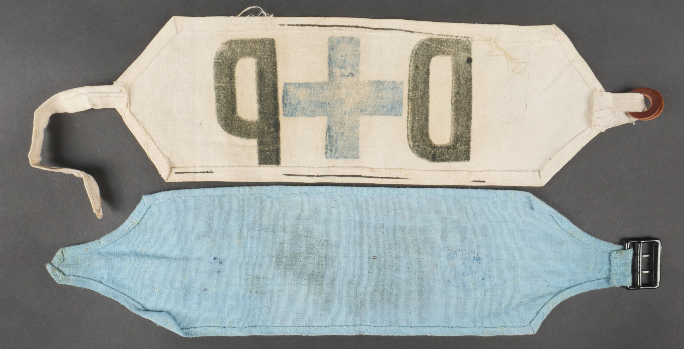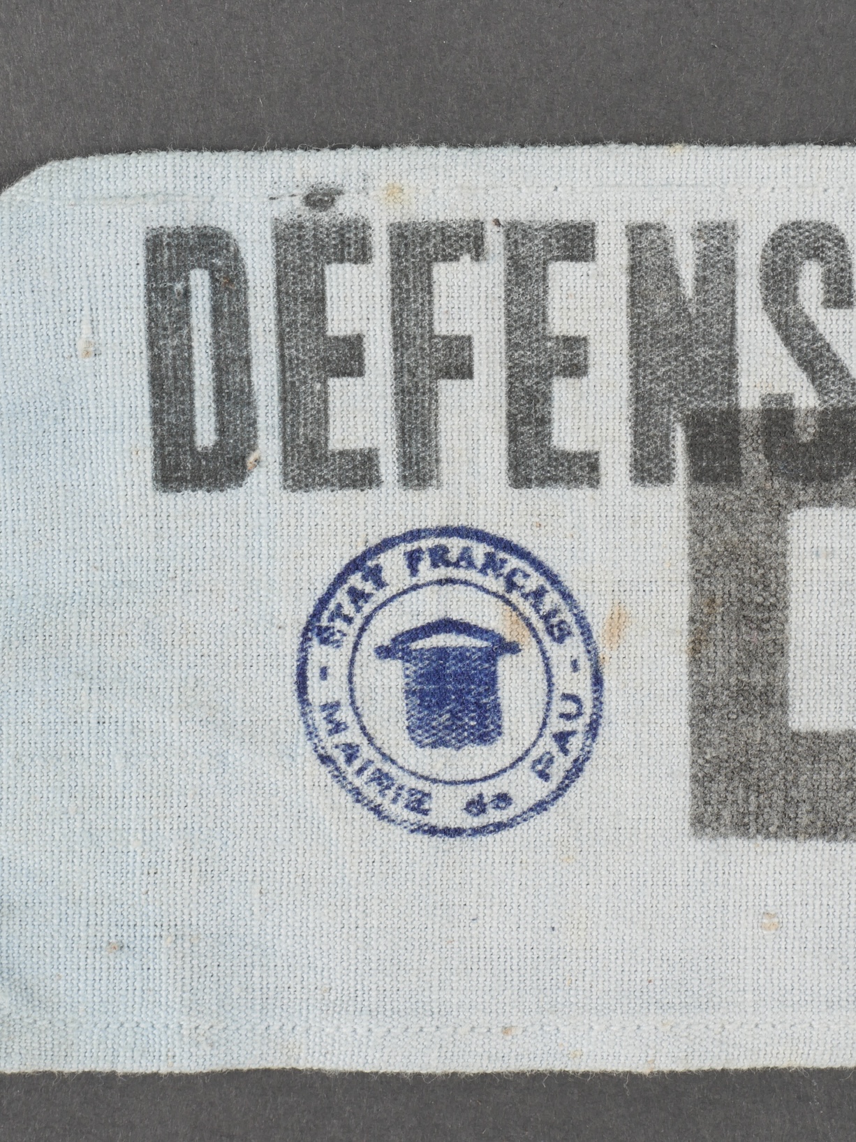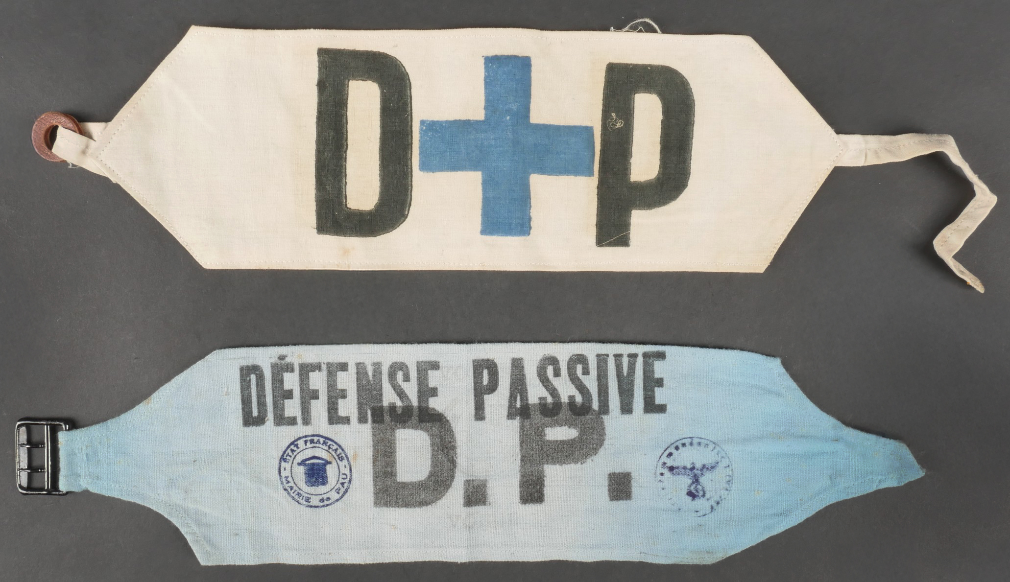 Brassards Défense Passive. Comprenant un brassard en coton bleu tamponné Etat Français mairie de Pau, on distingue également un tampon de la voirie. Un brassard en coton écru marqué DP à la... en savoir plus