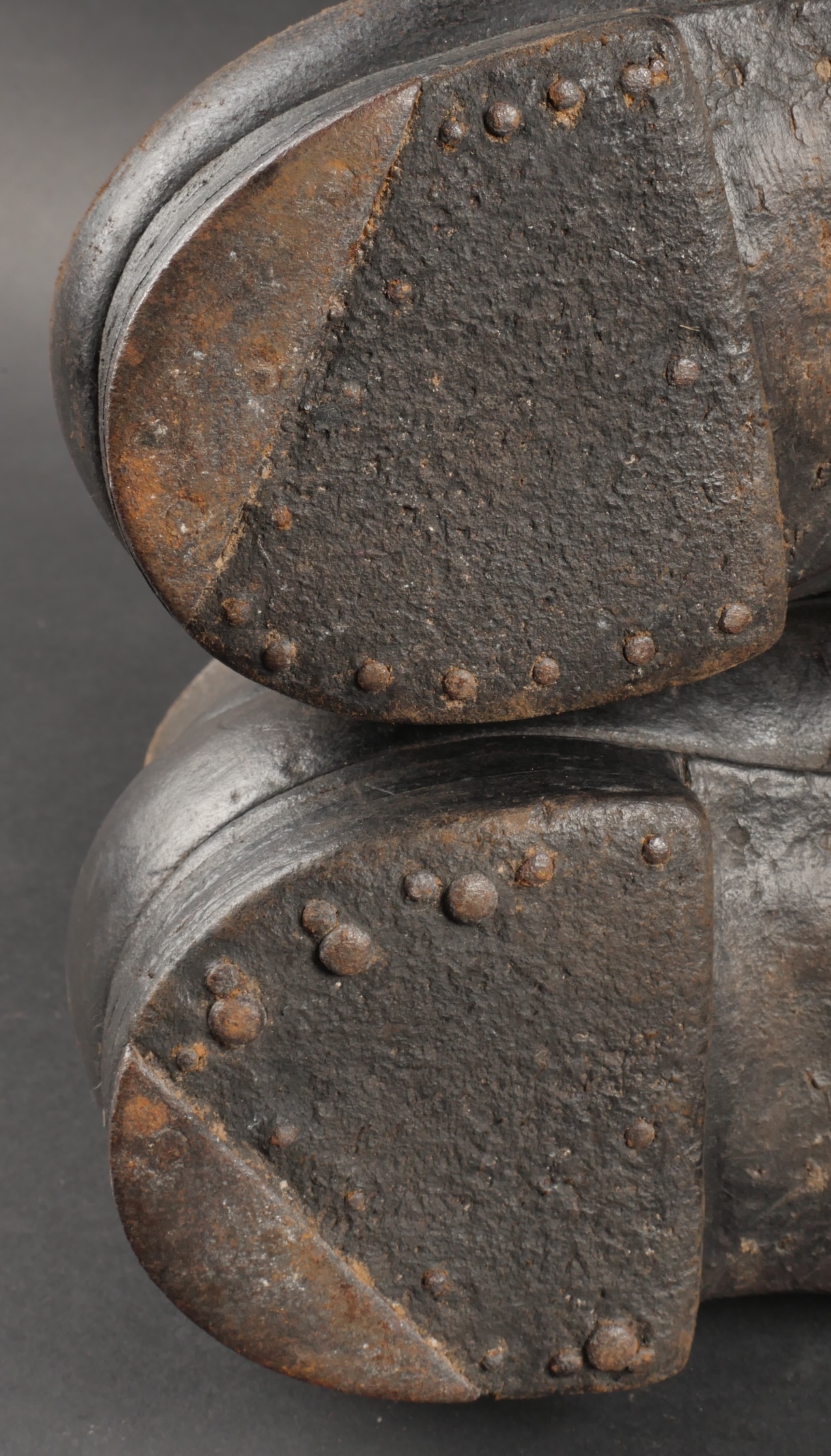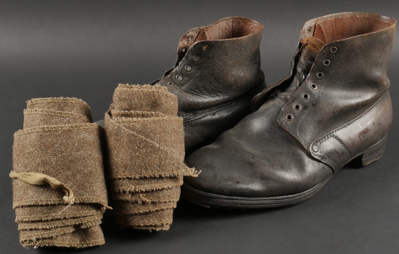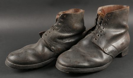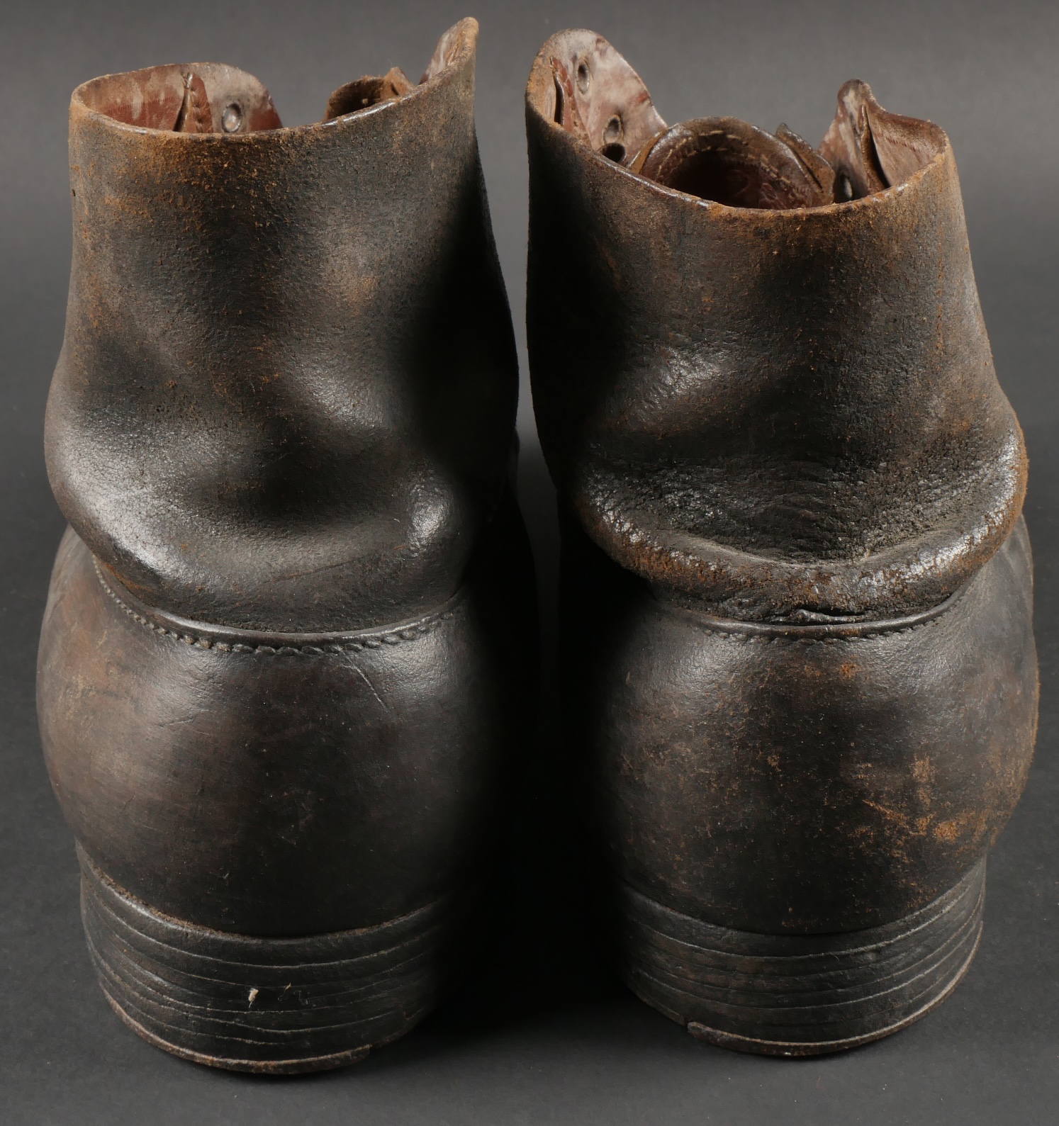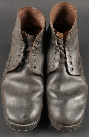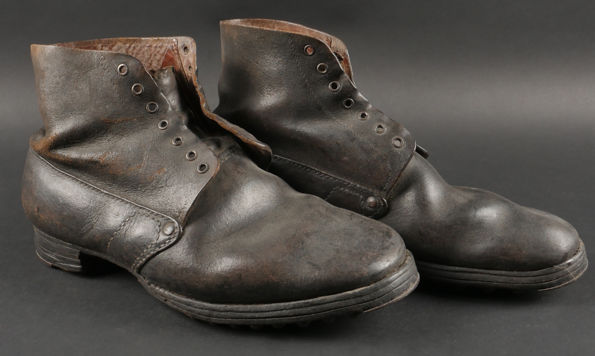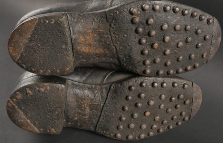 Brodequins 1917. En cuir marron, rivets de renfort sur chaque brodequin, tous les œillets sont présents. Sur les semelles intérieures est lisible la taille 284 ainsi que le fabricant Viala à... en savoir plus