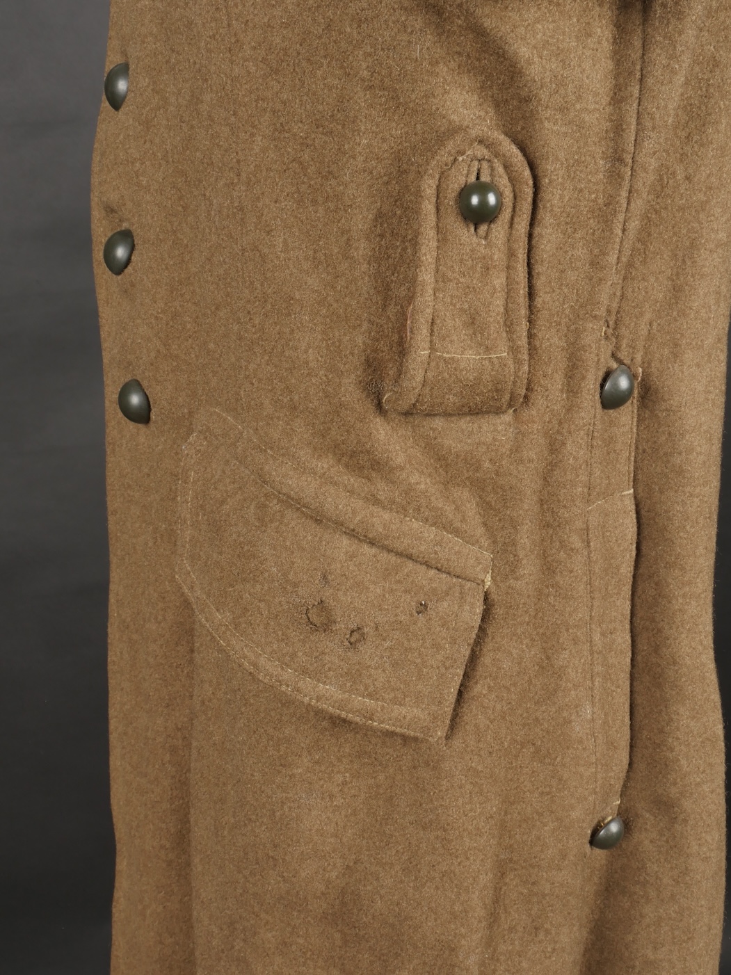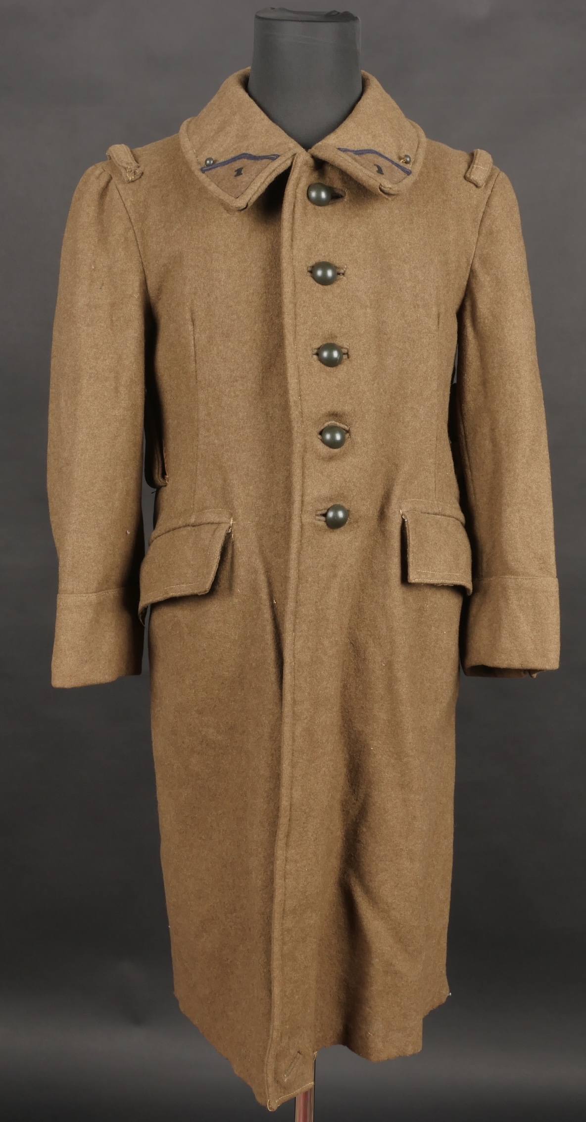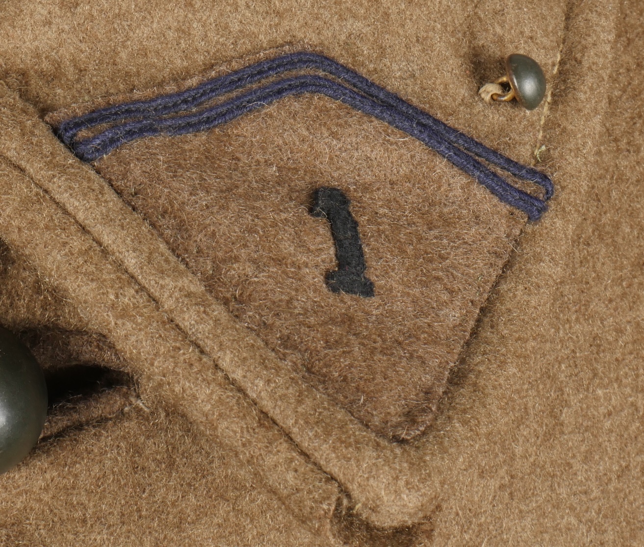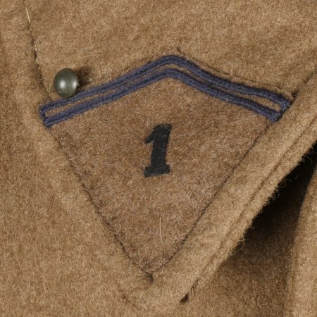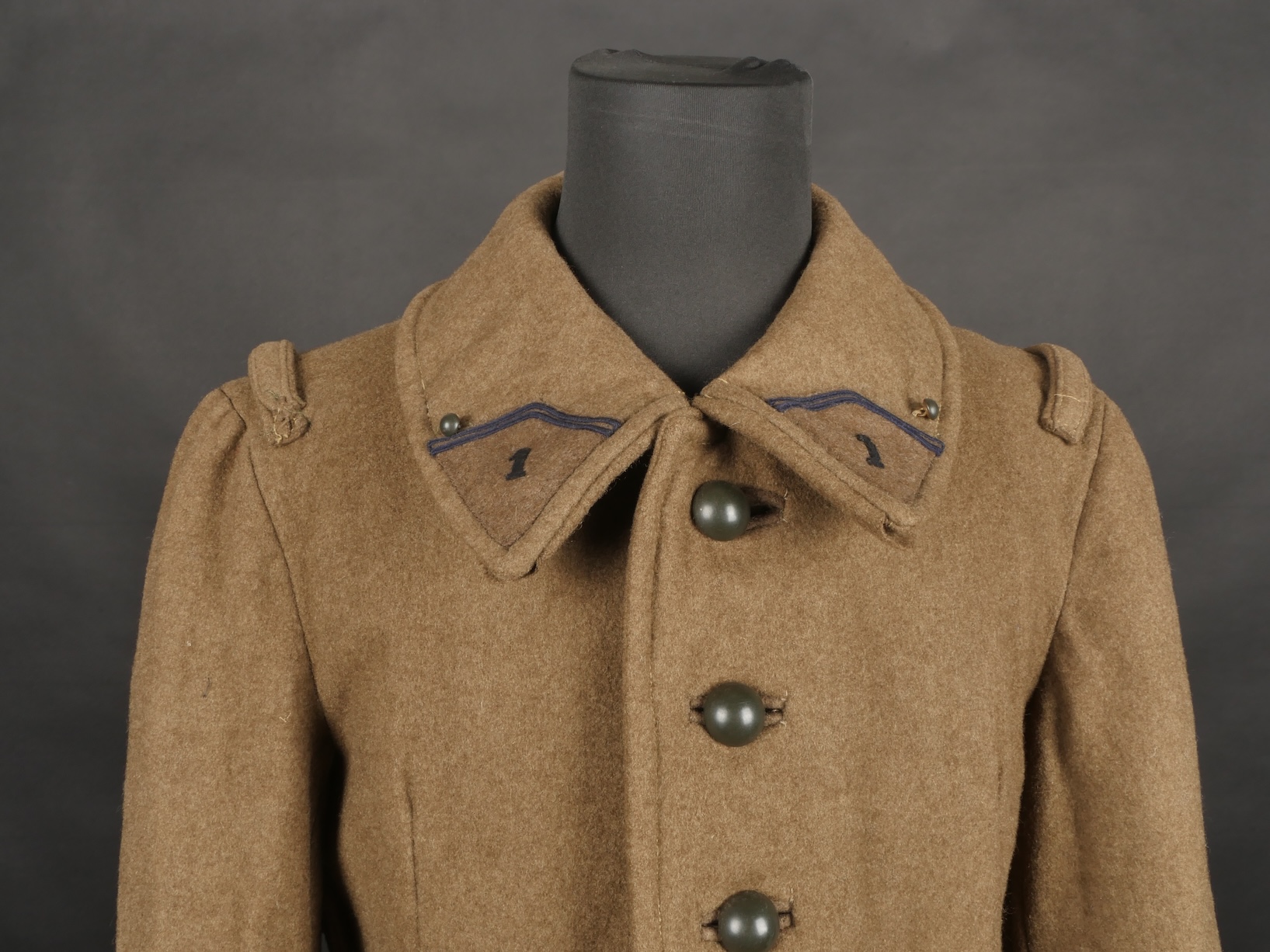 Capote 1938 1er RI. En drap kaki et se fermant par cinq boutons, pattes de col du 1er RI, chiffre bleu et deux soutaches bleues, volets de dissimulation cousus d’origine. Passants de... en savoir plus