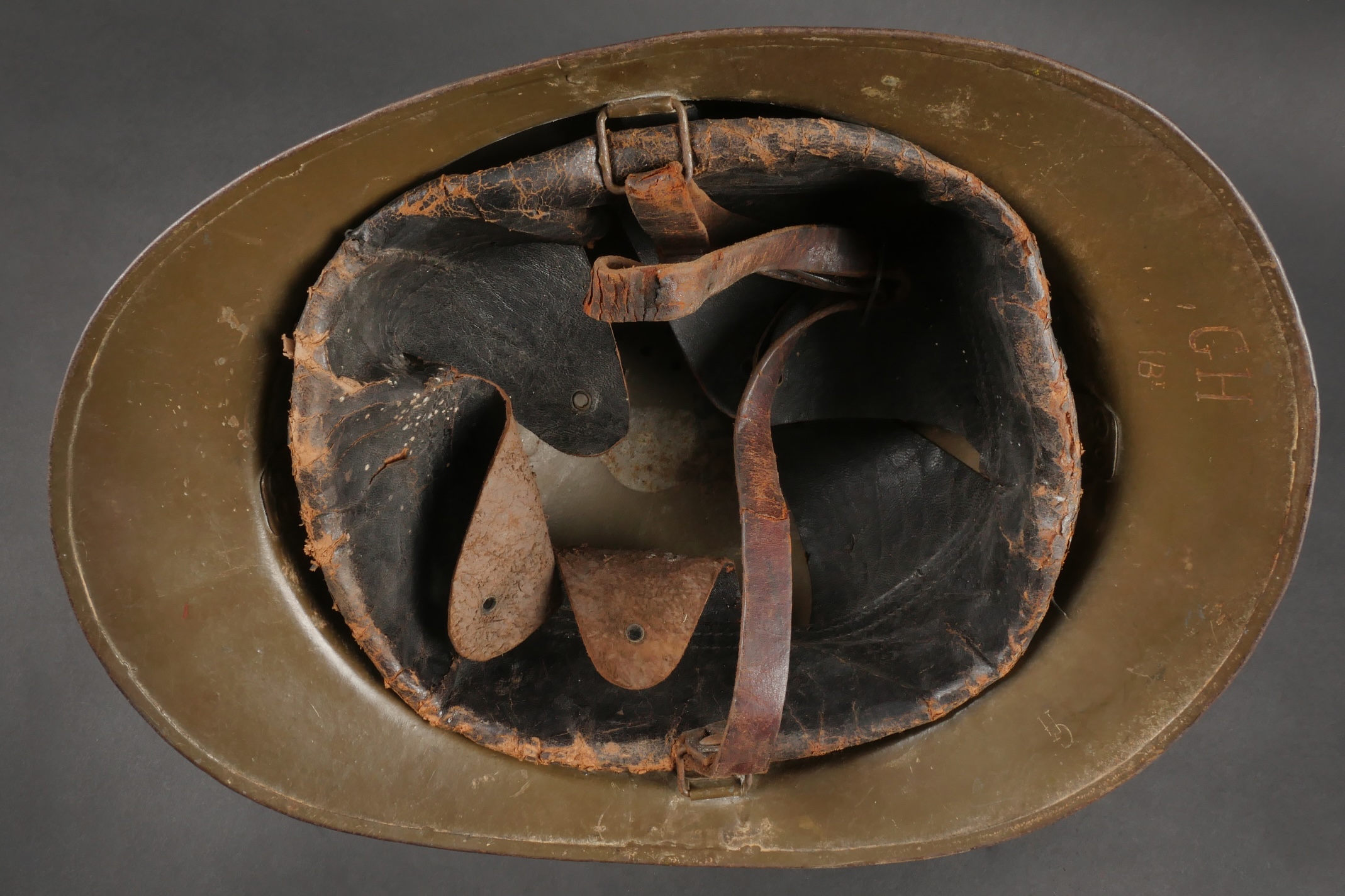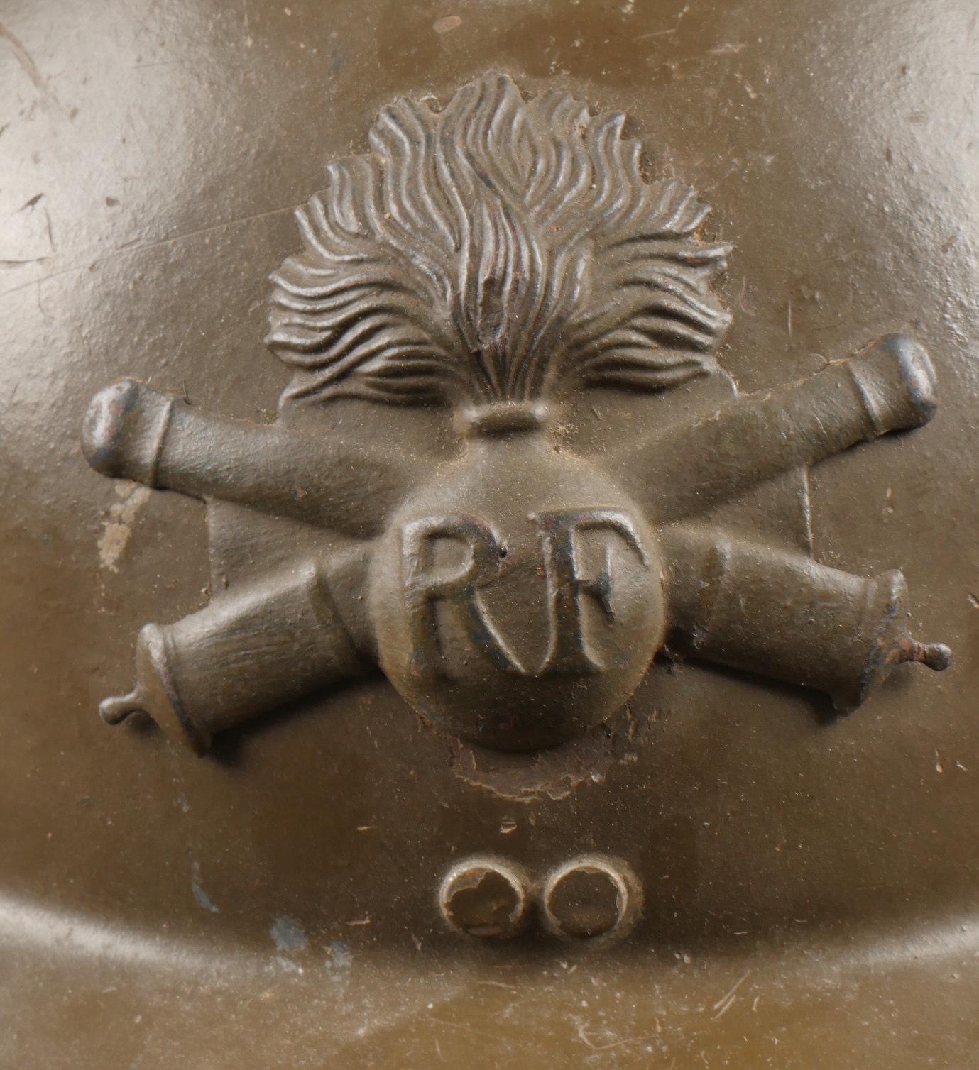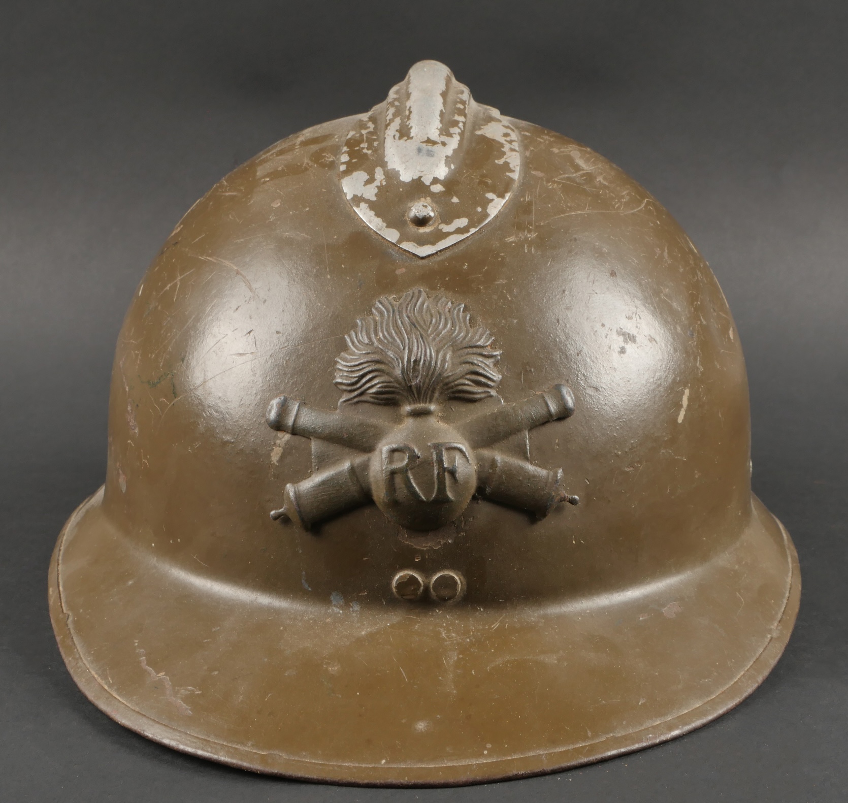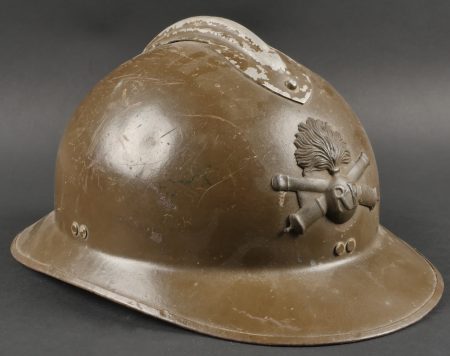 Casque Adrian 1926 artillerie. Modèle 1926, peinture kaki à 80%, attribut modèle 1915 de l’artillerie. Cimier en aluminium avec 50% de sa peinture. Coiffe en cuir à six dents de loup... en savoir plus