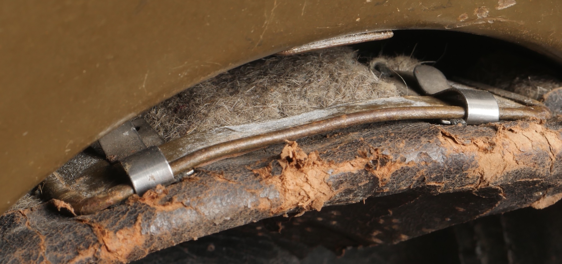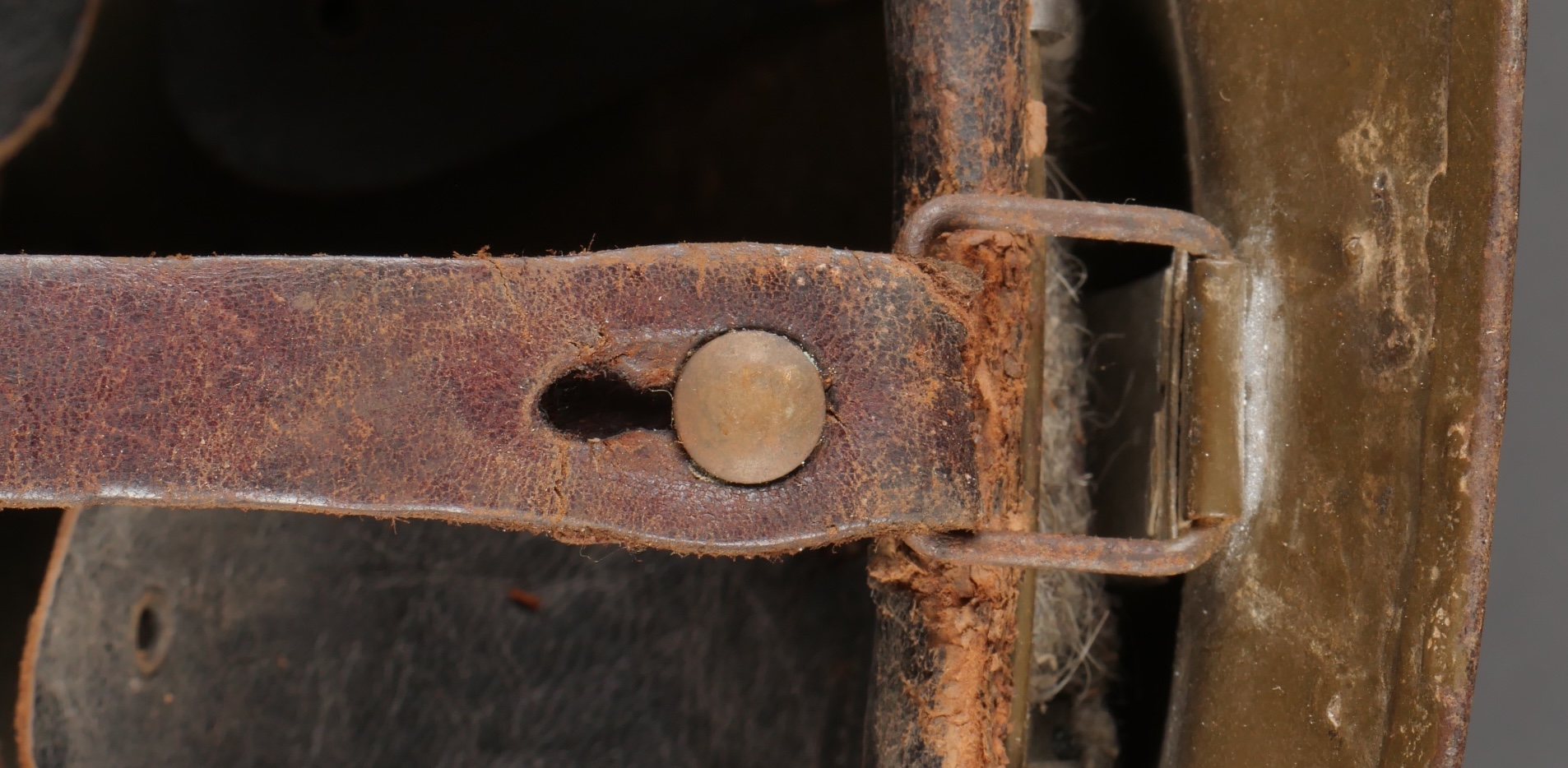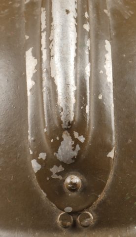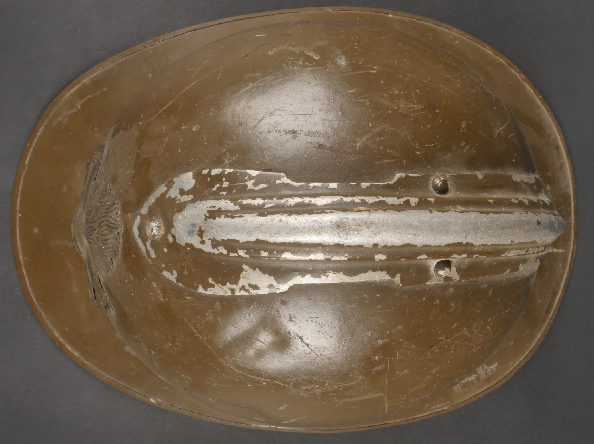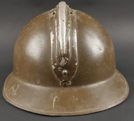 Casque Adrian 1926 artillerie. Modèle 1926, peinture kaki à 80%, attribut modèle 1915 de l’artillerie. Cimier en aluminium avec 50% de sa peinture. Coiffe en cuir à six dents de loup... en savoir plus