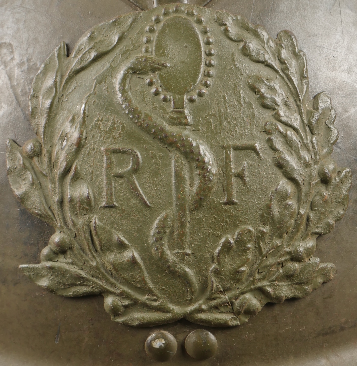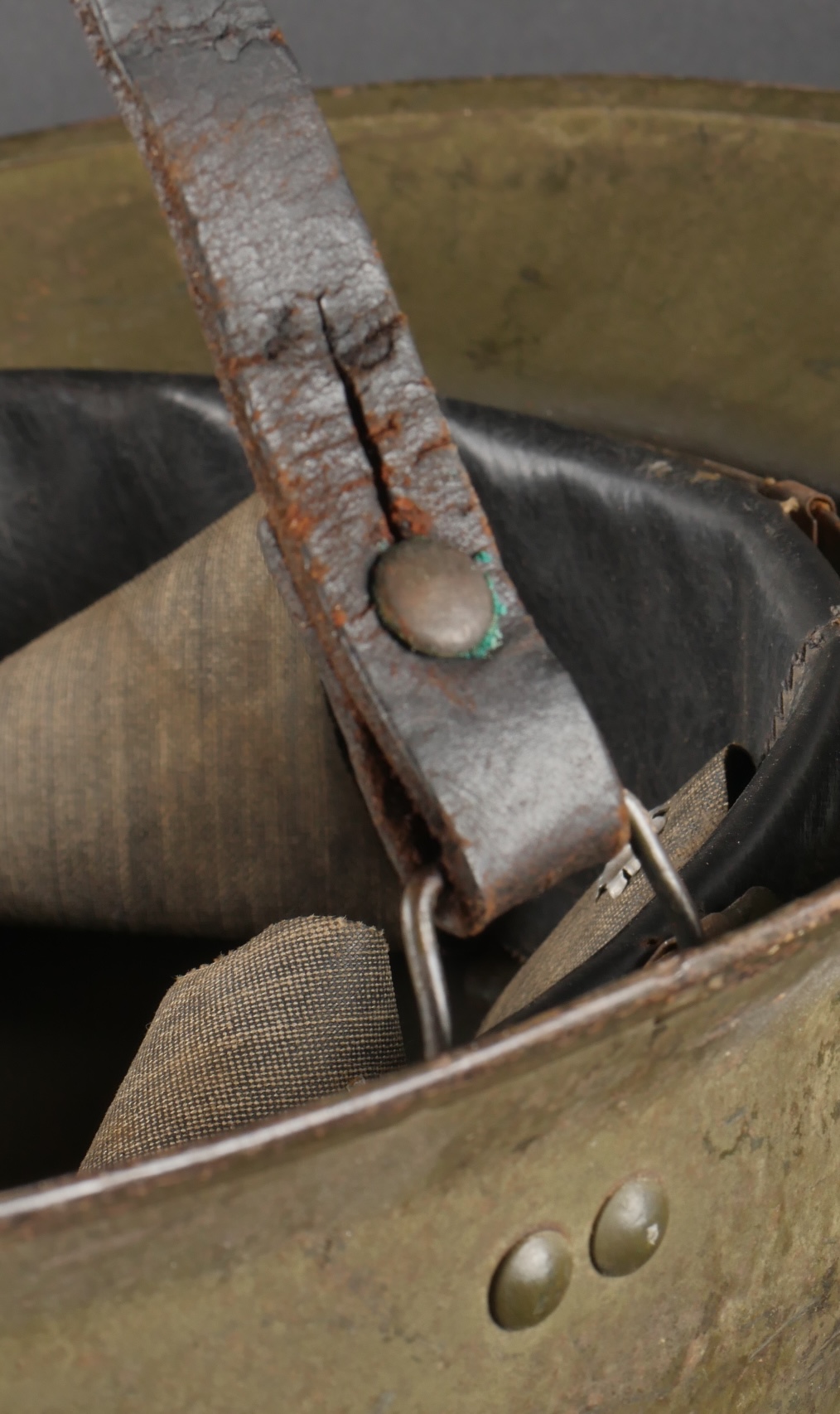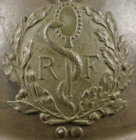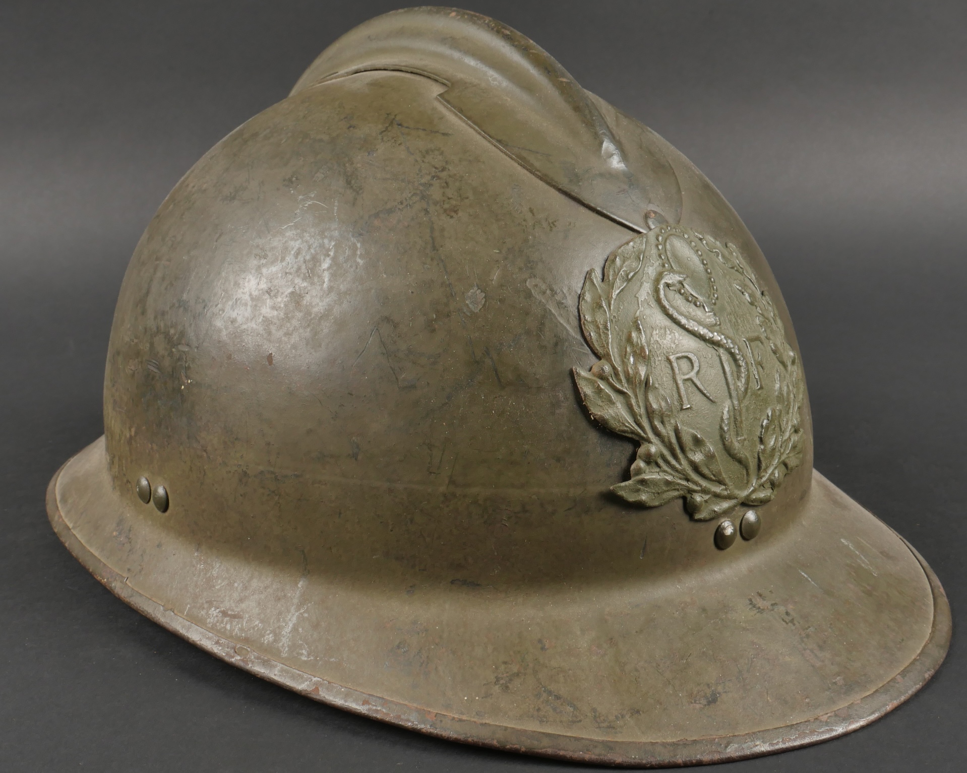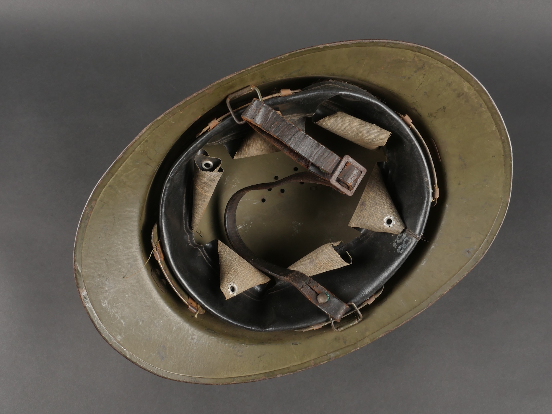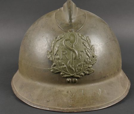 Casque Adrian 1926 service de santé. Modèle 1926, peinture kaki à 95%, attribut modèle 1915 en peinture kaki du service de santé. Coiffe à six dents de loup en toile cirée de type défense... en savoir plus