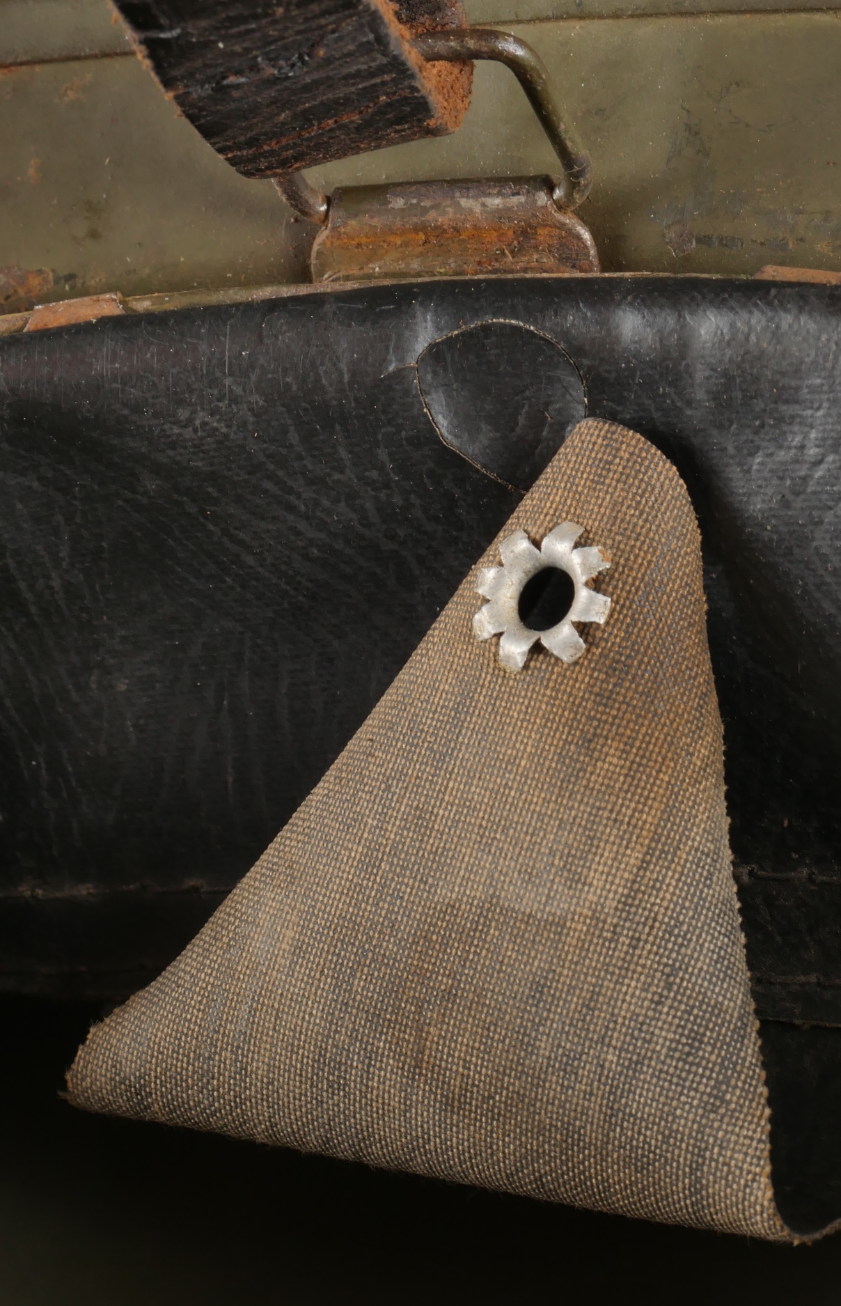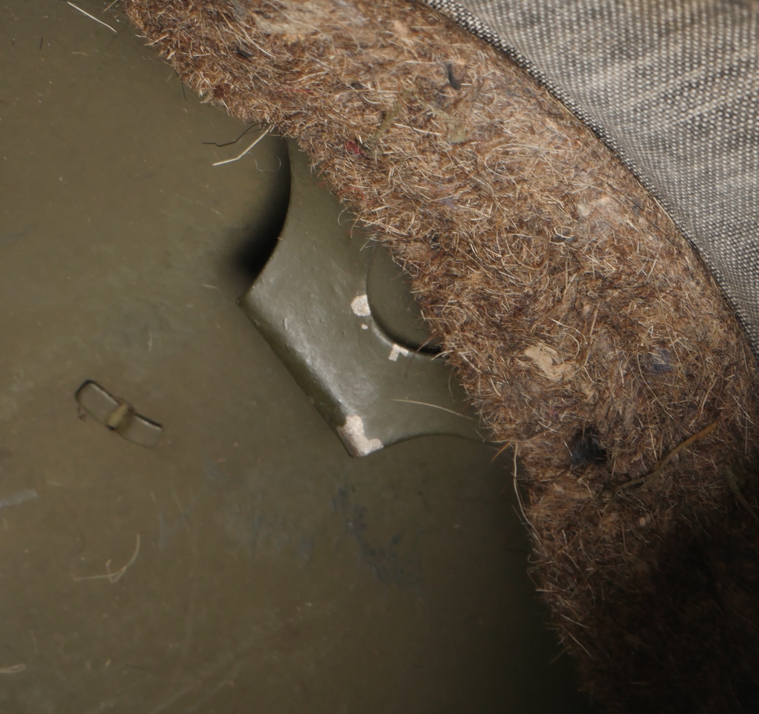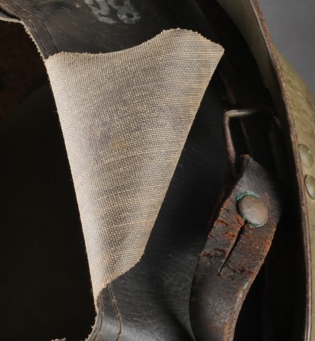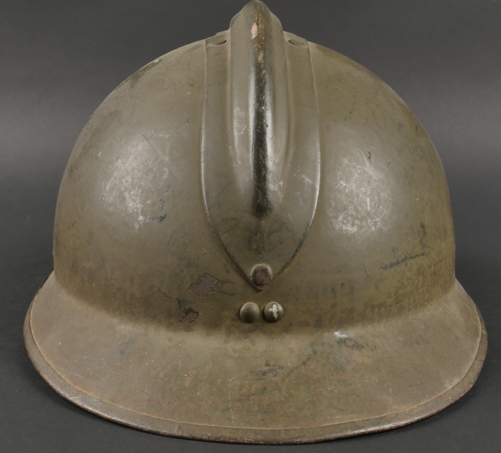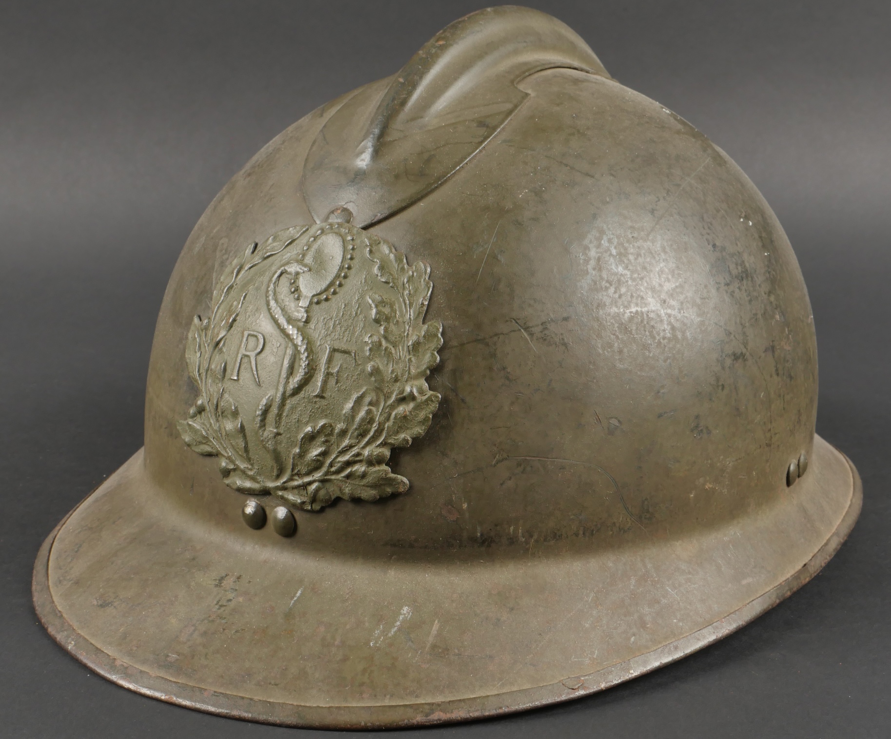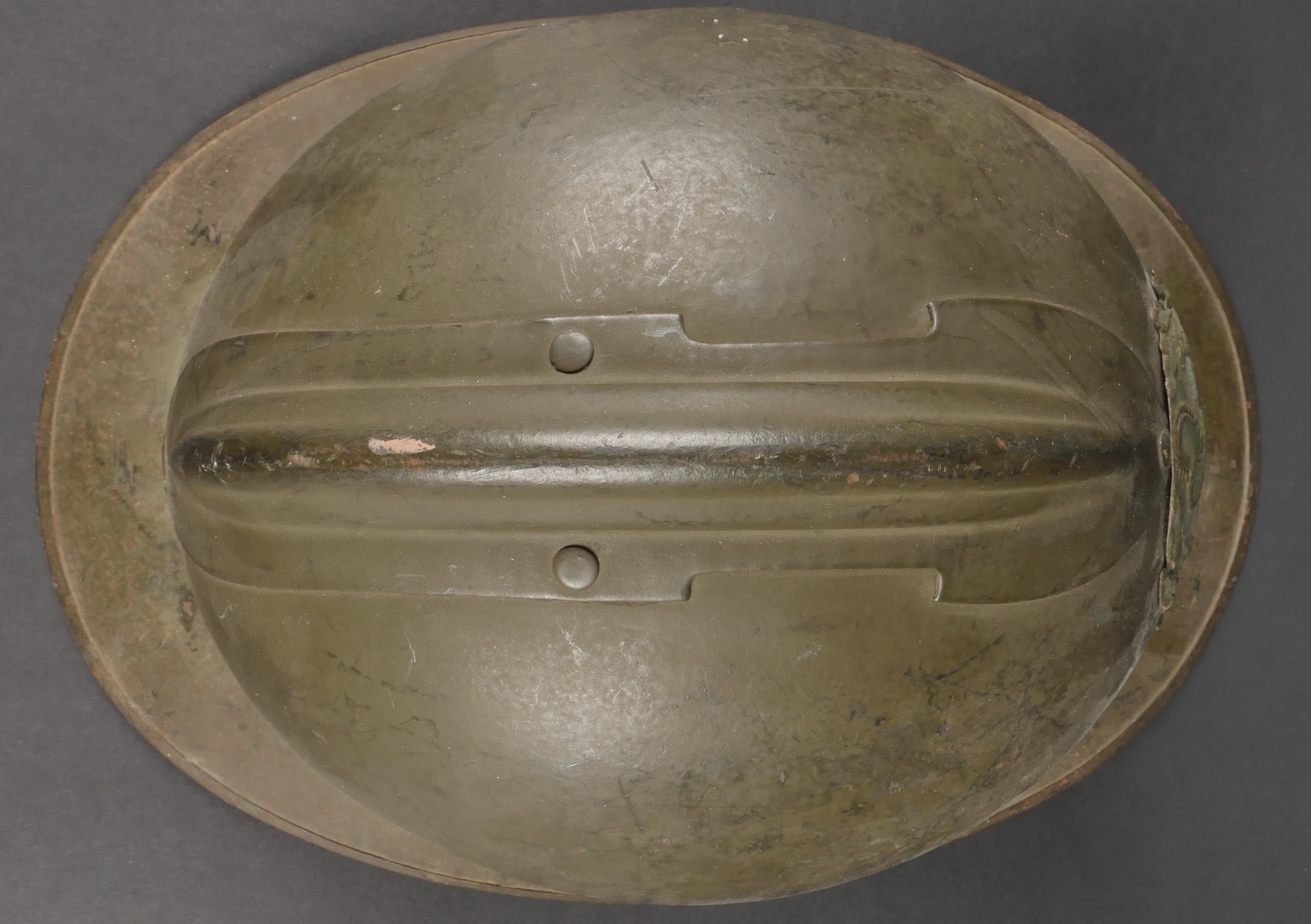 Casque Adrian 1926 service de santé. Modèle 1926, peinture kaki à 95%, attribut modèle 1915 en peinture kaki du service de santé. Coiffe à six dents de loup en toile cirée de type défense... en savoir plus
