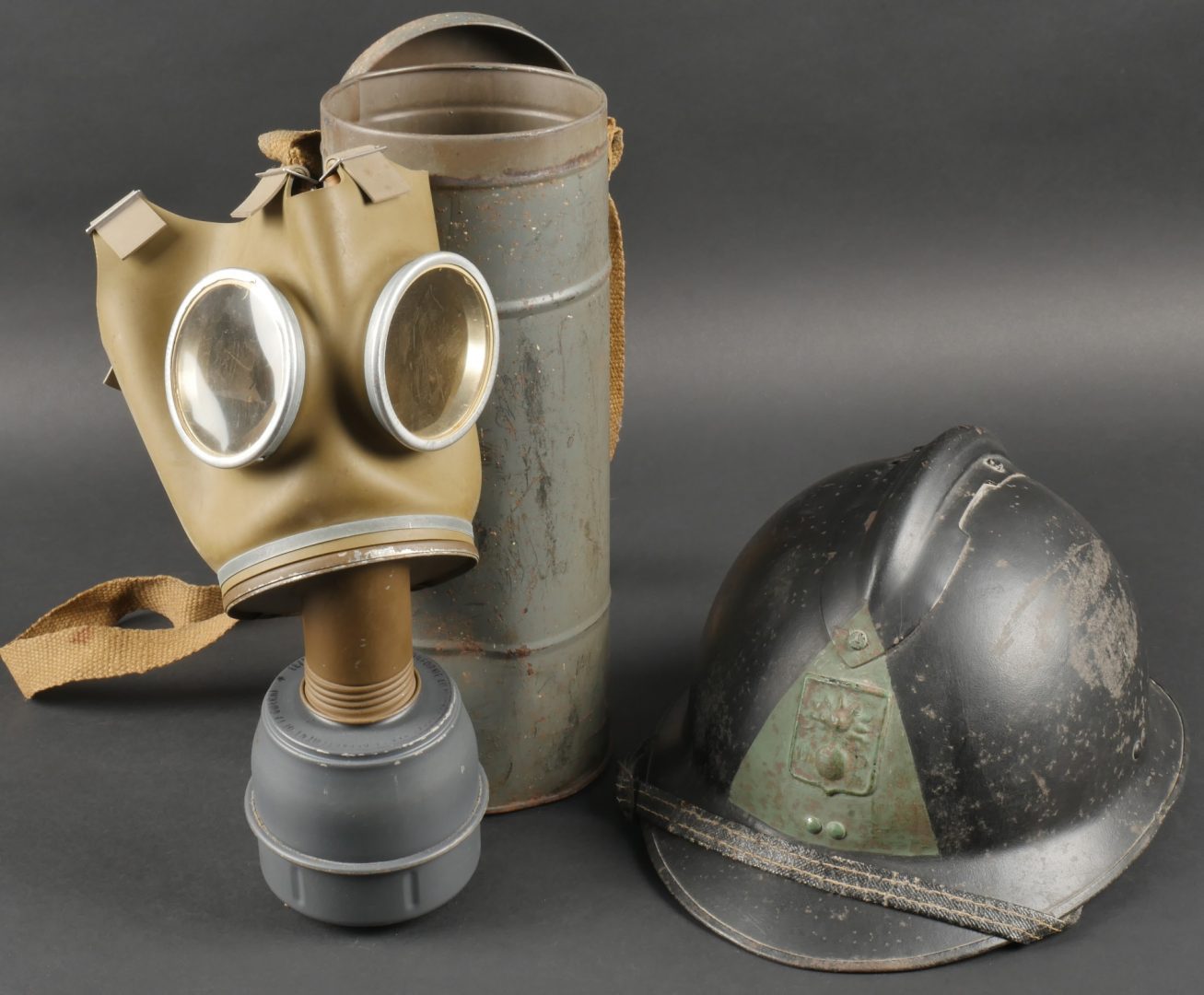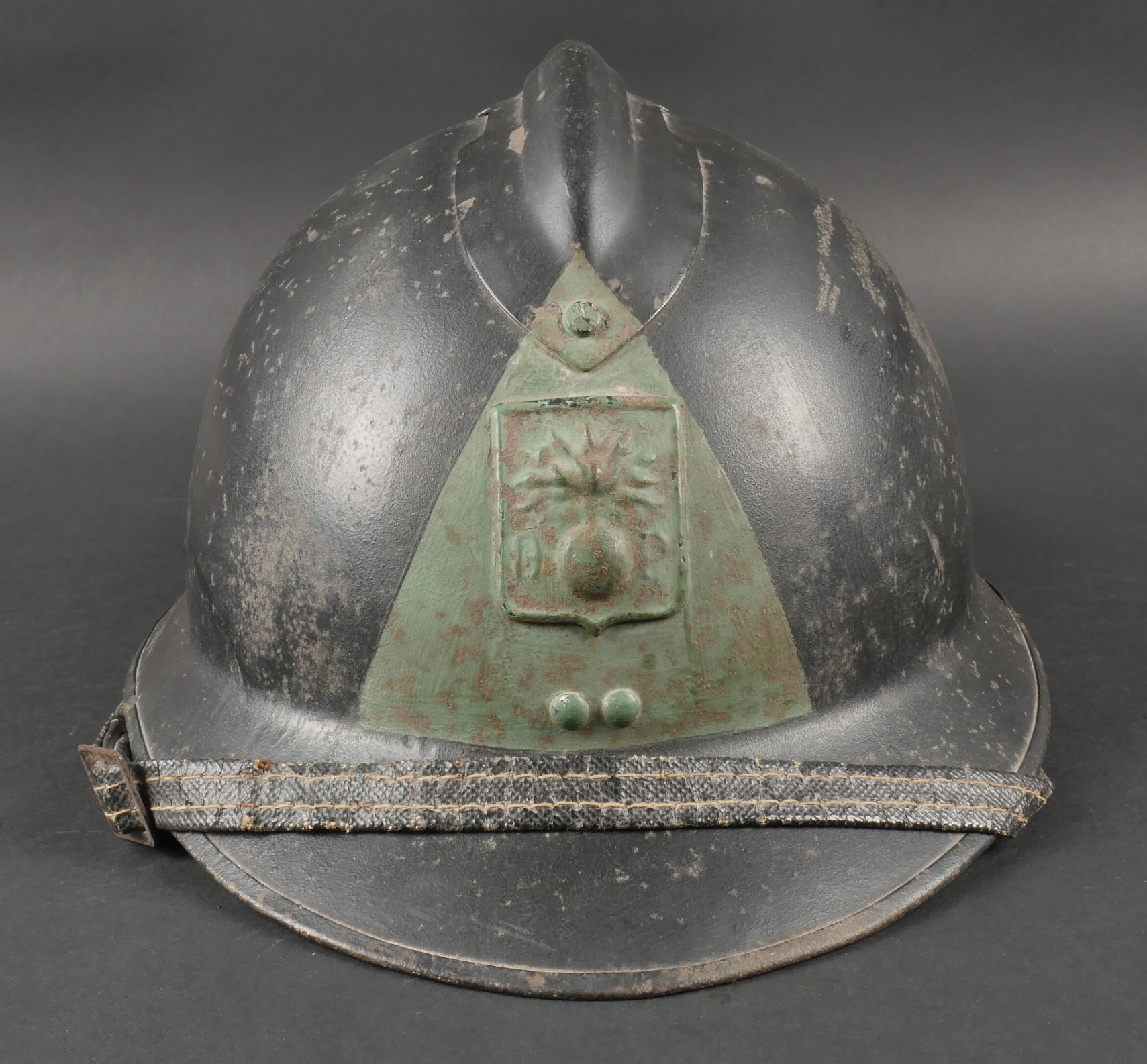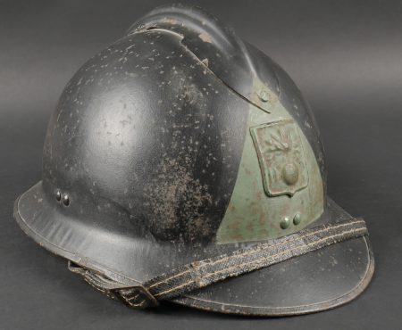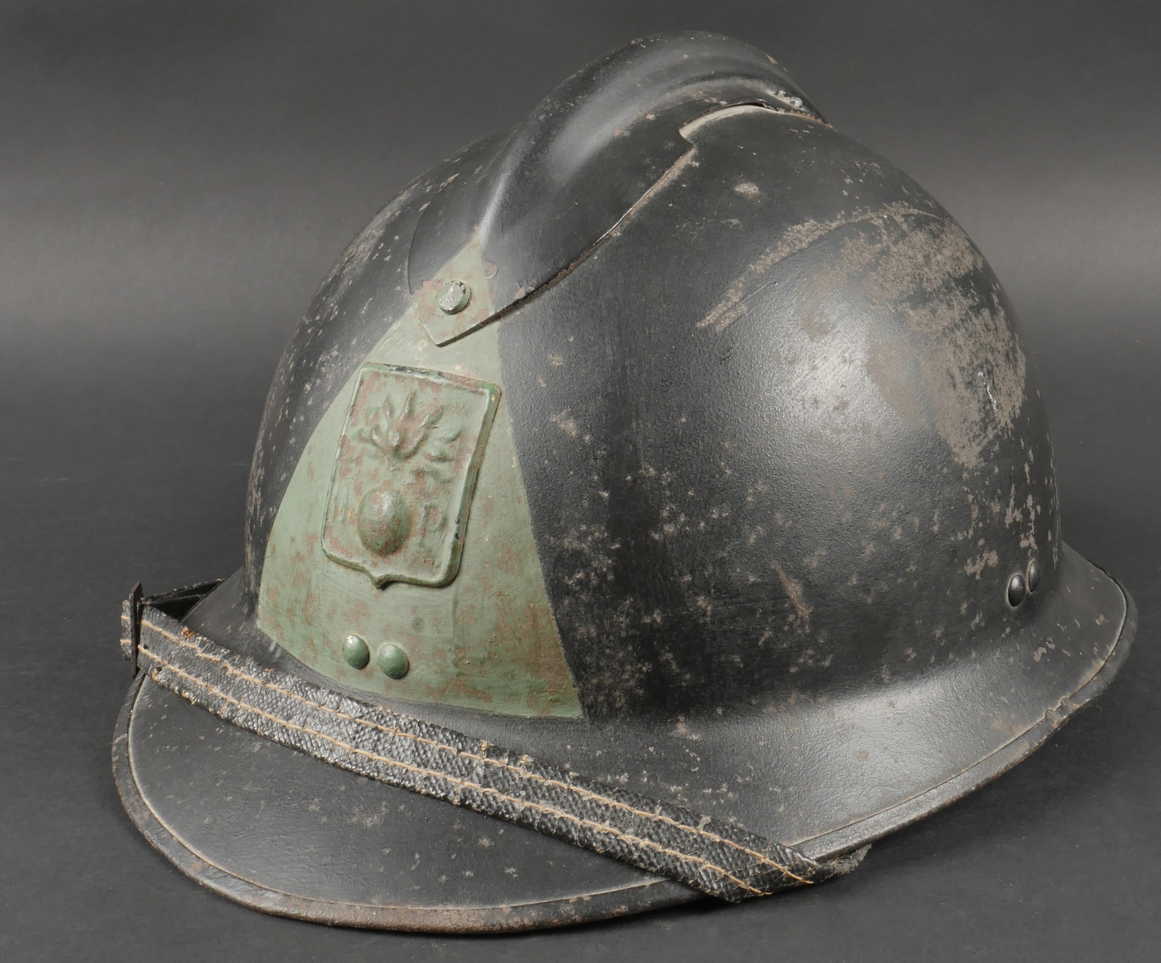 Casque chef d’ilot Défense Passive. Casque Adrian modèle 1926, attribut de la Défense Passive recouvert d’un triangle vert, coiffe en toile cirée typique des fabrications d’armistice ainsi que la jugulaire dans le même matériau. Sur la nuquière on trouve l’inscription au crayon de papier JFP 39, casque entièrement reconditionné en peinture noire. On y joint son masque antigaz défense passive portant sous le couvercle la même mention au crayon JFP39, une bosse sur un côté. Au fond du boitier se trouve le certificat de garantie des établissements Letrange, sangle en toile présente, masque en très bon état avec cartouche datée 1939. Cette pièce provient de Saint DiéPetite Raon dans les Vosges où s’est déroulée l’opération Loyton conduite par le 2nd SAS de miaout a début octobre 1944 avec pour objectif l’ouverture des petits cols en avant de la 3eme armée US Patton. 100 parachutistes SAS, SOE, Jedburgh, 6 jeeps, 1000 maquisards GMA et 1RCV y participèrent. Le grandpère du vendeur, FFI Eaux et Forets puis GMA Vosges, participa à cette opération qui fût a la seconde plus grande opération SAS en France occupée, après SAMWEST en juin 1944 en Bretagne. Il sera pris par les allemands fin septembre et déporté a Dachau ou il mourra en avril 1945. Au décès de sa grandmère, le vendeur récupéra des objets caches ou abandonnes dans la ferme familiale et les maisons du voisinage, tous liés au maquis de la vallée. Ce n’est que bien plus tard qu’il eu connaissance des détails de l’Opération LOYTON. Passive Defence sector leader helmet. Model 1926 Adrian helmet with Passive Defence badge over a green triangle, oilcloth liner typical of armistice manufacture and matching chinstrap. Pencil inscription JFP 39 on the neck guard, helmet fully reconditioned in black paint. Includes its Passive Defence gas mask with the same JFP39 pencil note inside the lid and a dent on one side. At the bottom of the can is the warranty certificate of the Letrange works, web strap present, mask in very good condition with cartridge dated 1939. This piece comes from Saint Dié Petite Raon in the Vosges where Operation Loyton by 2nd SAS took place from mid August to early October 1944 with the objective of opening small passes ahead of the US Third Army Patton. One hundred SAS SOE Jedburgh six jeeps one thousand GMA maquisards and 1 RCV took part. The seller’s grandfather FFI Eaux et Forêts then GMA Vosges took part in this operation which was the second largest SAS operation in occupied France after SAMWEST in June 1944 in Brittany. He was captured by the Germans in late September and deported to Dachau where he died in April 1945. On his grandmother’s death the seller recovered hidden or left items in the family farm and neighboring houses all linked to the valley Maquis and only later learned details of Operation Loyton.