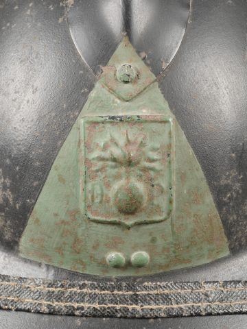 Casque chef d’ilot Défense Passive. Casque Adrian modèle 1926, attribut de la Défense Passive recouvert d’un triangle vert, coiffe en toile cirée typique des fabrications... en savoir plus