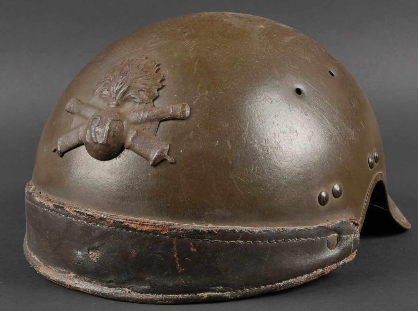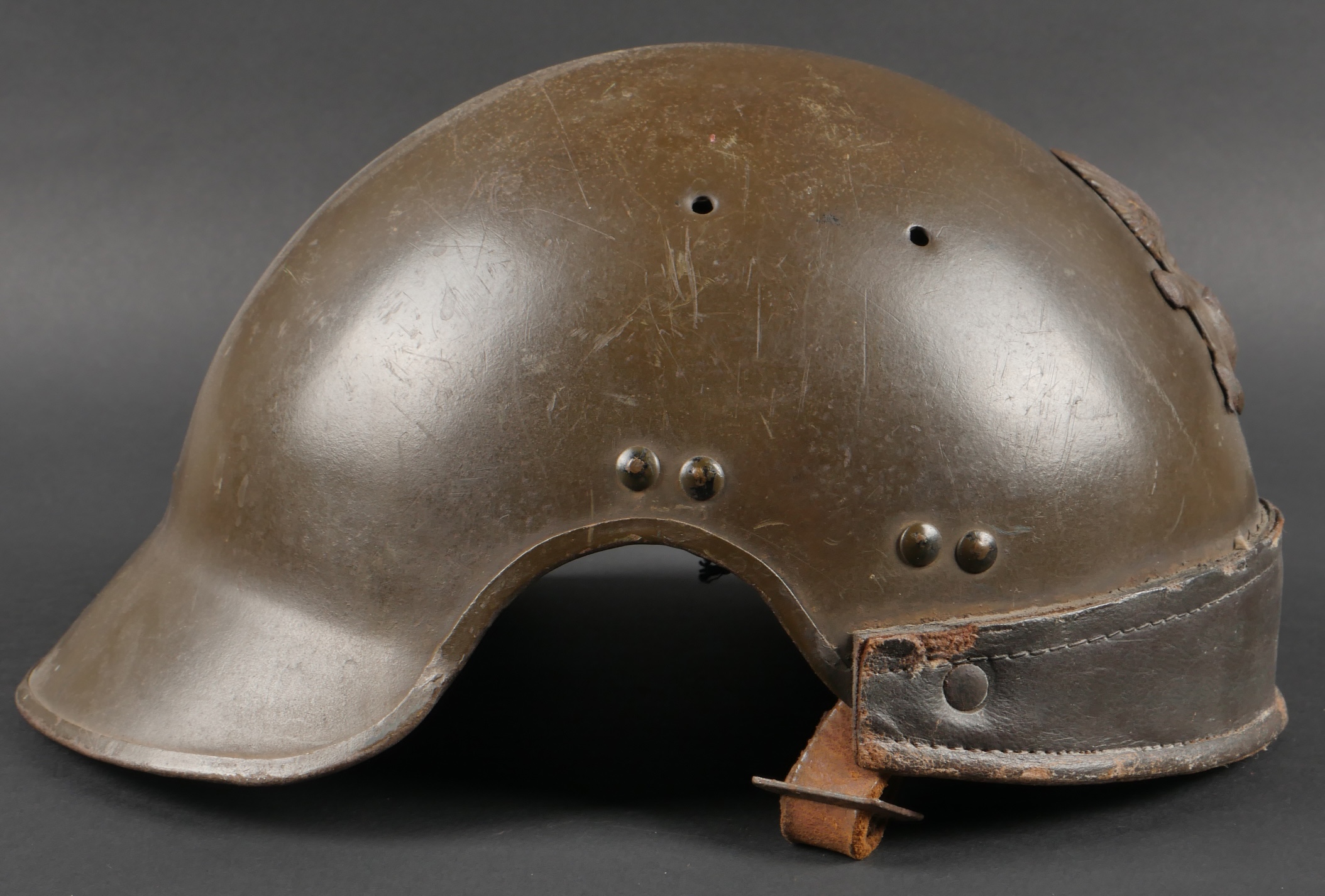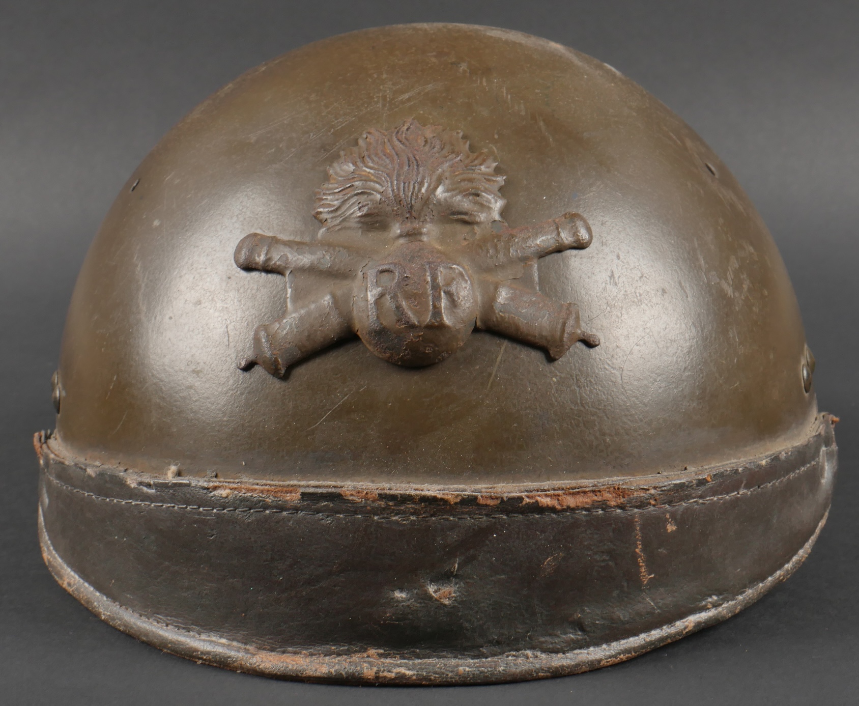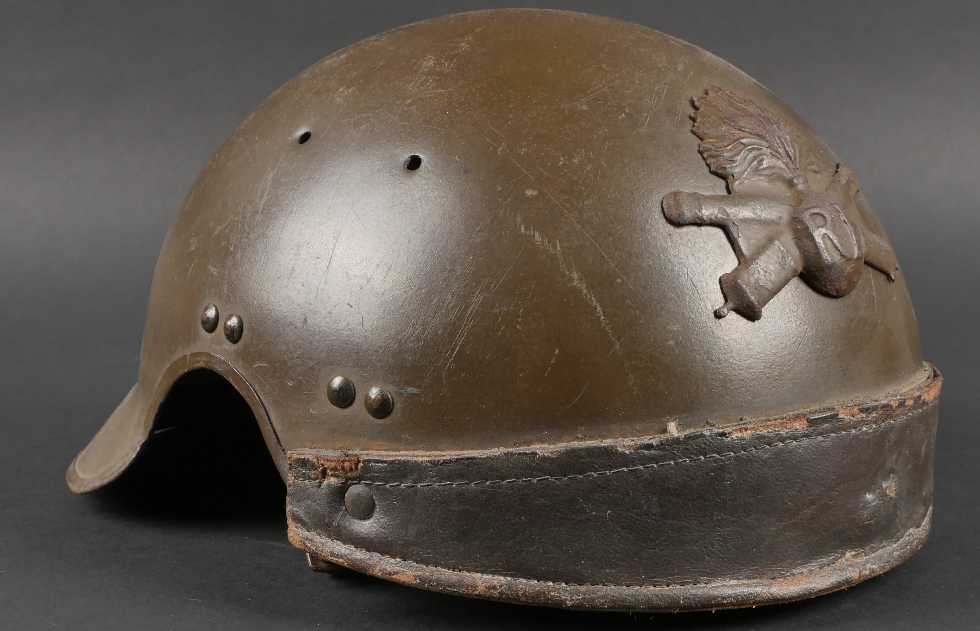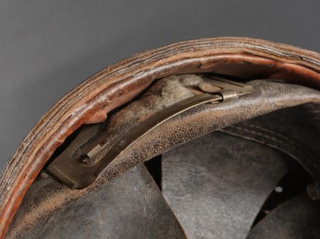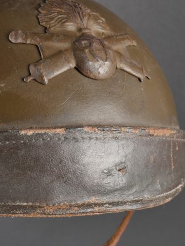 Casque DCA 1936. Casque de la défense anti aérienne en peinture kaki à 90%, attribut modèle 1915 d’artillerie. Coiffe intérieure en cuir spécifique au modèle DCA, six agrafes dont une... en savoir plus