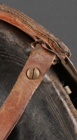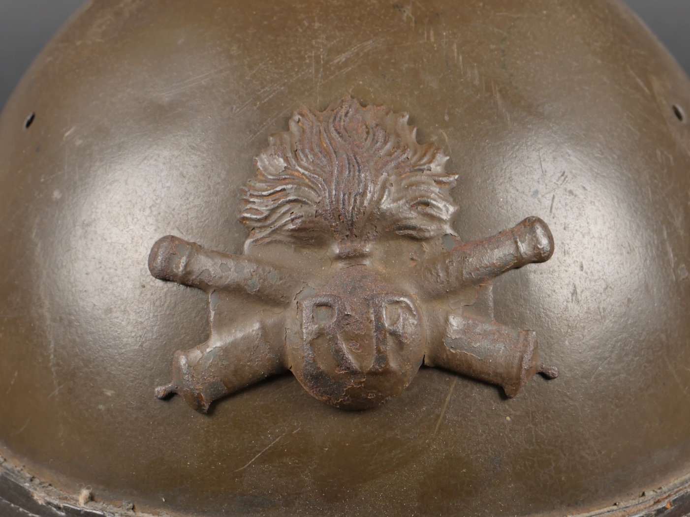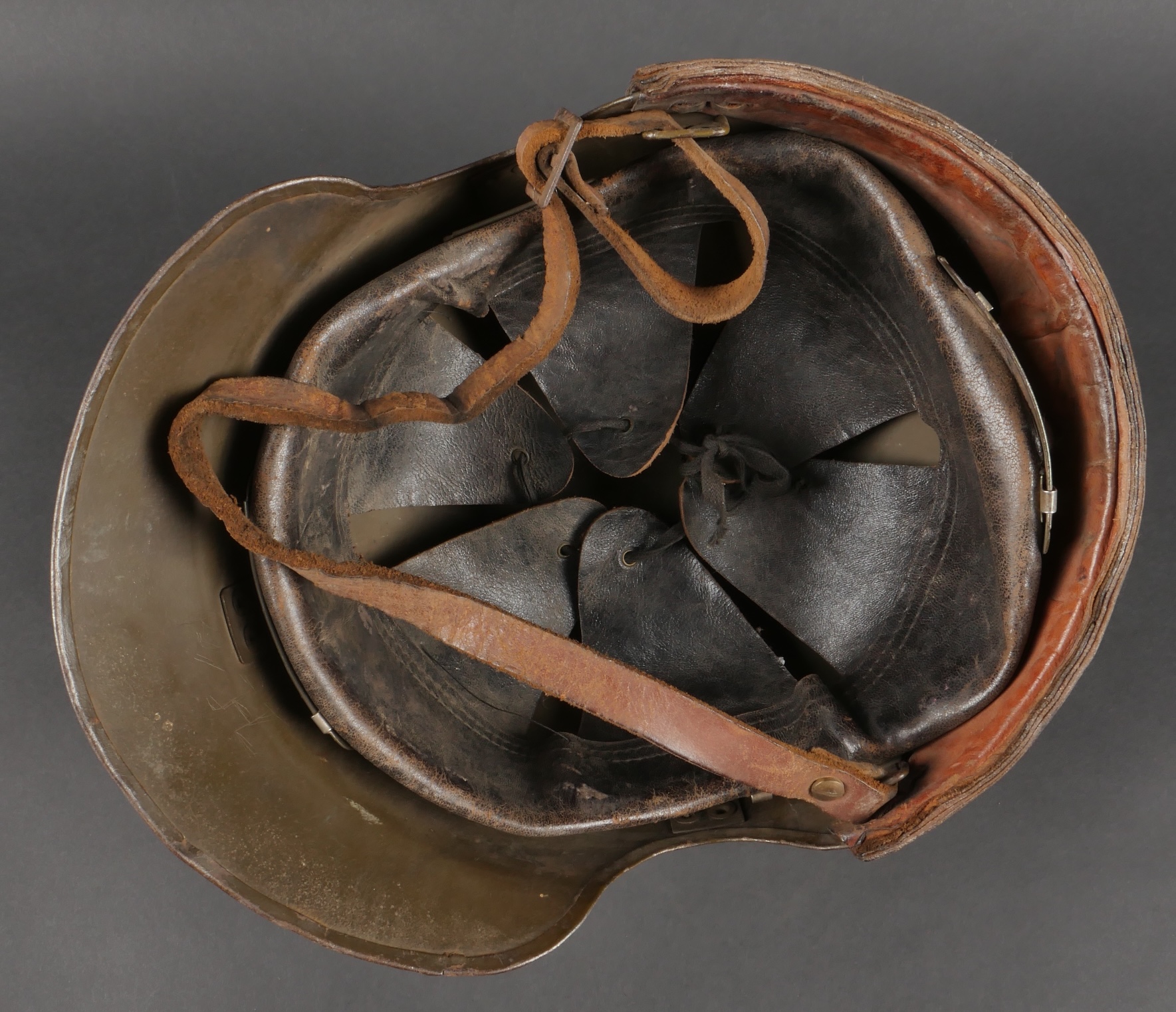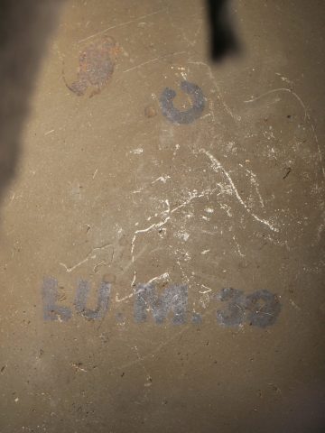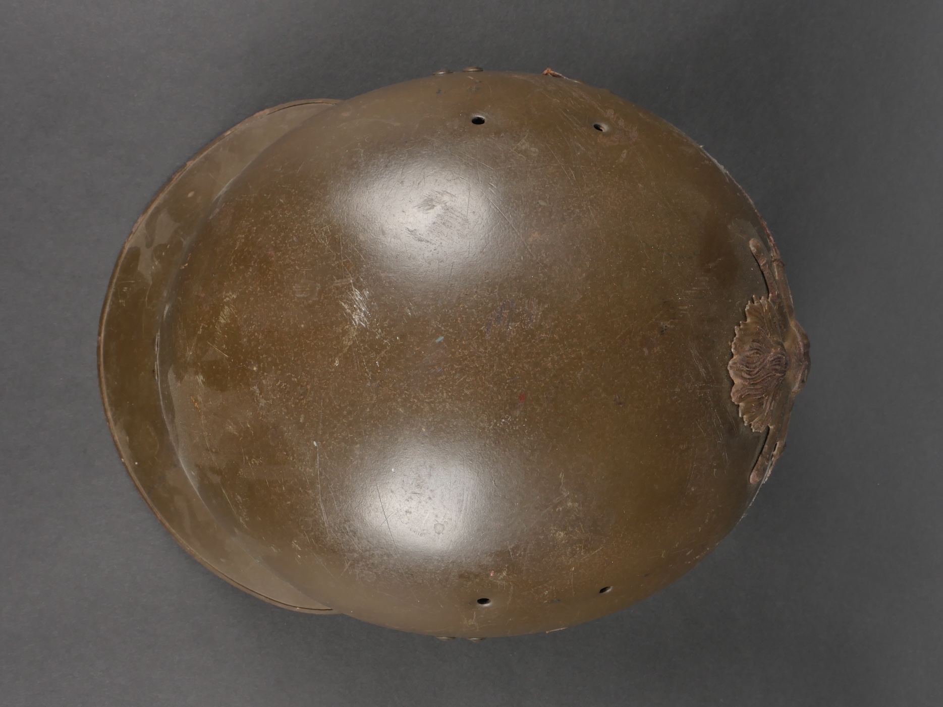Casque DCA 1936. Casque de la défense anti aérienne en peinture kaki à 90%, attribut modèle 1915 d’artillerie. Coiffe intérieure en cuir spécifique au modèle DCA, six agrafes dont une... en savoir plus