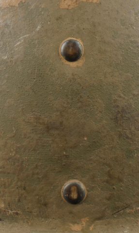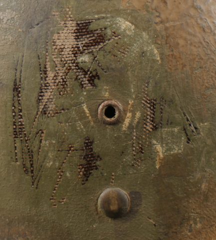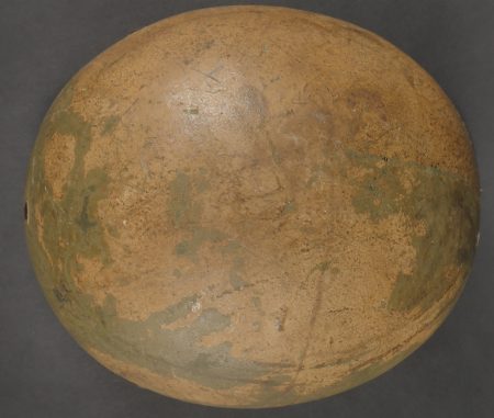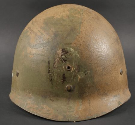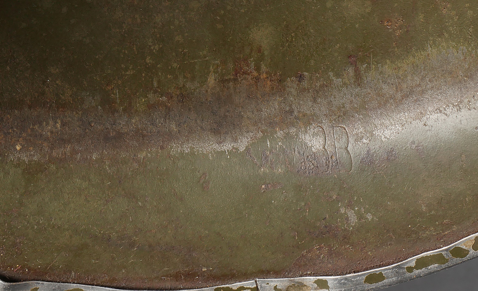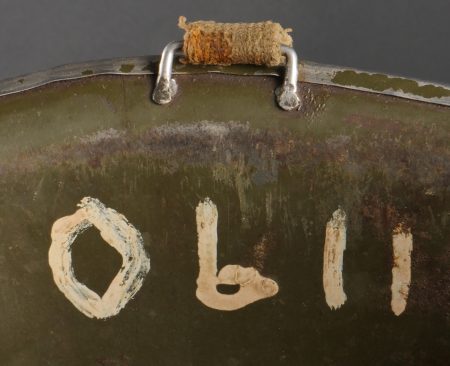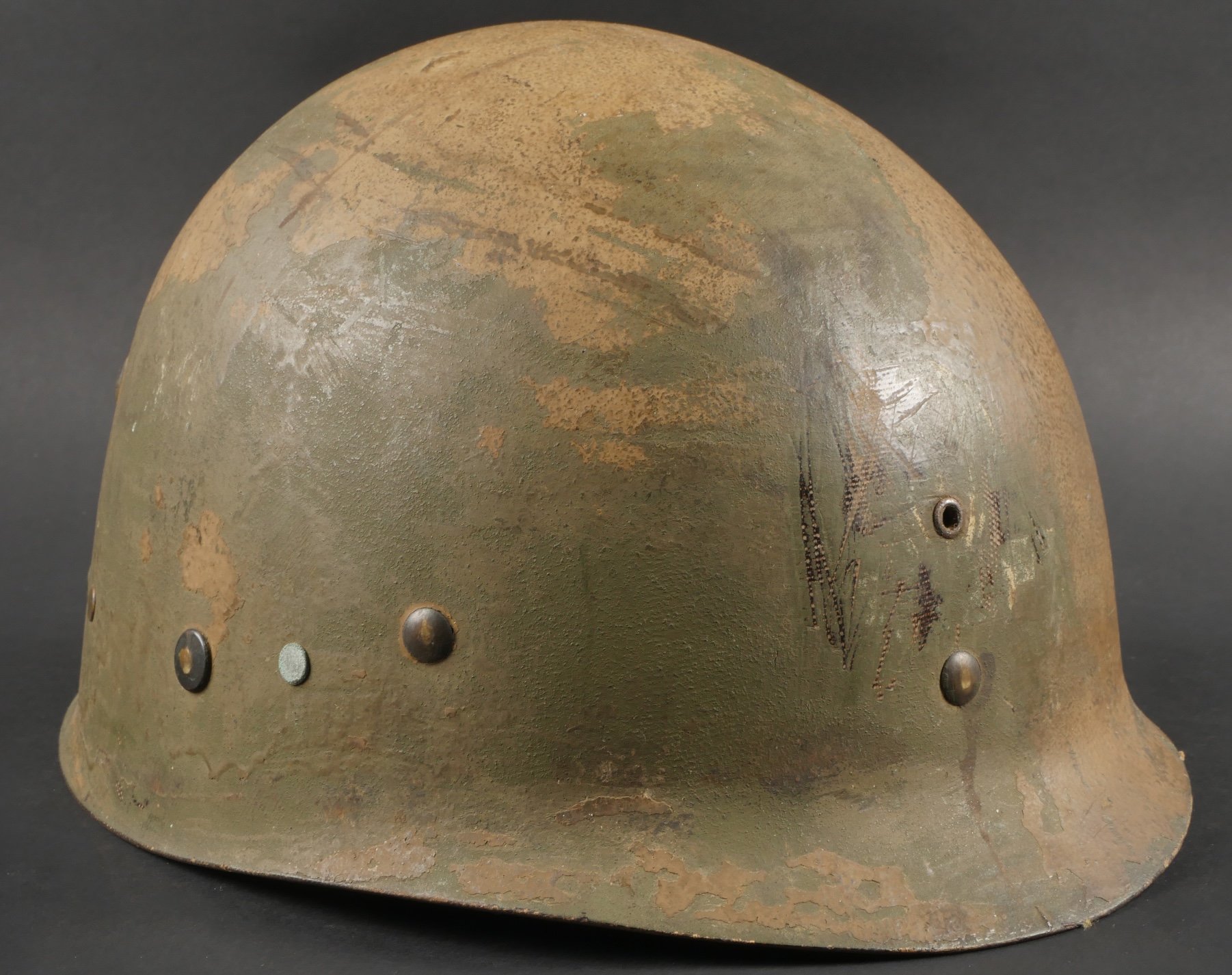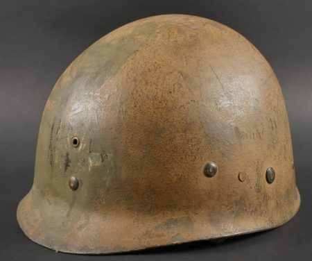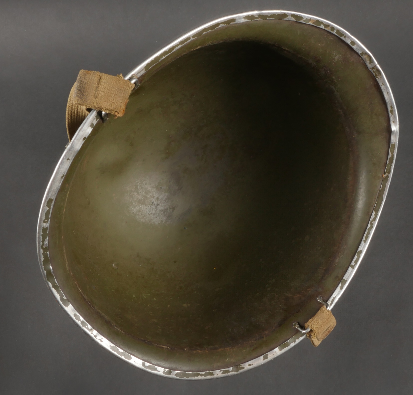 Sous casque Américain standard M1 de fabrication Firestone, modifié par l’Armée Française par l’ajout de sangles en V , en coton kaki, rivetées. La mentonnière est du type TAP 51, confectionnée en coton Kaki. Le sous casque possède son bandeau de cuir et son neckband. La peinture d’usine fut recouverte par une seconde couche au pinceau, mais l’on distingue à l’avant un insigne frontal des troupes aéroportées. Le casque lourd, est un modèle Américain standard, M1 , jonc à l’avant, pattes fixes, jugulaires en toile OD3 cousues d’origine. A l’intérieur se trouve un laundry number US P1190. Numéro de lot 43B . US M1 liner made by Firestone modified by the French Army with added V straps khaki cotton riveted. Chinstrap TAP 51 type made of khaki cotton. Liner retains its leather band and neckband. Factory paint covered with hand repainted coat with faint visible airborne frontal insignia. The steel shell is standard US M1 front seam fixed bales OD3 web chinstraps sewn on. Inside marked with laundry number US P1190. Lot number 43B.