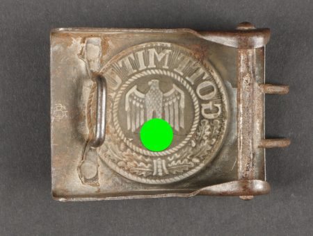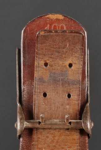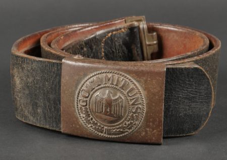 Ceinturon de guerre. Ceinturon allemand pour la Heer, boucle en fer avec sa patelette, croix gammée meulée, marquage fabricant BG 41. Ceinturon en cuir souple taille 100, crochet en fer, daté... en savoir plus