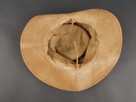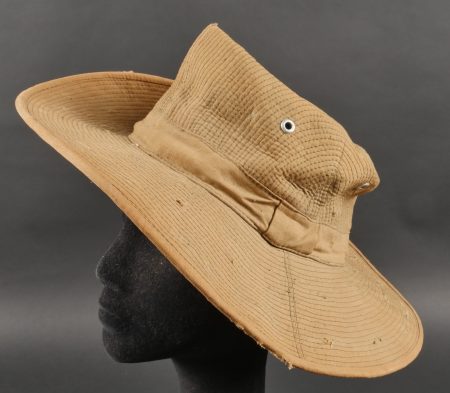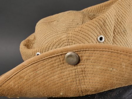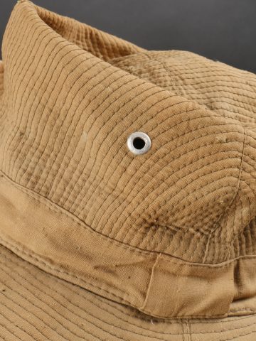 Chapeau de Brousse réglementaire modèle 1949, de confection Extrême Orient. Pour une fois ce chapeau, porte un marquage de fabricant Indochinois COMPTOIR DO MINH , taille 57. La grosse pression... en savoir plus