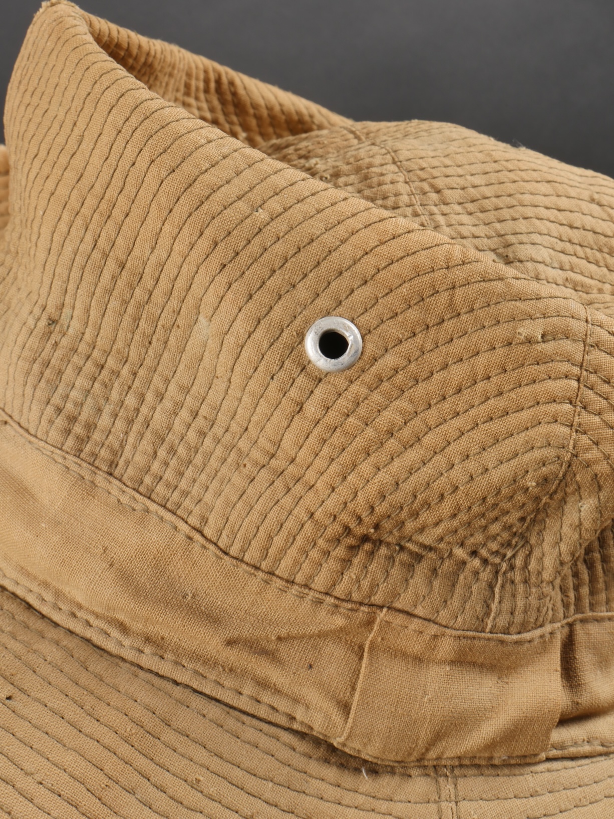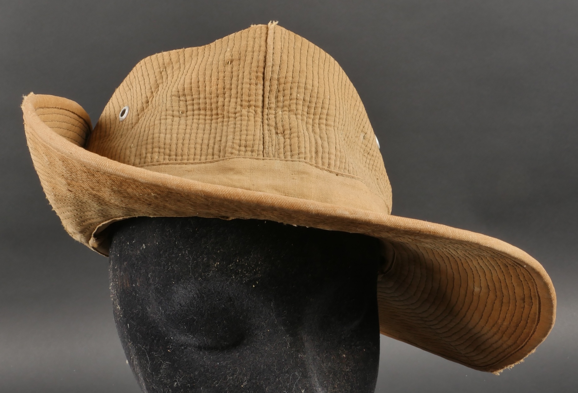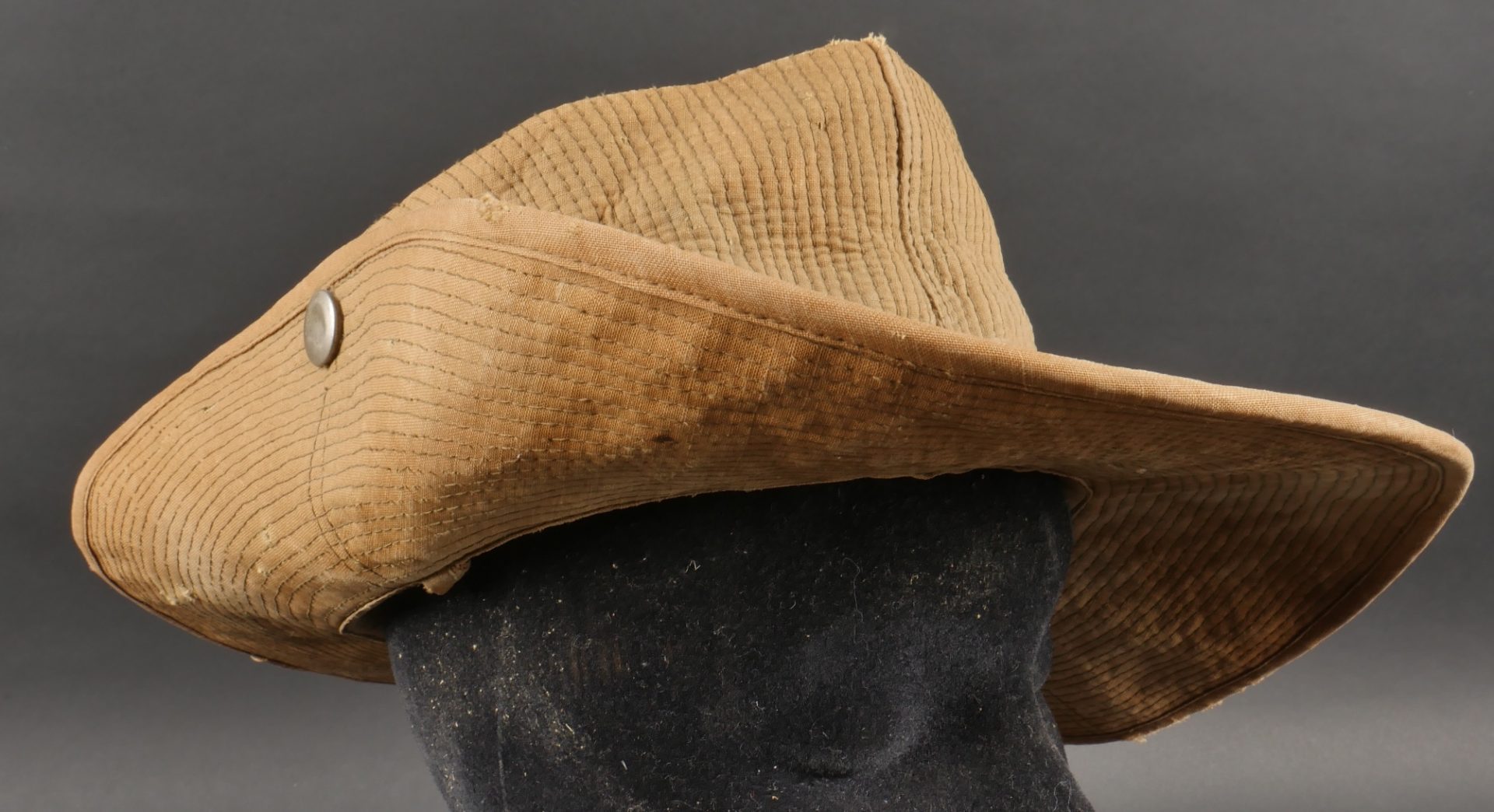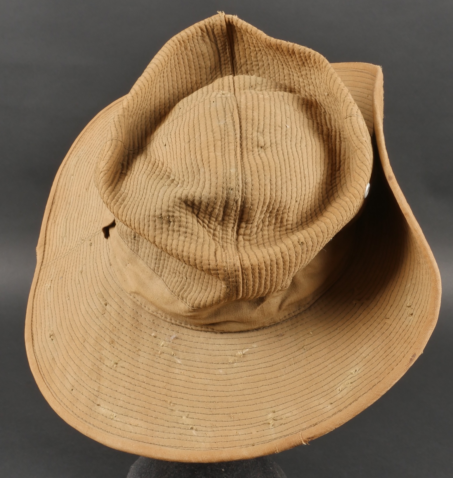 Chapeau de Brousse réglementaire modèle 1949, de confection Extrême Orient. Pour une fois ce chapeau, porte un marquage de fabricant Indochinois COMPTOIR DO MINH , taille 57. La grosse pression... en savoir plus