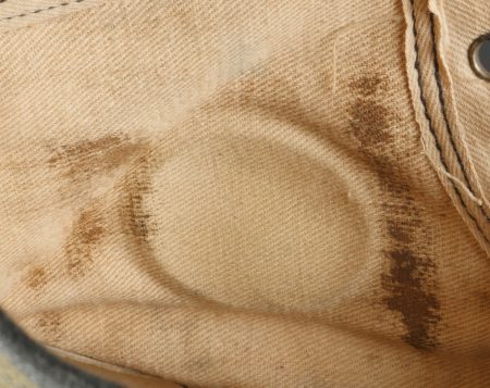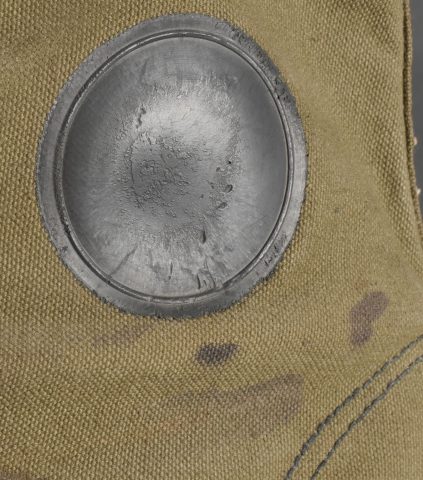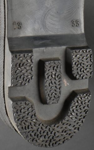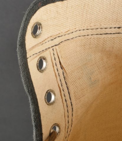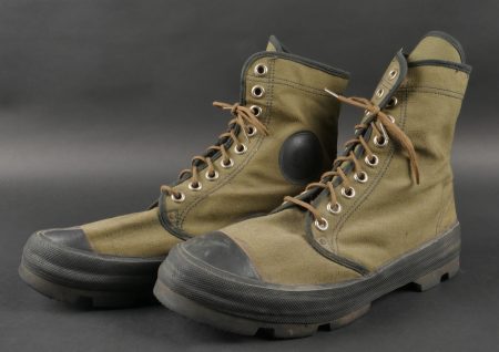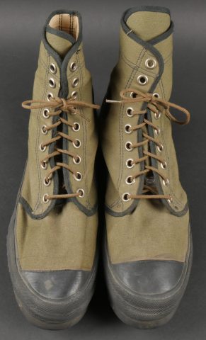Paire de chaussures de brousse réglementaire fabriquées localement en Indochine pour l’Intendance. Entièrement confectionnées en toile kaki, semelle et renforts en caoutchouc noir. Tous... en savoir plus
