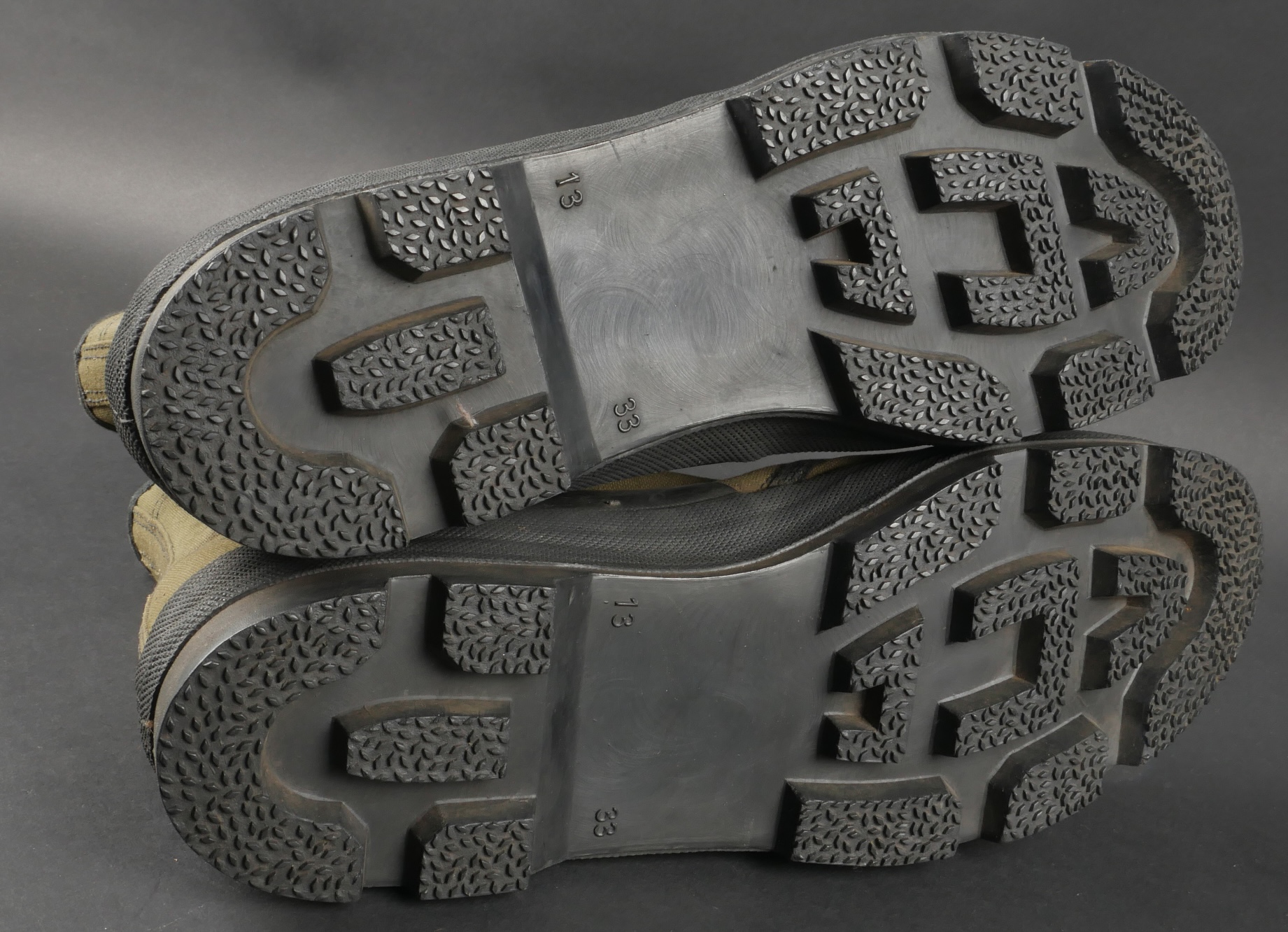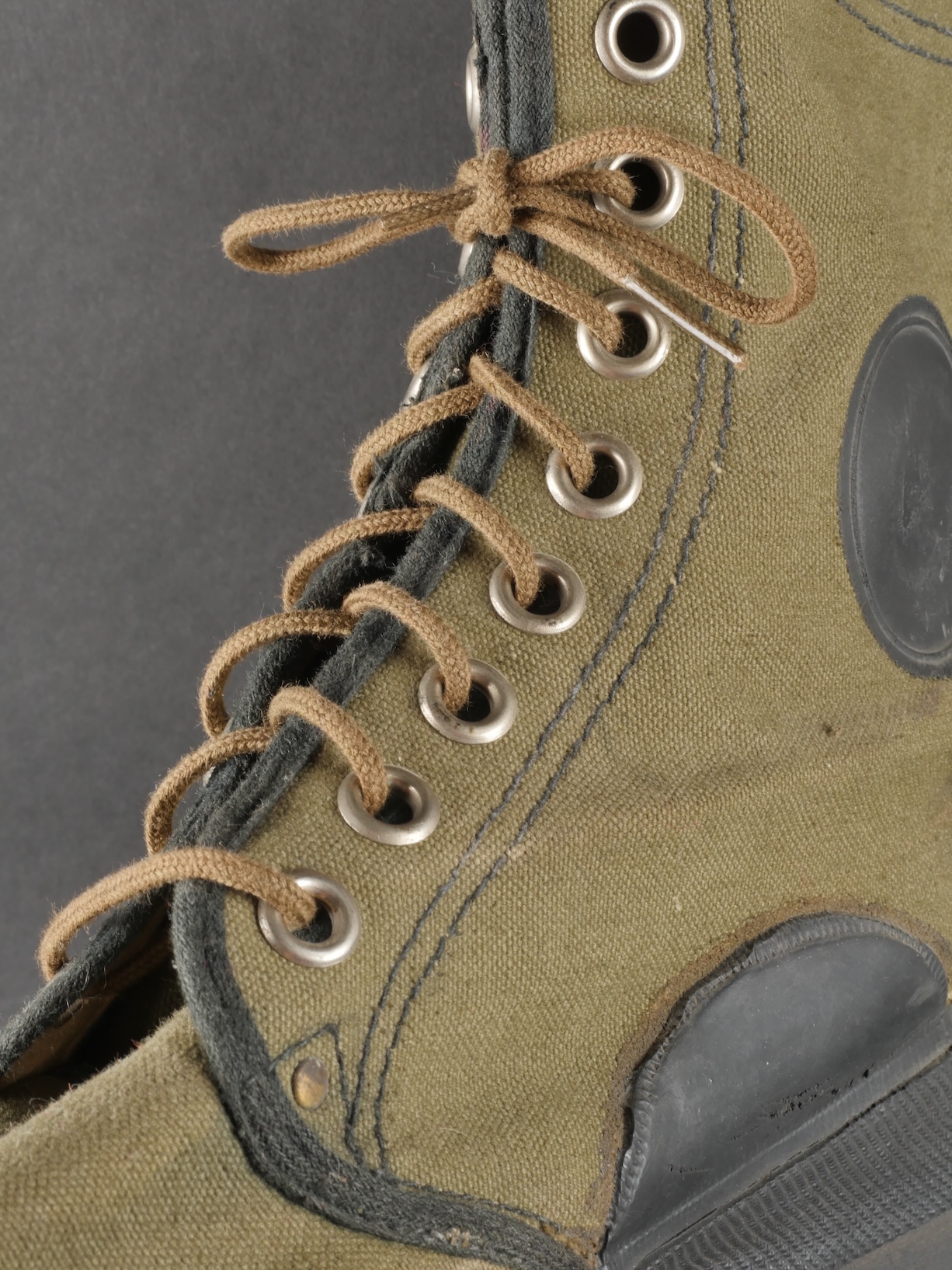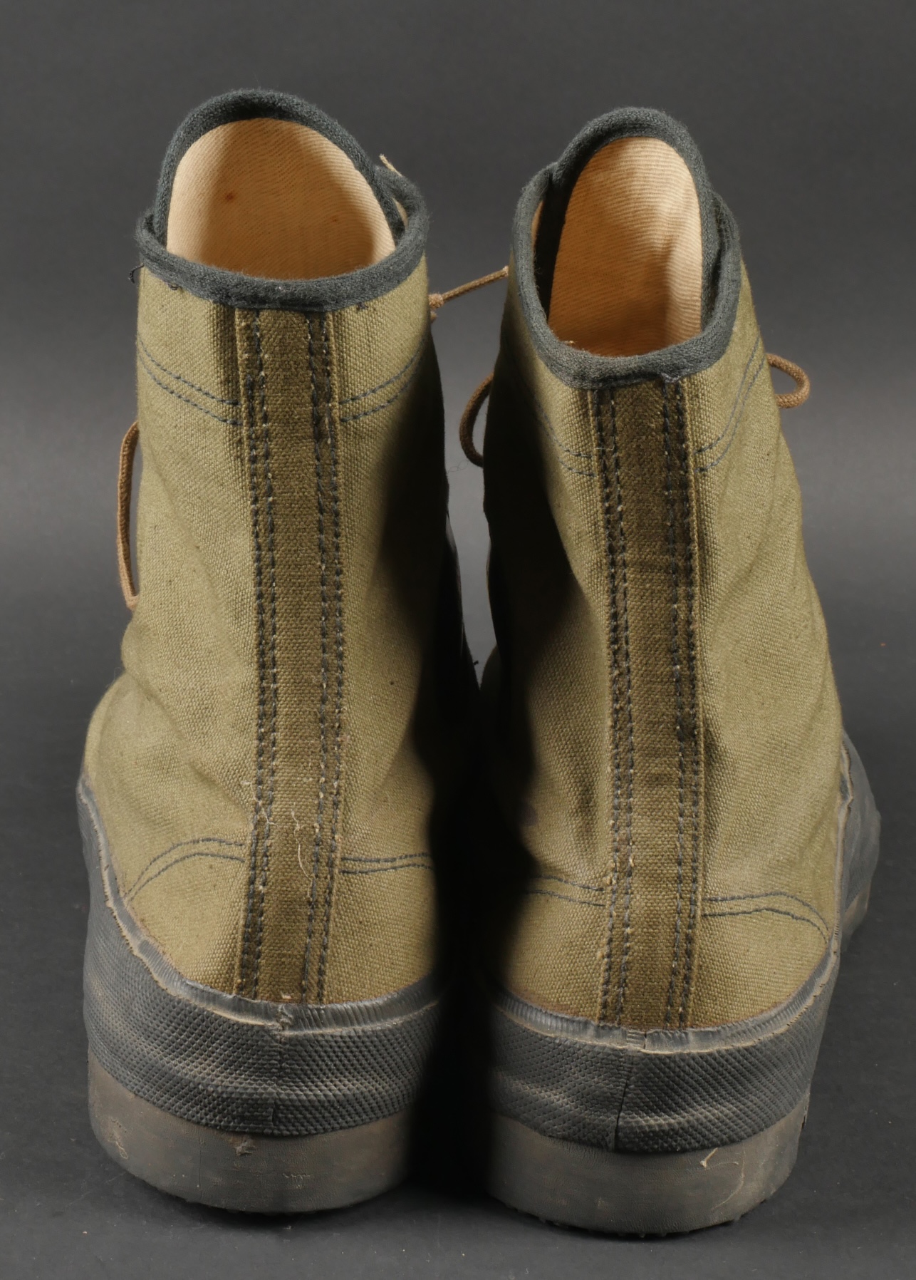 Paire de chaussures de brousse réglementaire fabriquées localement en Indochine pour l’Intendance. Entièrement confectionnées en toile kaki, semelle et renforts en caoutchouc noir. Tous... en savoir plus