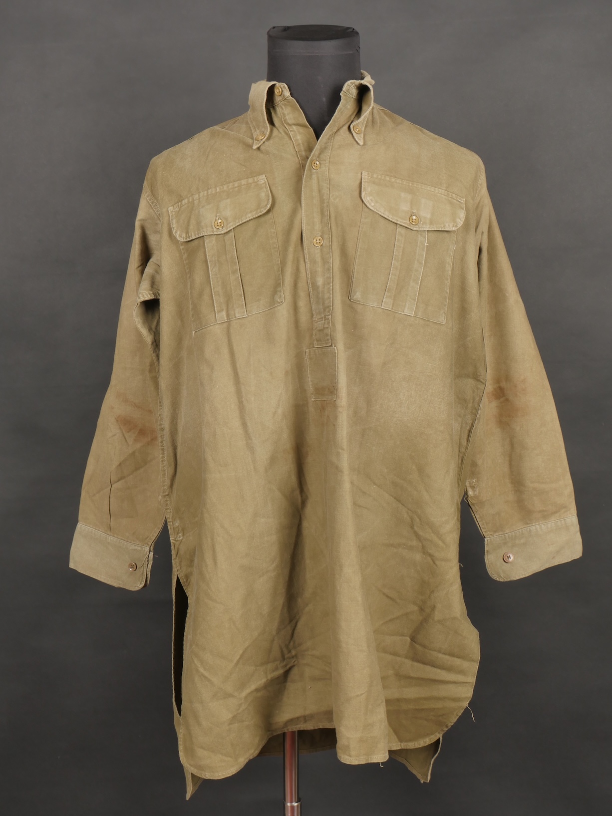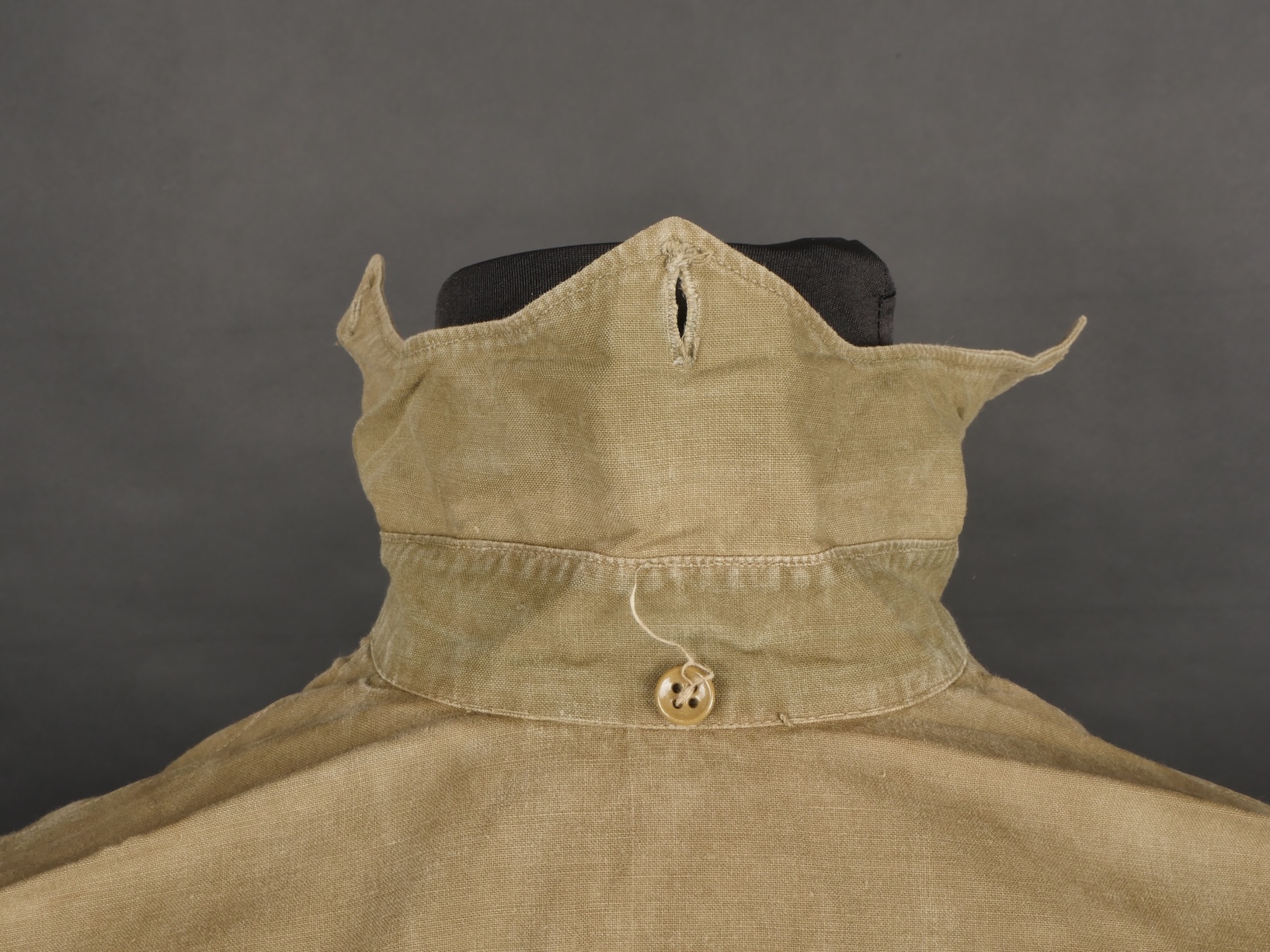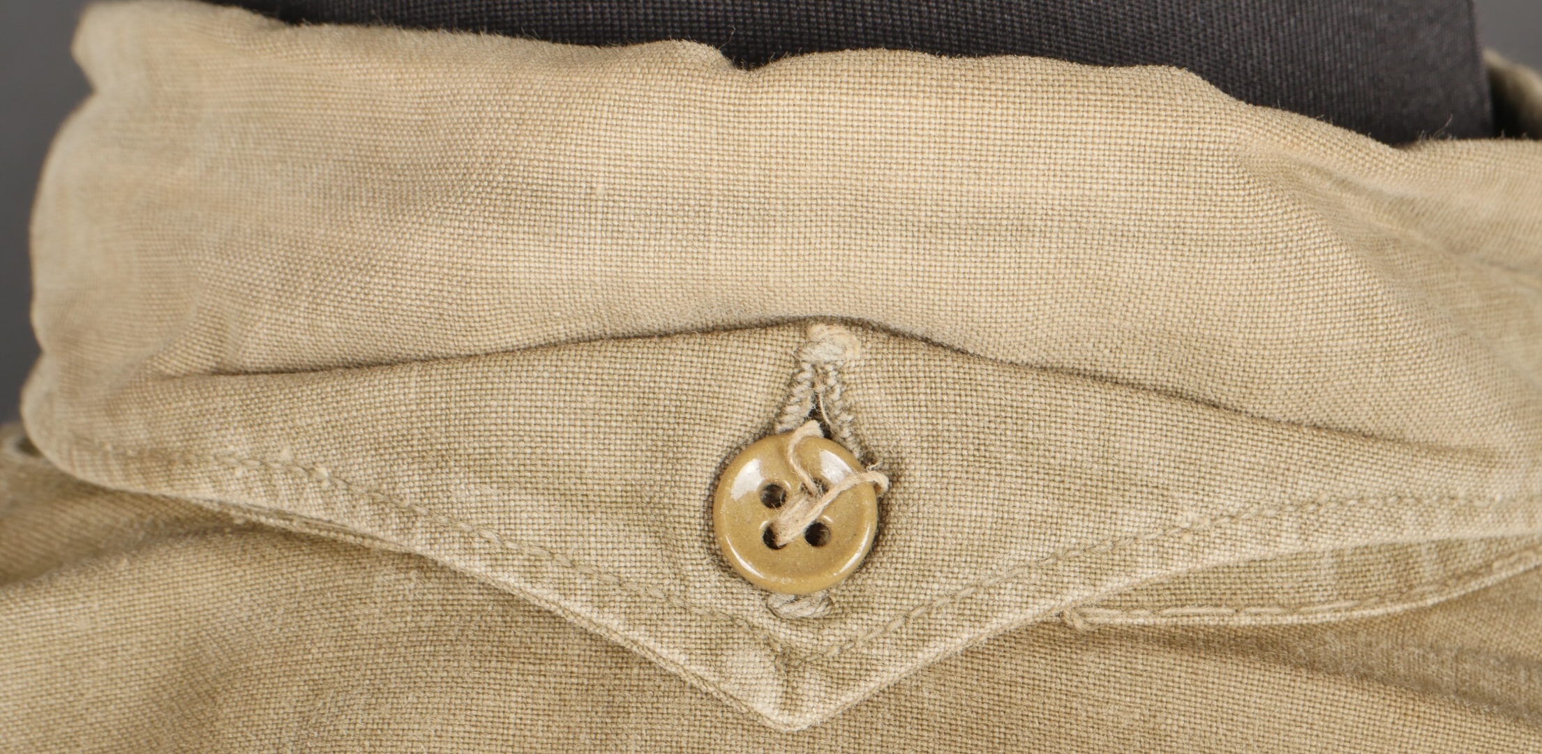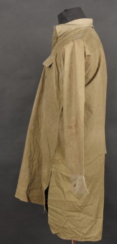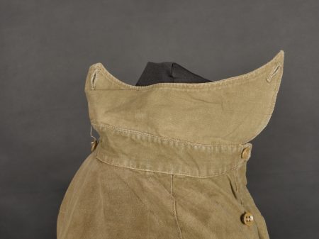 Chemise 1935. Modèle réglementaire en tissu kaki se fermant par trois boutons, boutons à l’arrière du col présents. Carré de drap sur la poitrine cousu d’origine. Bonne taille mannequin et bon état général. Shirt 1935. Regulation model in khaki fabric closing with three buttons, rear collar buttons present. Original stitched cloth patch on the chest. Good mannequin size and overall good condition.