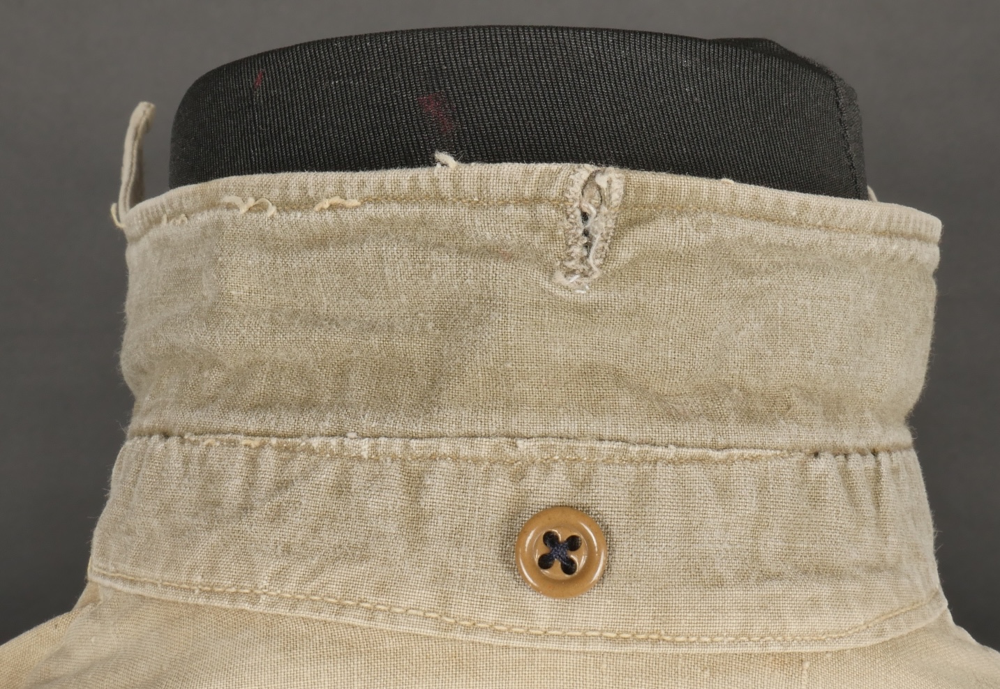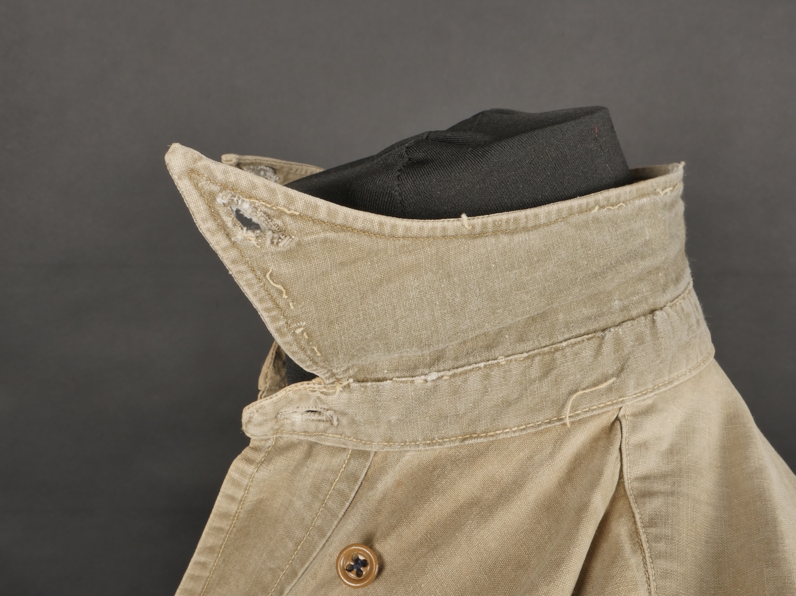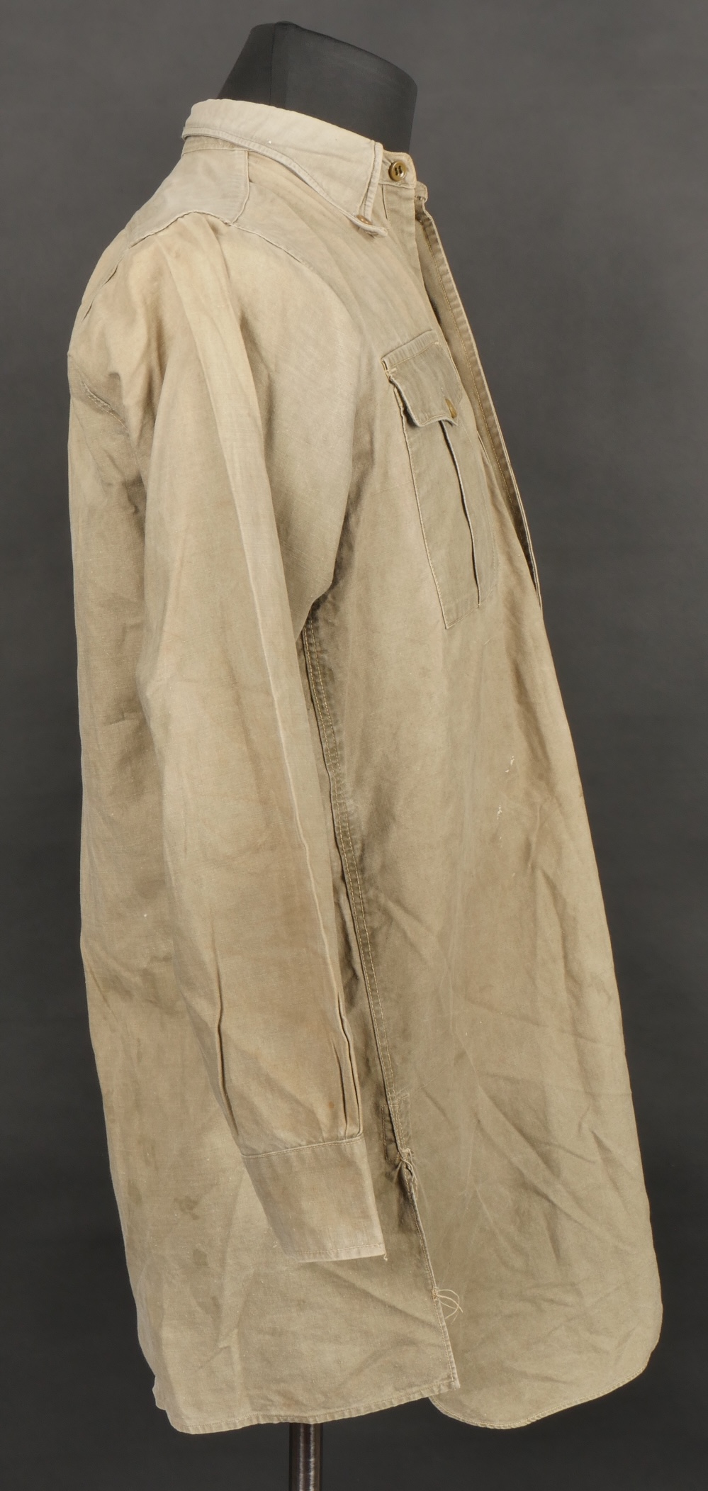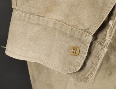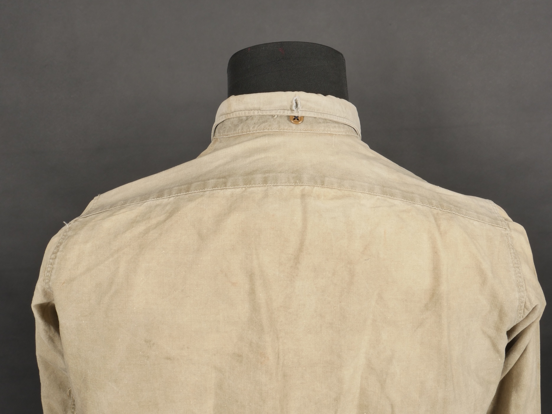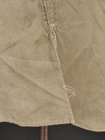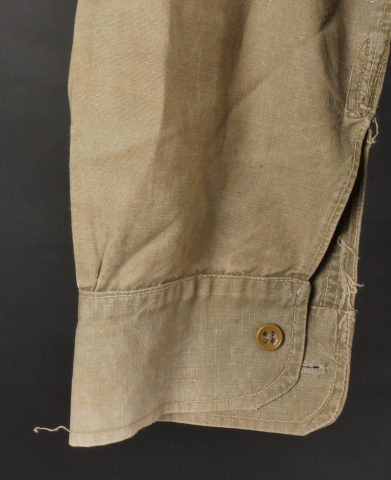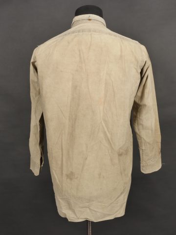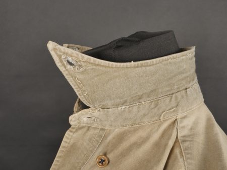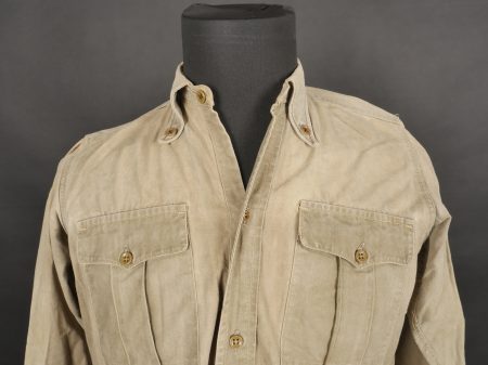 Chemise 1935. Modèle réglementaire en tissu kaki se fermant par trois boutons, boutons à l’arrière du col présents. Carré de drap sur la poitrine cousu d’origine. Bonne taille mannequin. Shirt 1935 Regulation model in khaki fabric closing with three buttons rear collar buttons present. Original stitched cloth patch on the chest. Good mannequin size and overall good condition.