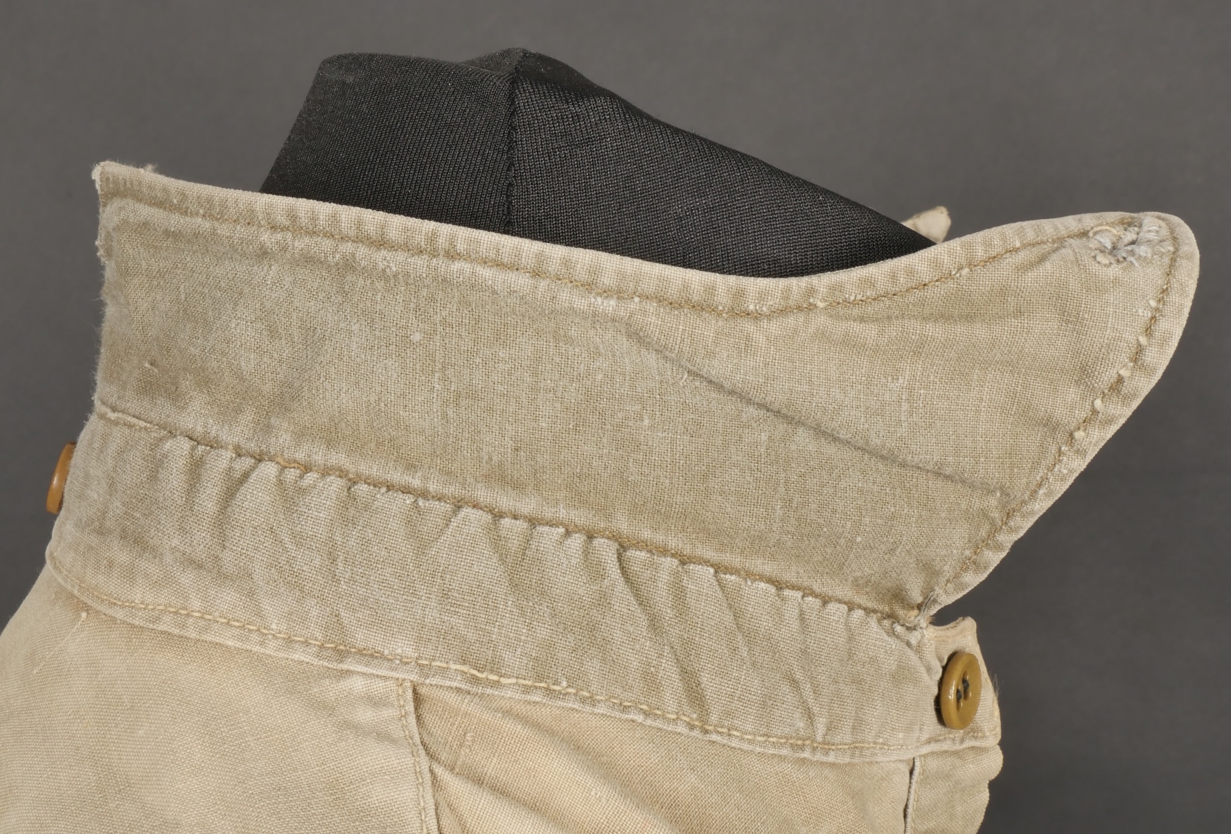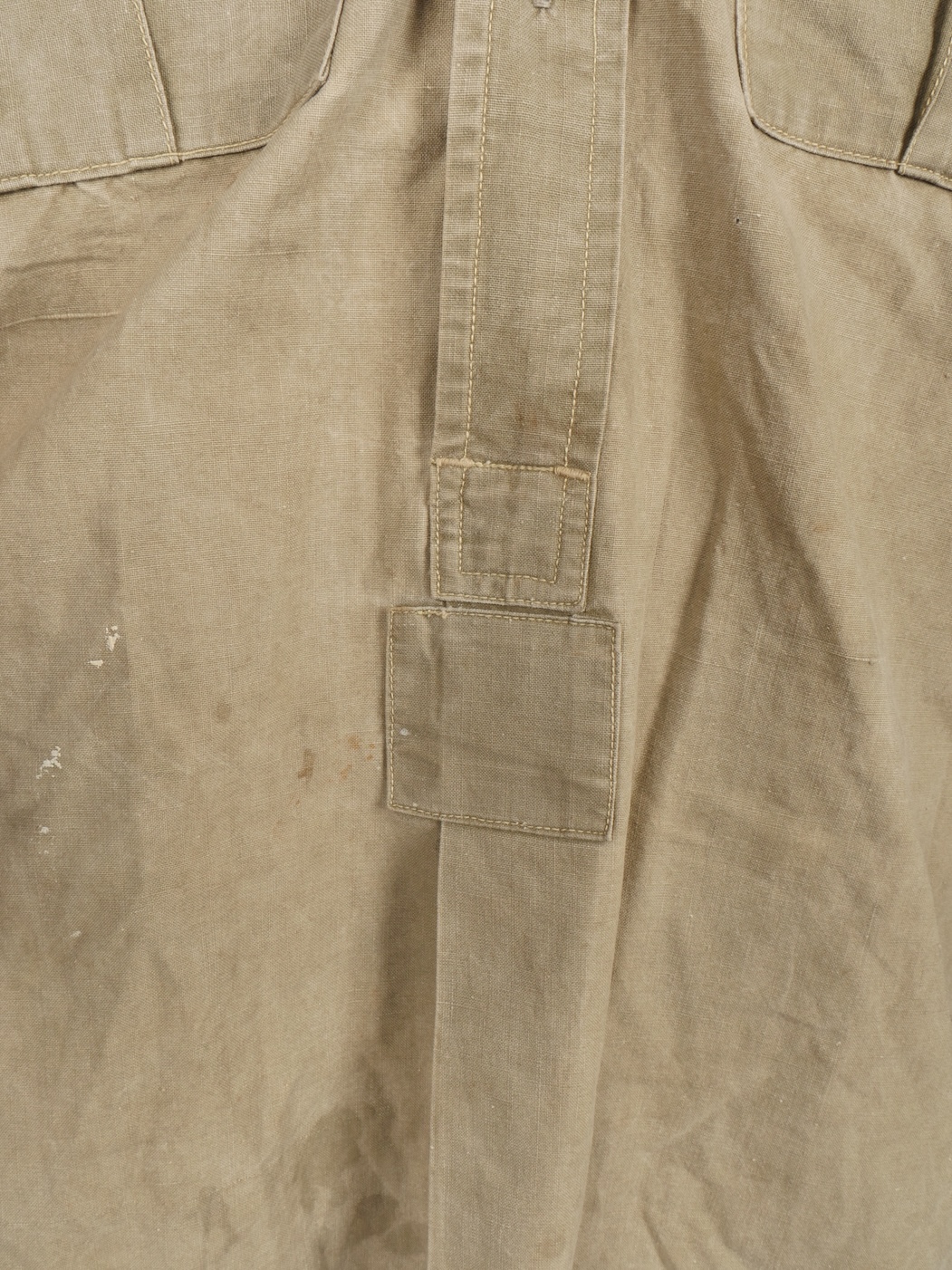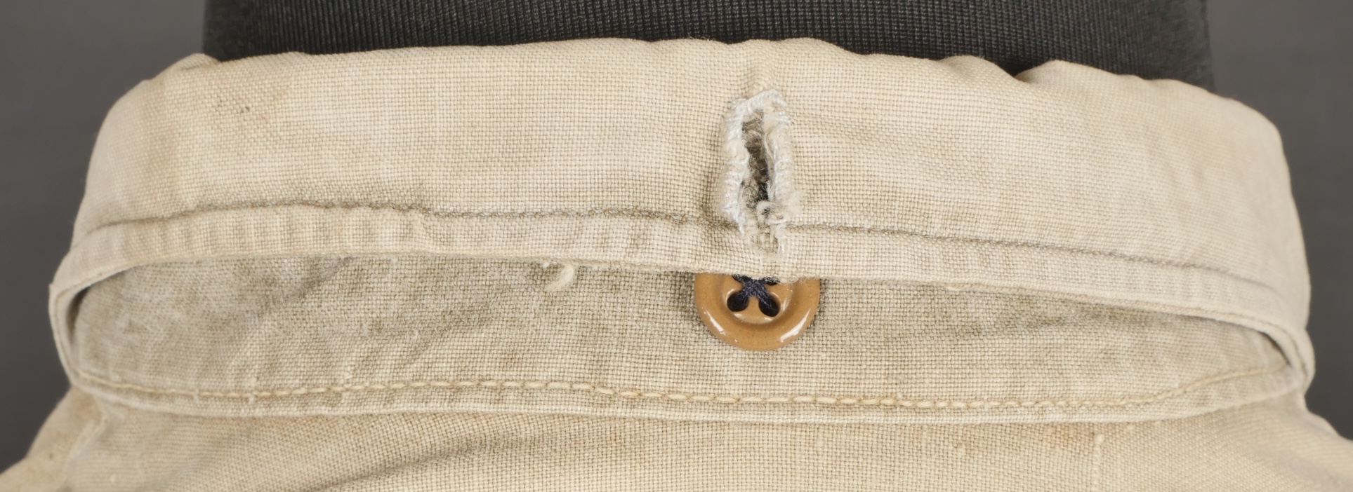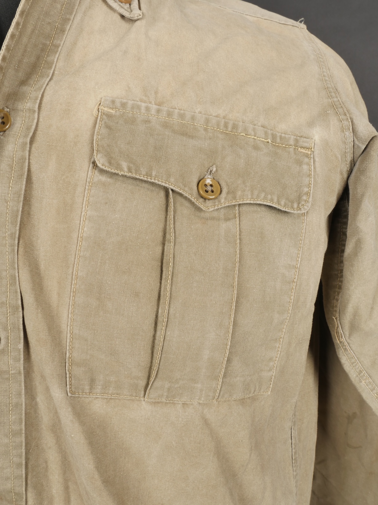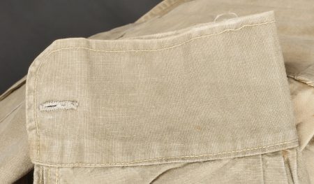 Chemise 1935. Modèle réglementaire en tissu kaki se fermant par trois boutons, boutons à l’arrière du col présents. Carré de drap sur la poitrine cousu d’origine. Bonne taille mannequin. Shirt 1935 Regulation model in khaki fabric closing with three buttons rear collar buttons present. Original stitched cloth patch on the chest. Good mannequin size and overall good condition.