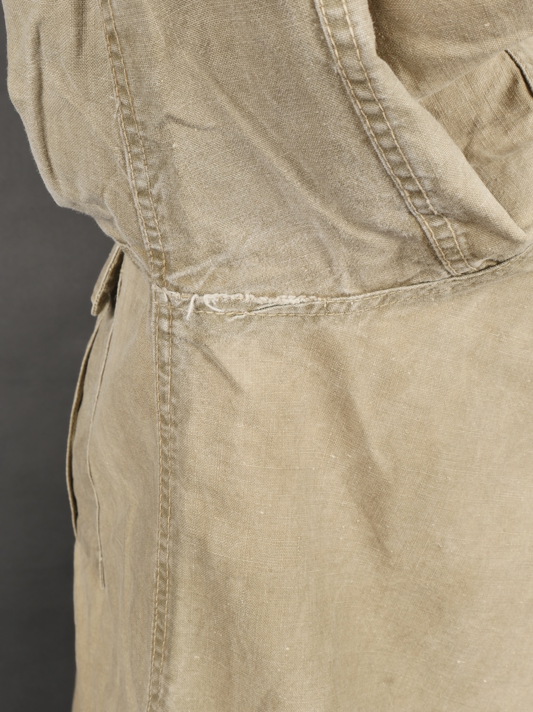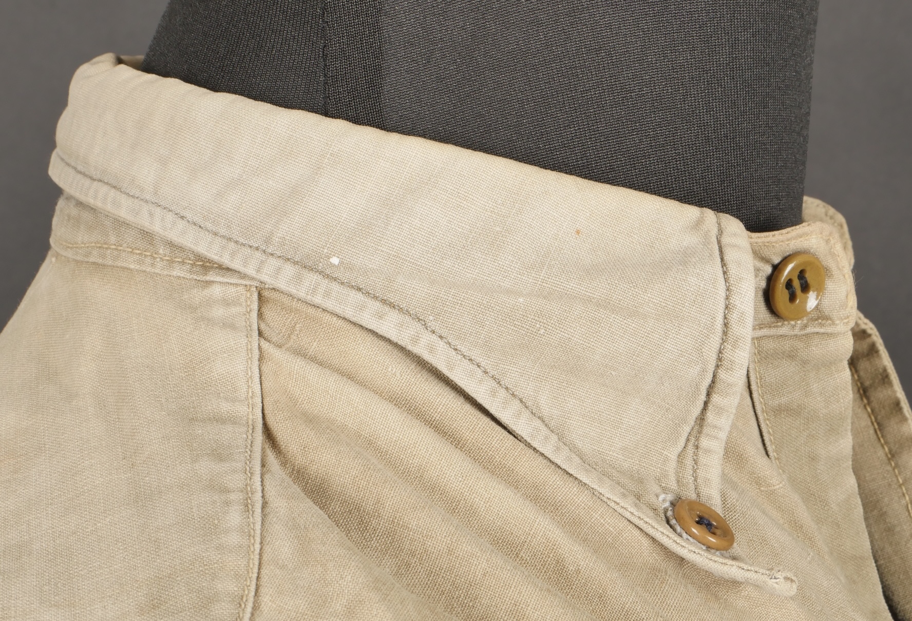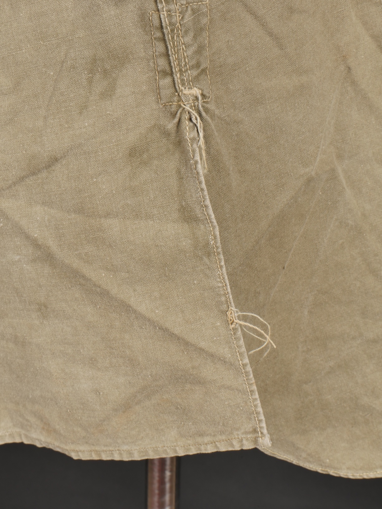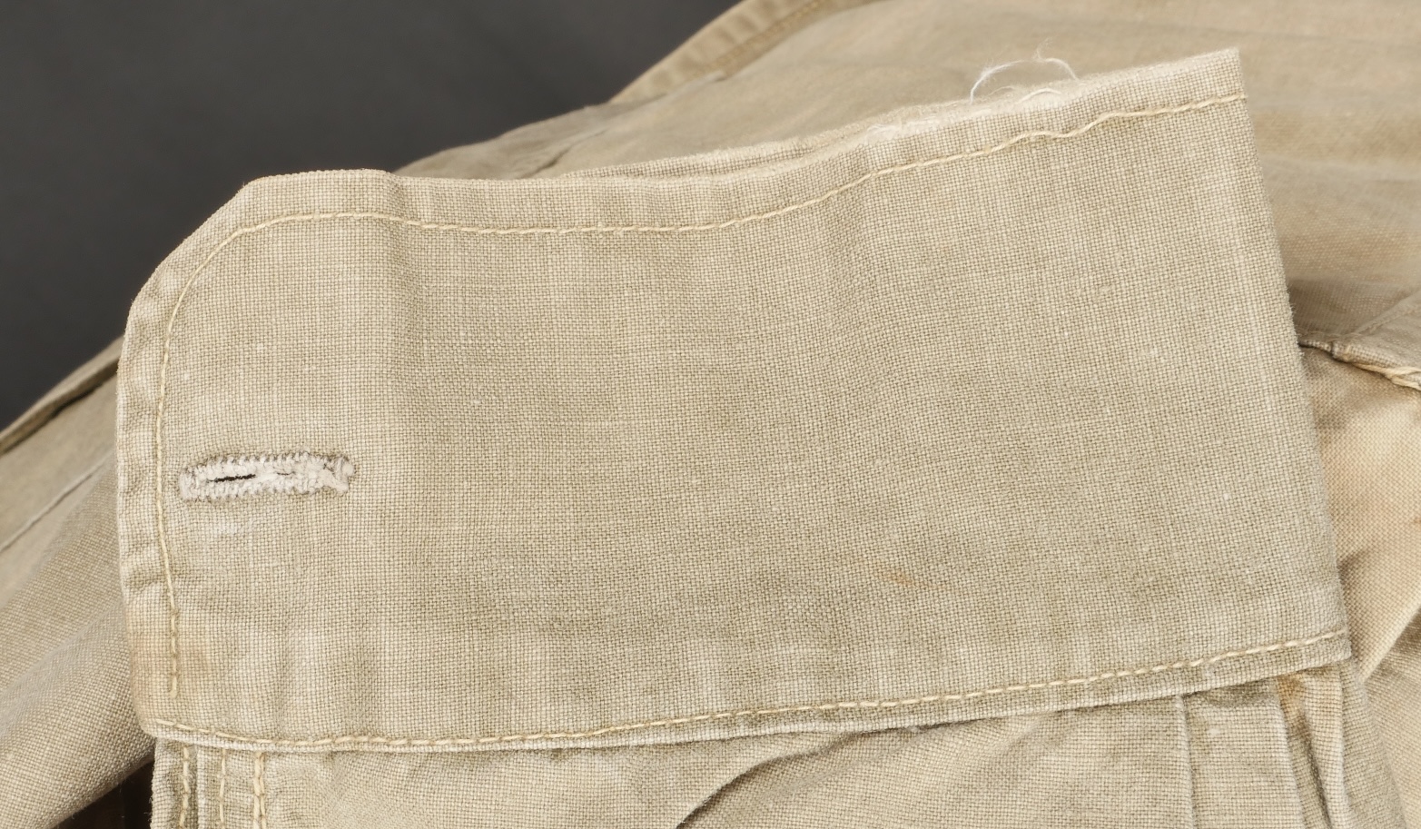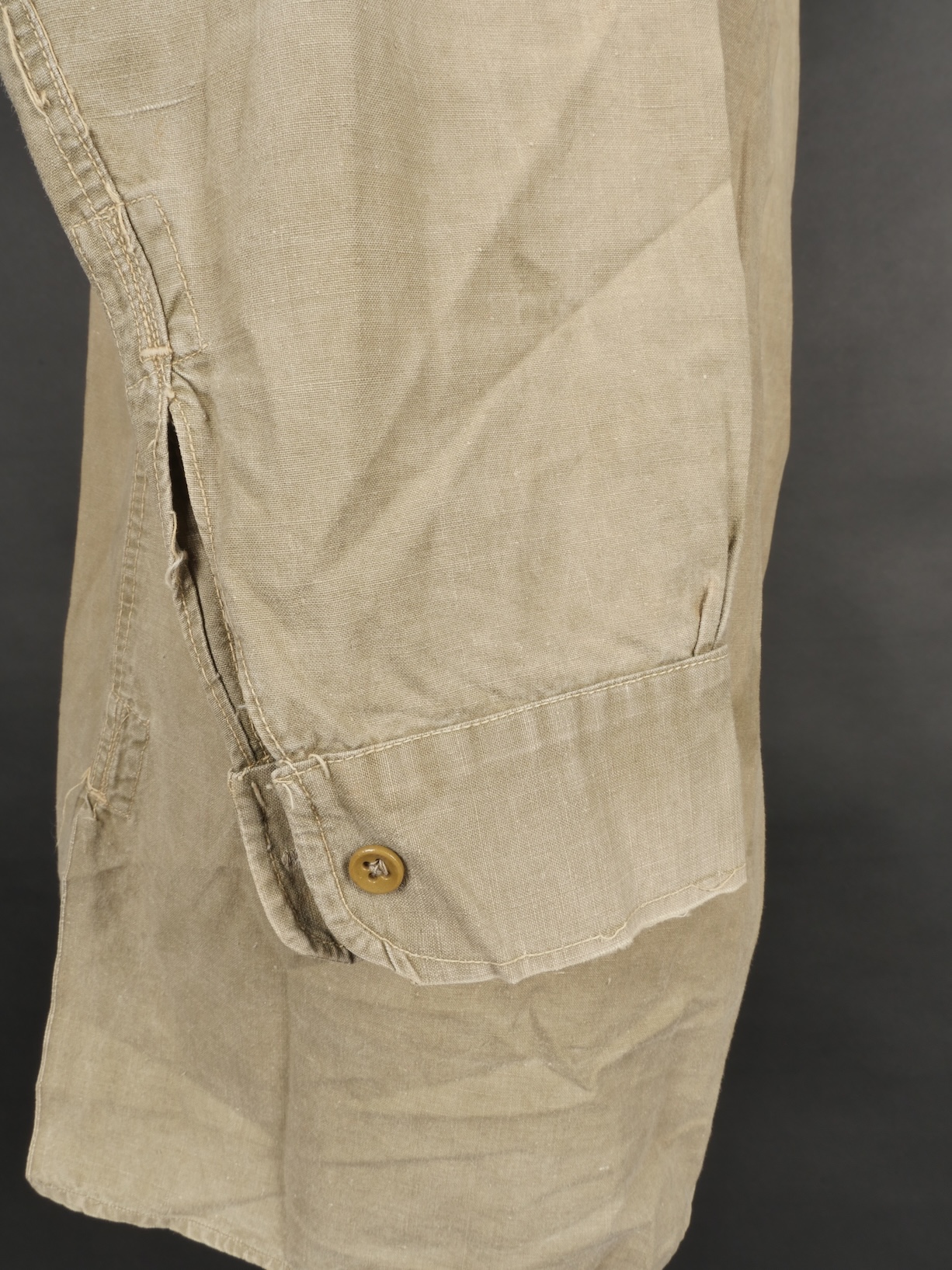 Chemise 1935. Modèle réglementaire en tissu kaki se fermant par trois boutons, boutons à l’arrière du col présents. Carré de drap sur la poitrine cousu d’origine. Bonne taille mannequin. Shirt 1935 Regulation model in khaki fabric closing with three buttons rear collar buttons present. Original stitched cloth patch on the chest. Good mannequin size and overall good condition.