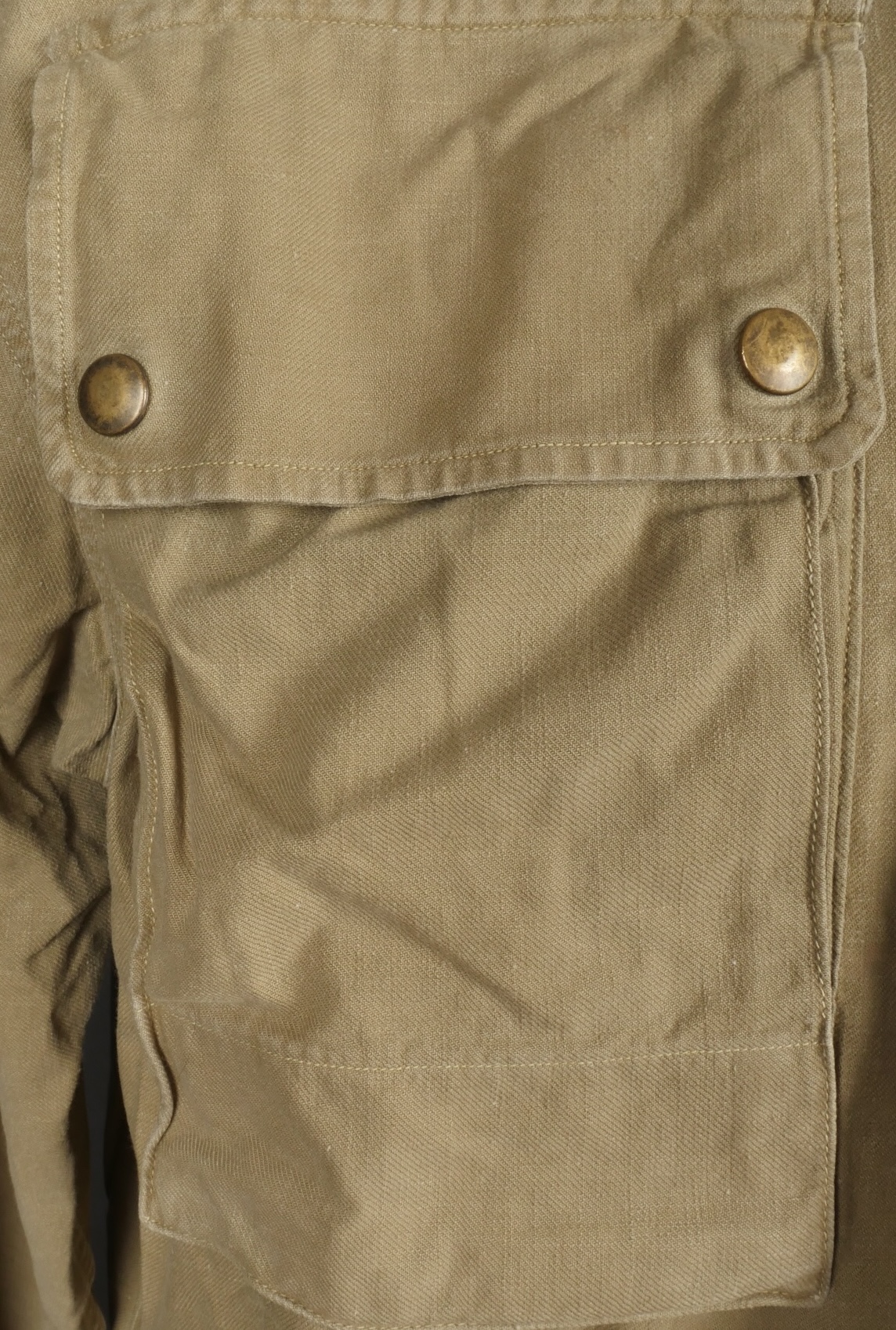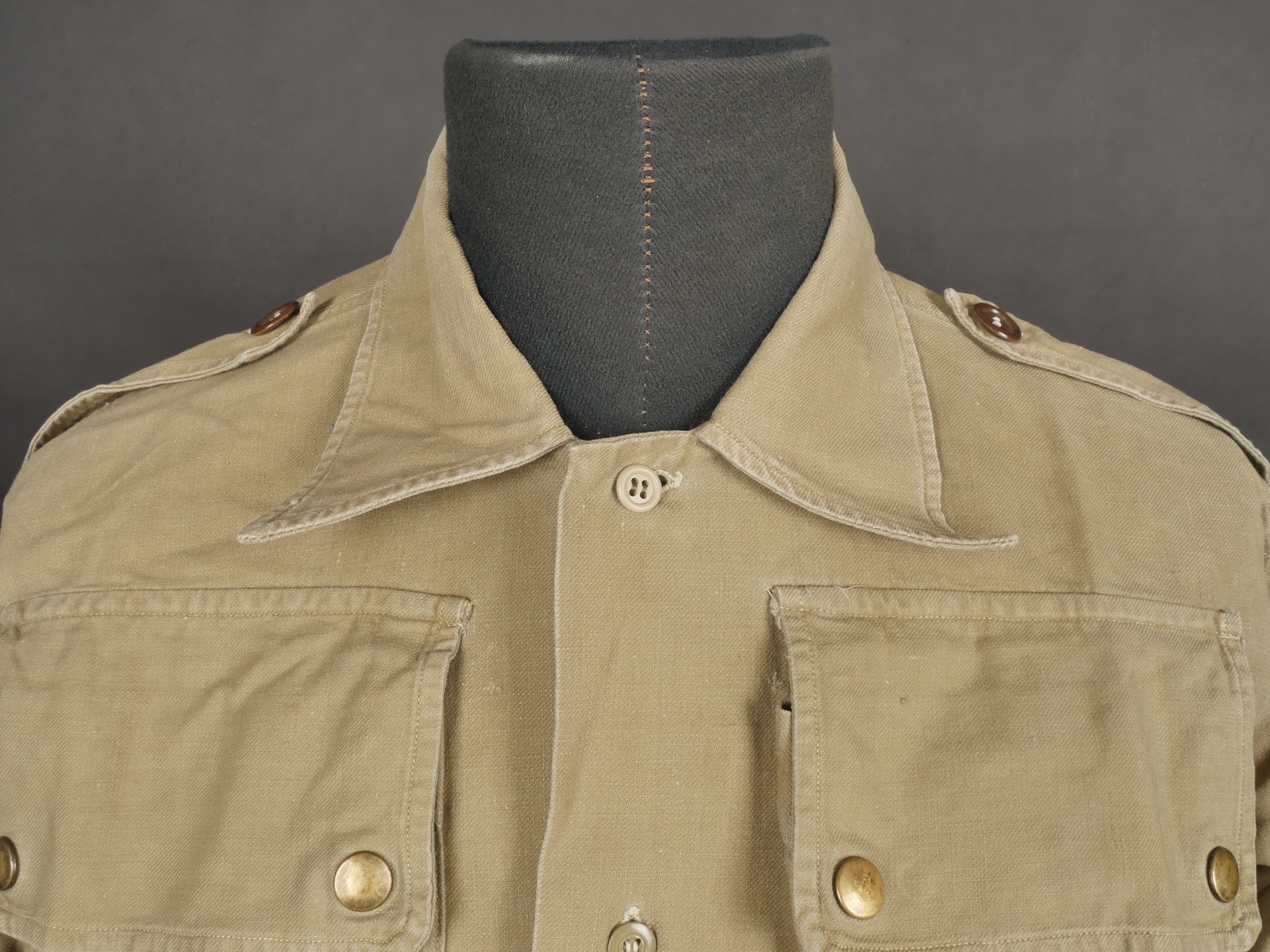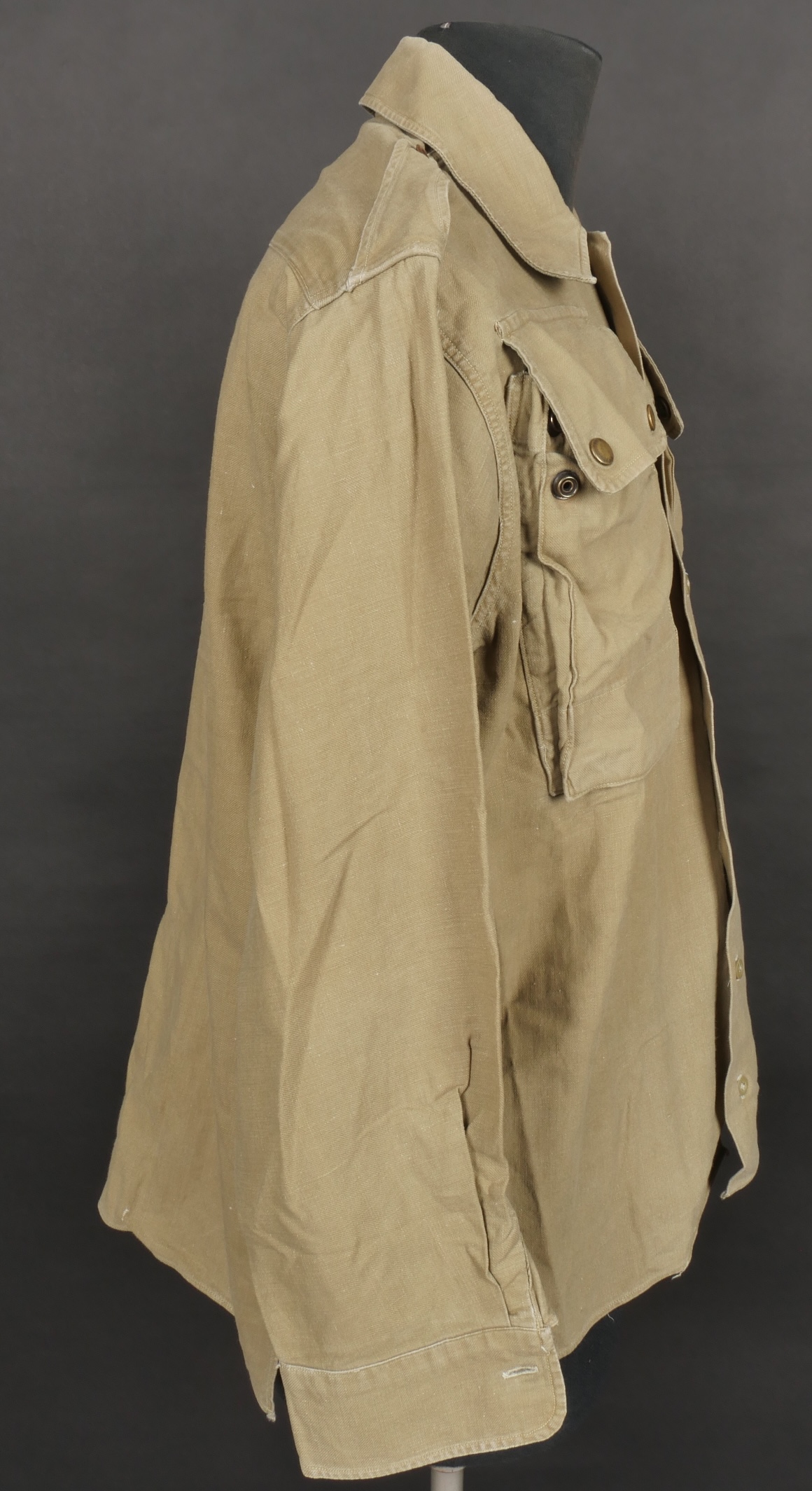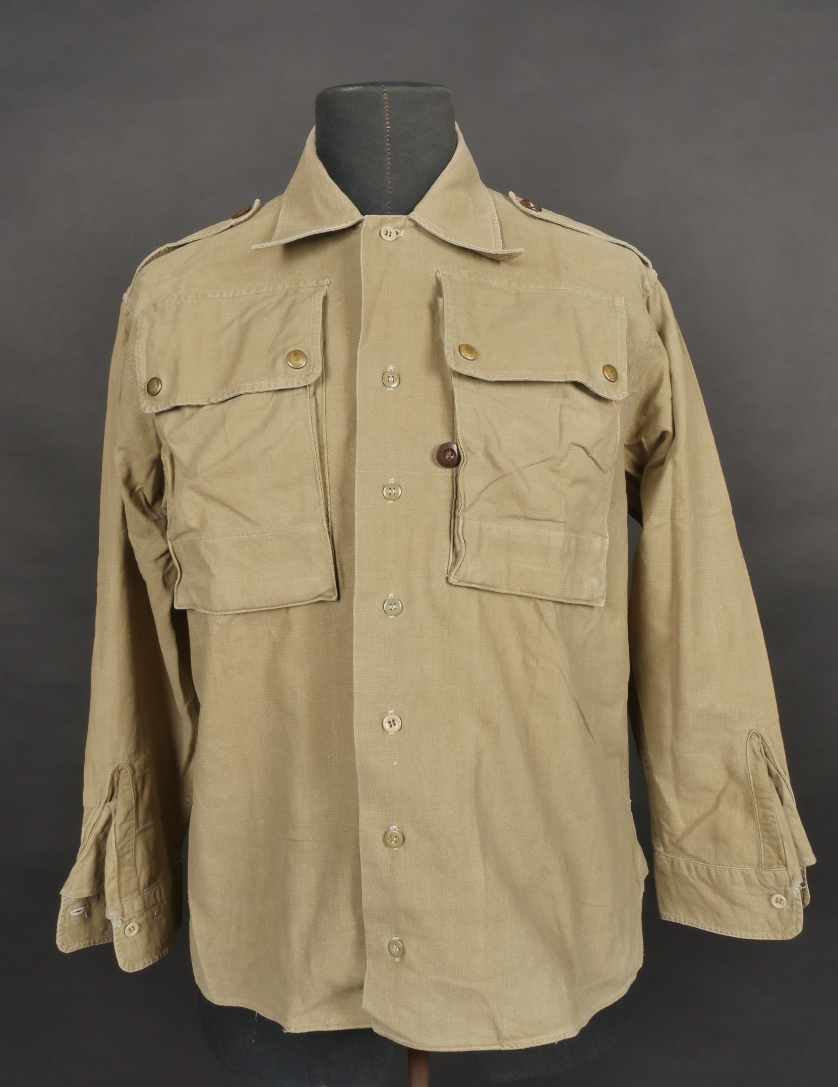 Chemise de saut. Confectionnée en toile kaki, deux poches de poitrine se fermant à l’aide de pressions, le parachutiste a cousu un bouton à côté de la poche de poitrine gauche destinée... en savoir plus