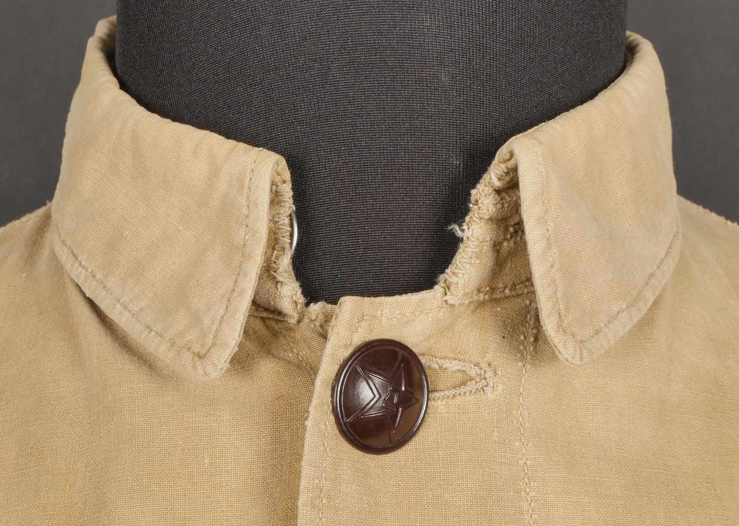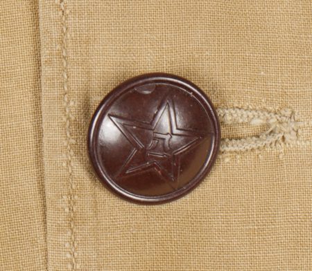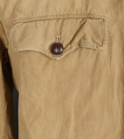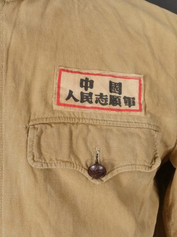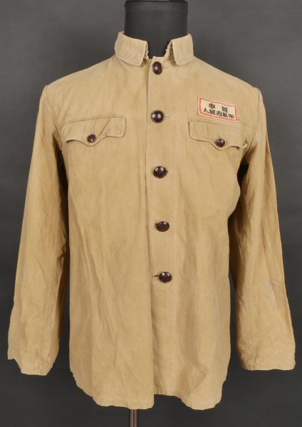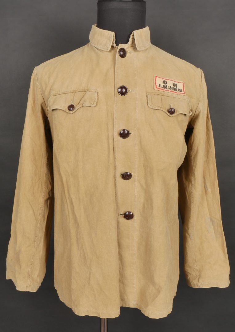 Chemise volontaire peuple chinois. Chemise troupe à deux poches et se fermant par cinq boutons de l’armée chinoise. Attribut en toile spécifique cousu d’origine au dessus de la poche de poitrine gauche. Chinese People’s Volunteer shirt. Soldier’s shirt with two pockets closing with five Chinese Army buttons. Original cloth insignia sewn above the left breast pocket.