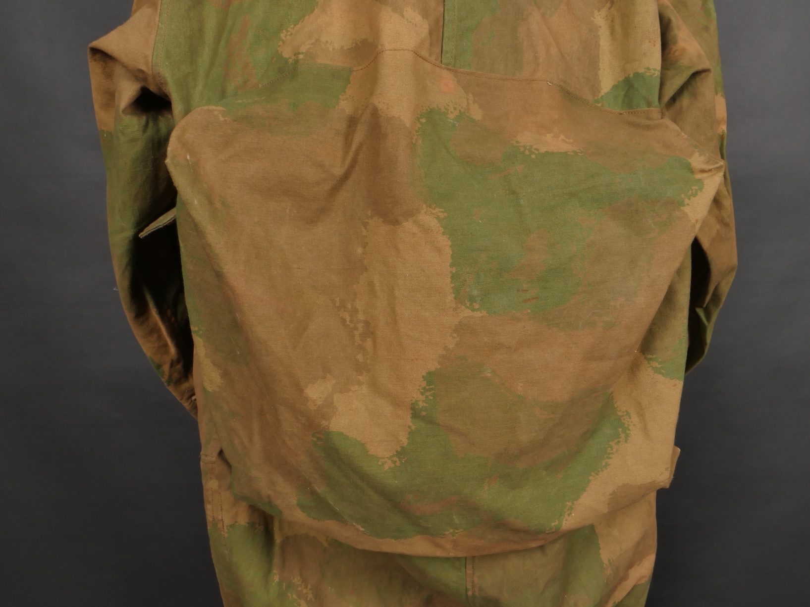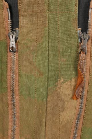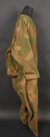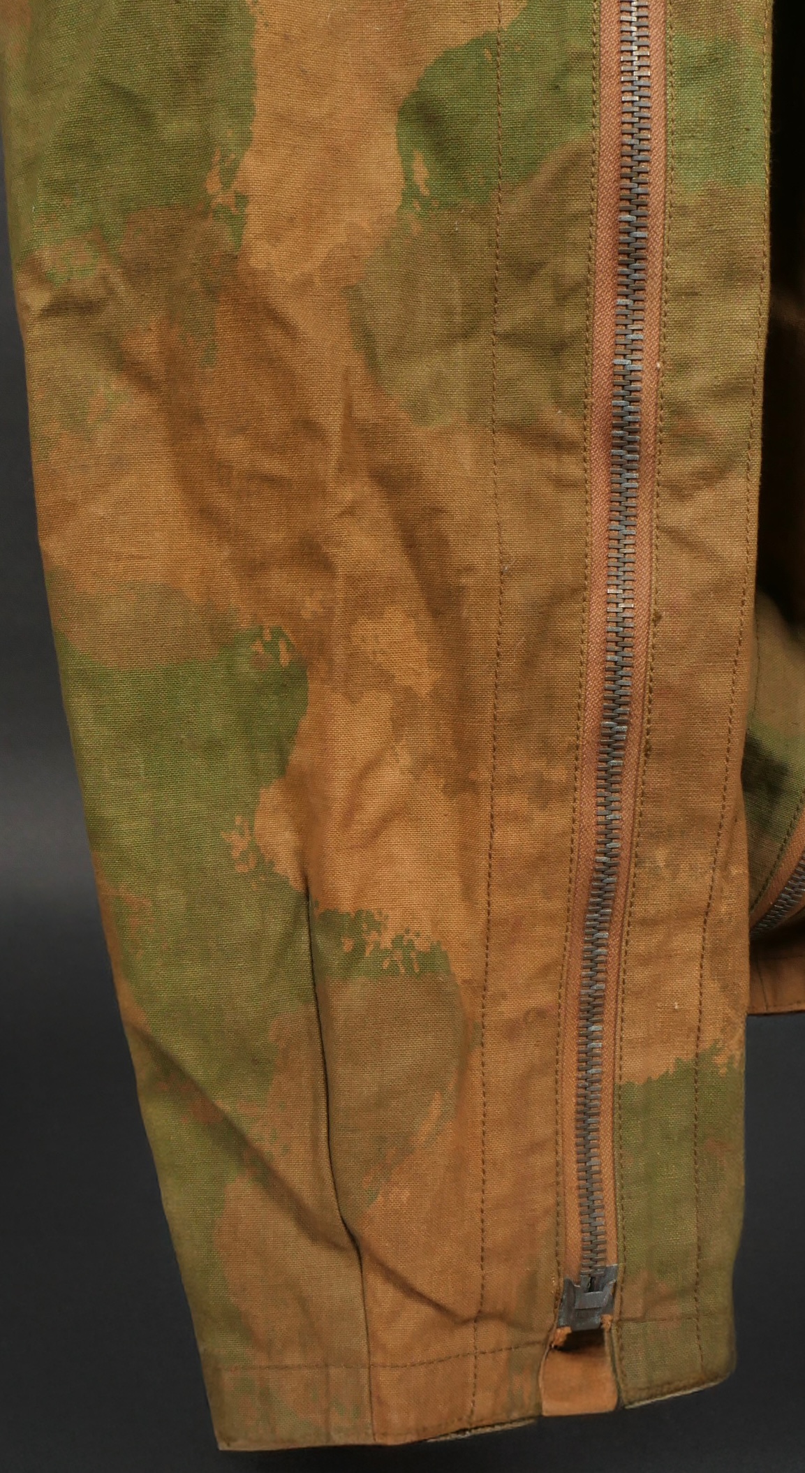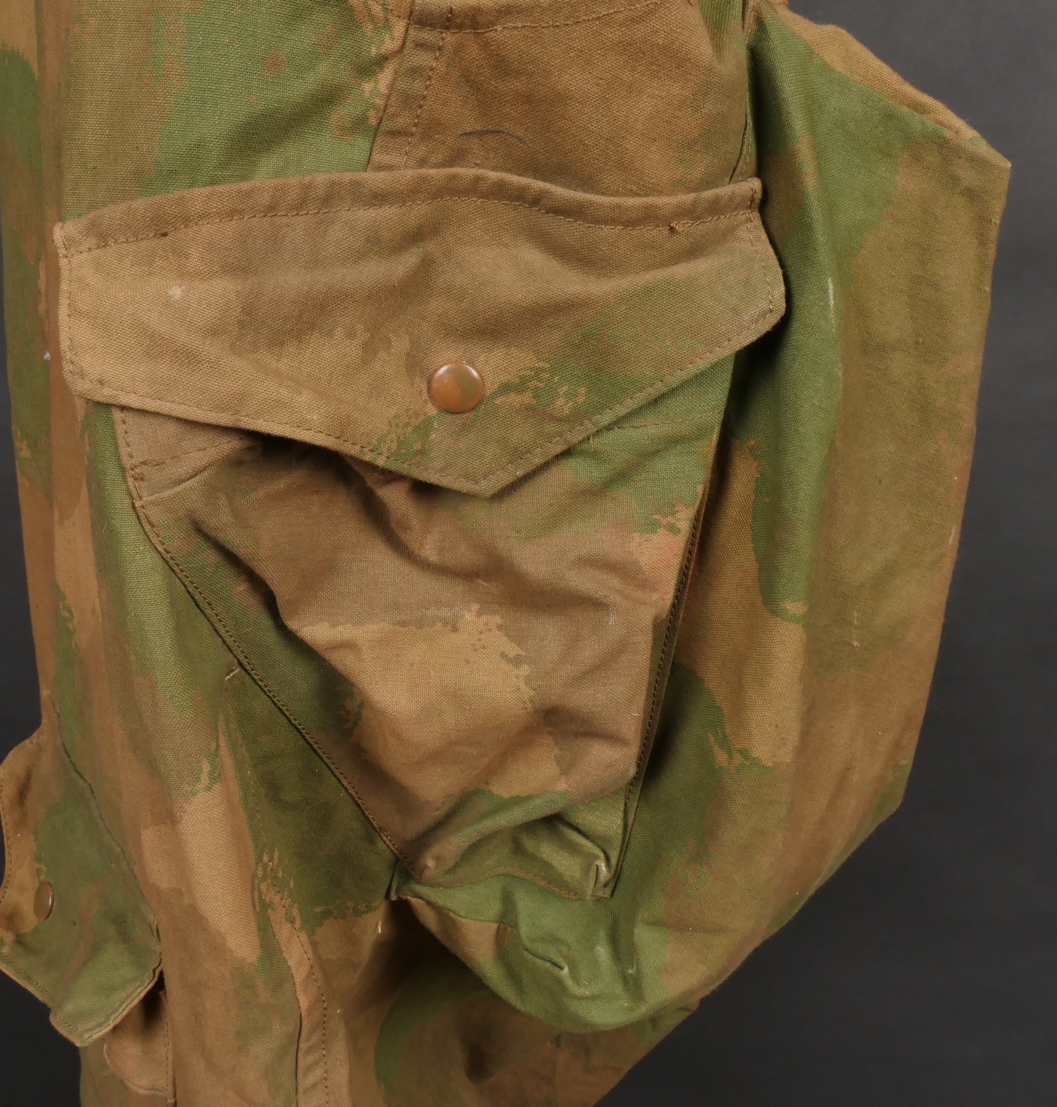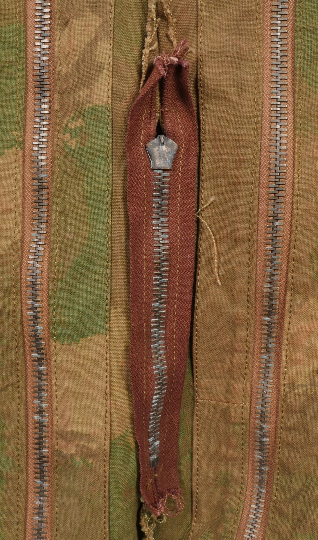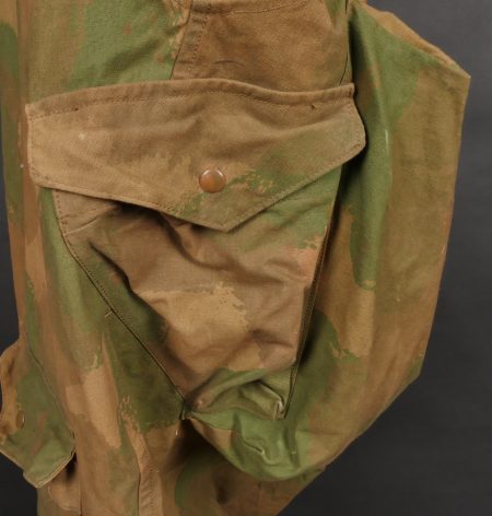 Combinaison de saut SOE. Rare combinaison de saut en toile camouflée quatre tons vert, brun, ocre et noir. Couleurs très fraiches, fermeture centrale par deux fermetures éclaires marquées AMC,... en savoir plus