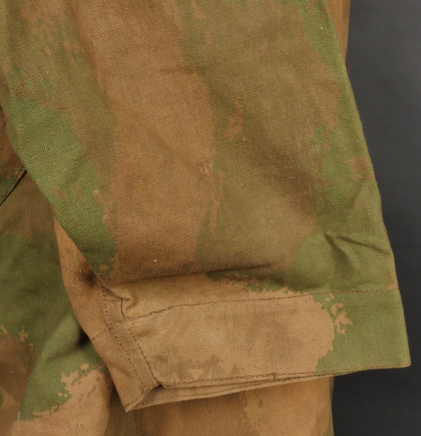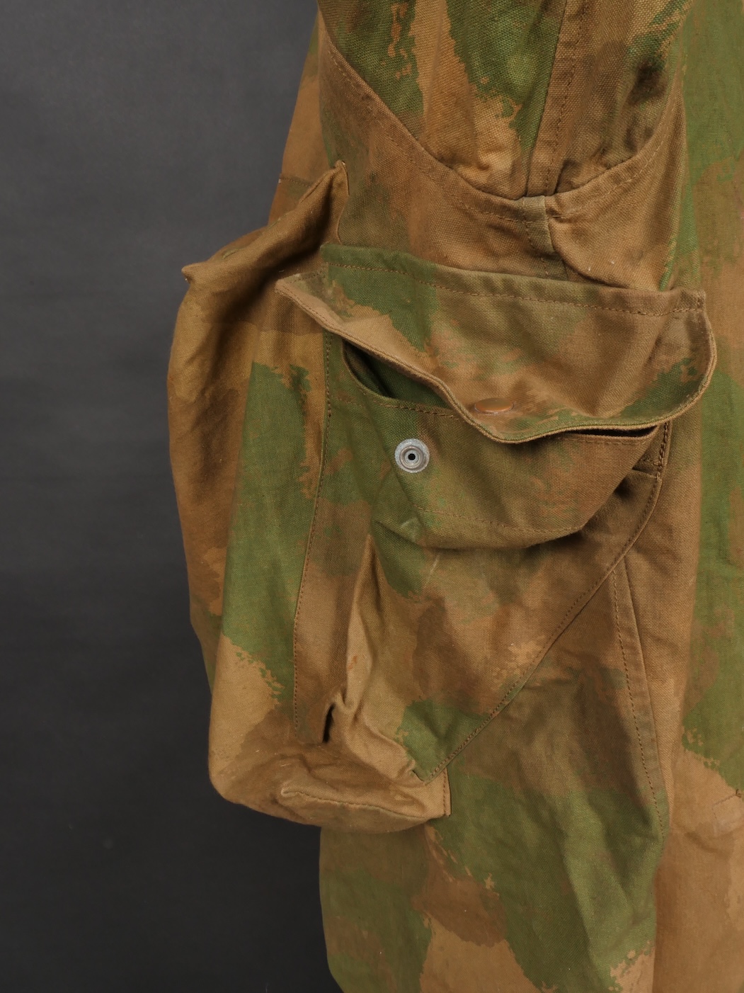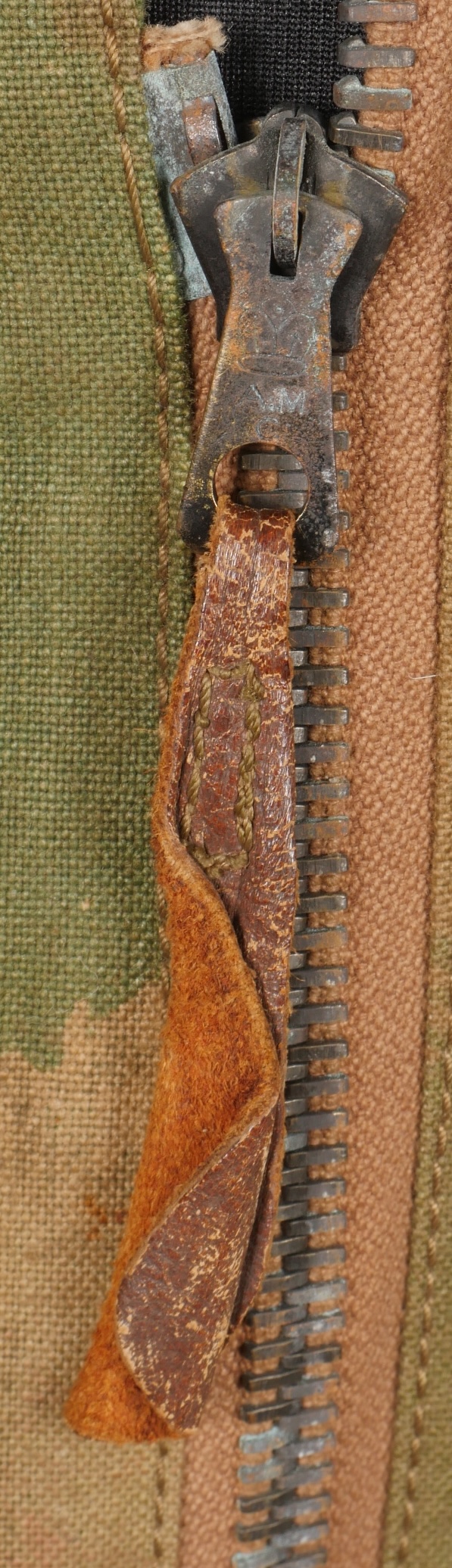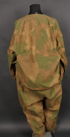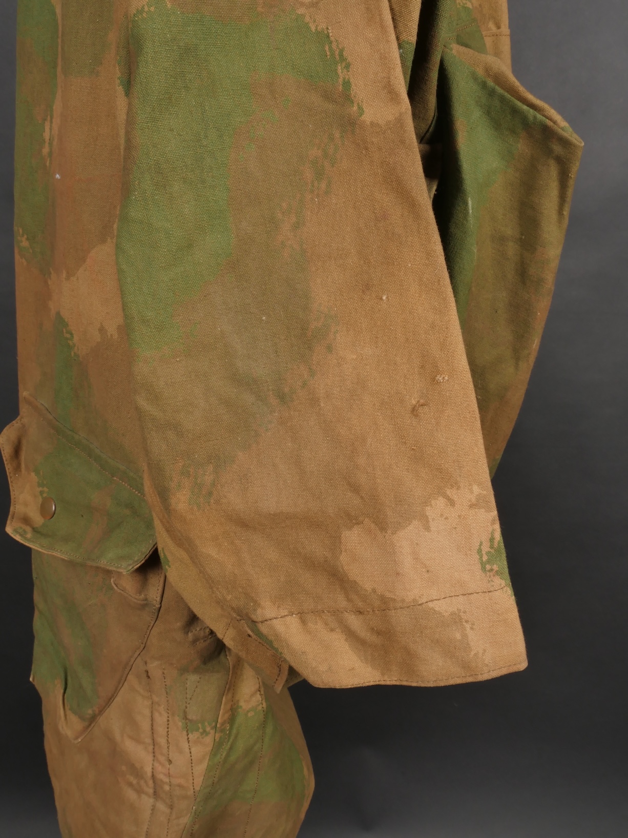 Combinaison de saut SOE. Rare combinaison de saut en toile camouflée quatre tons vert, brun, ocre et noir. Couleurs très fraiches, fermeture centrale par deux fermetures éclaires marquées AMC,... en savoir plus