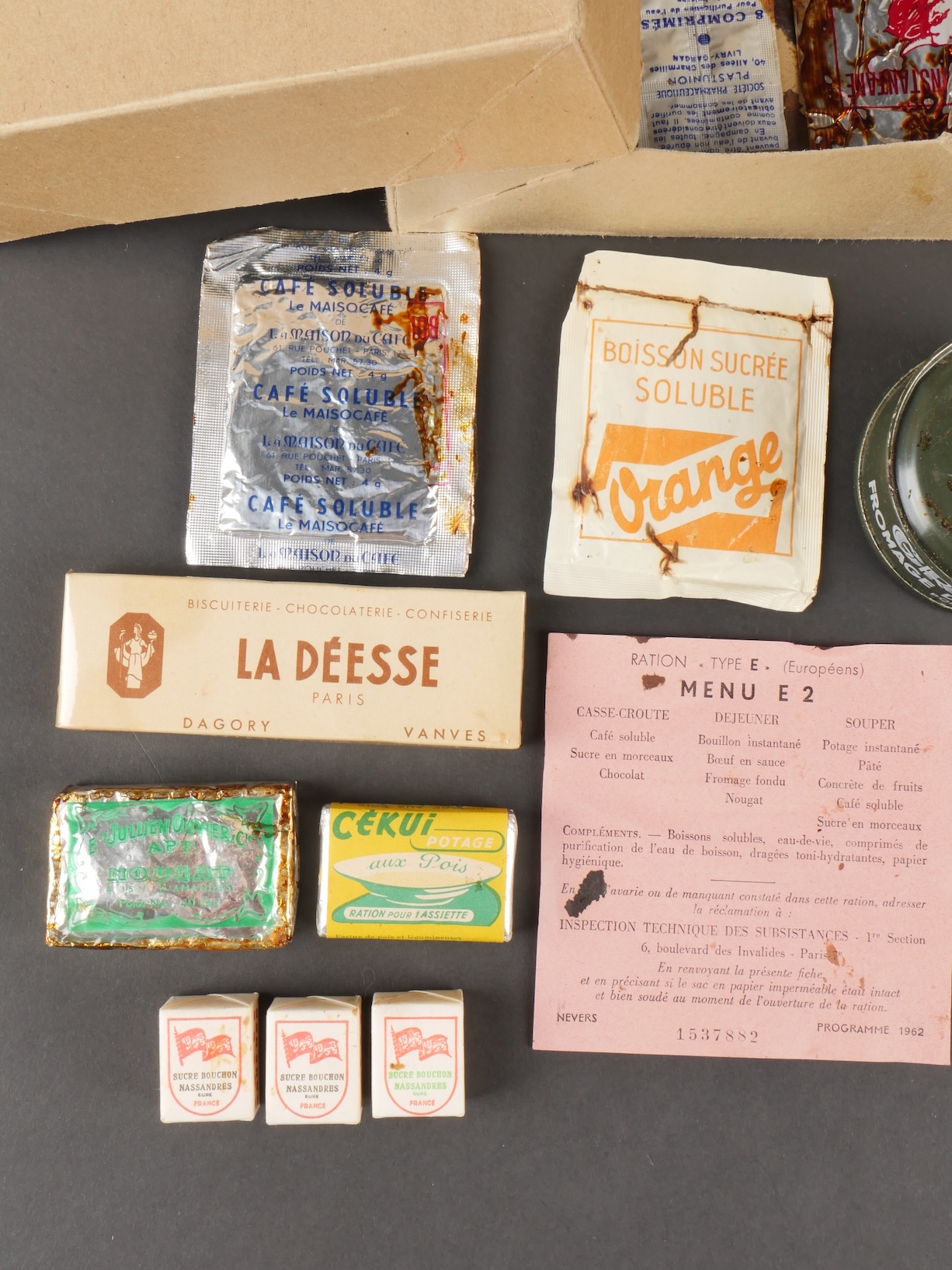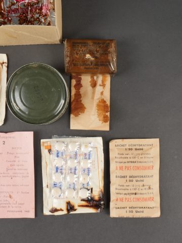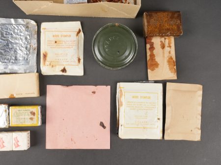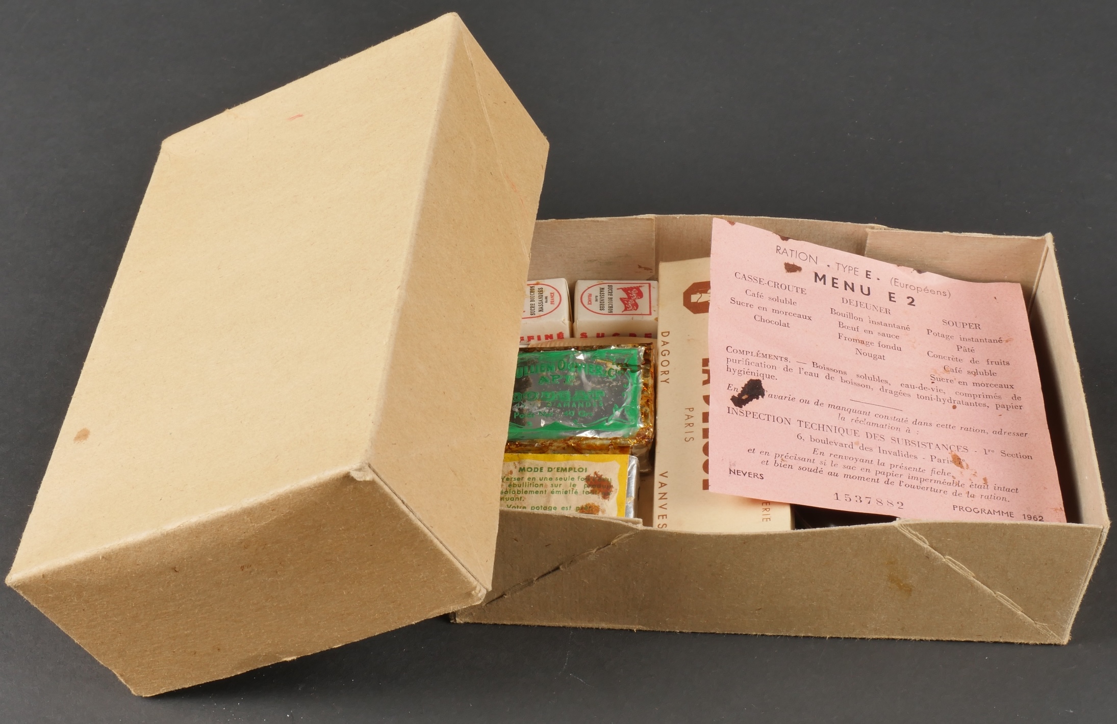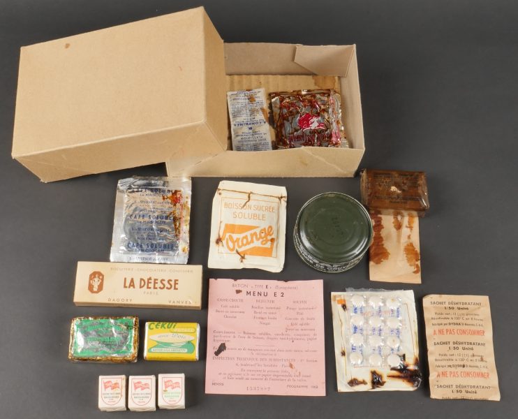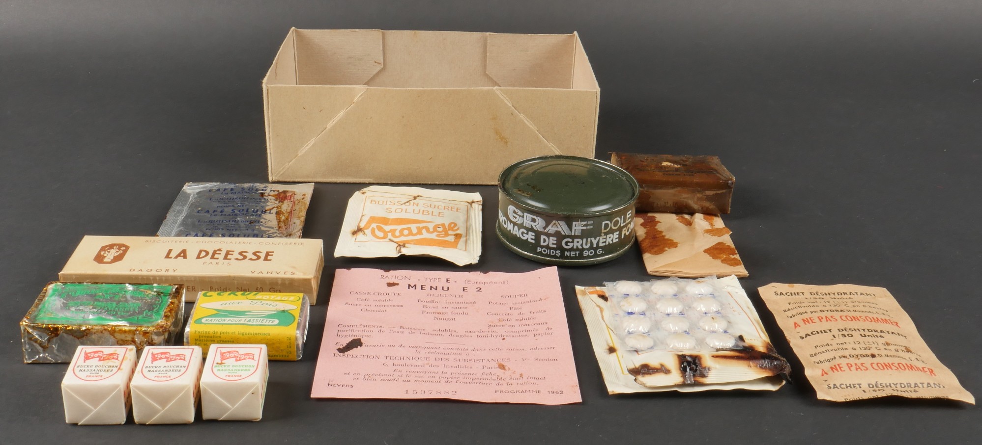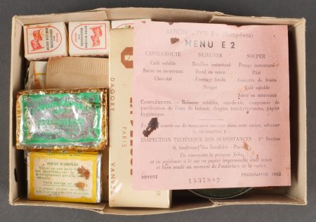 Contenu d’une ration Type E. Menu E2 indiquant la date 1962 comprenant un fromage gruyère fondu, un potage, trois sucres, du nougat, de la pâte de coin, un sachet déshydratant, deux... en savoir plus