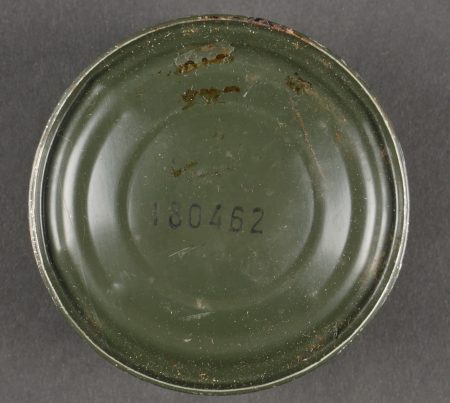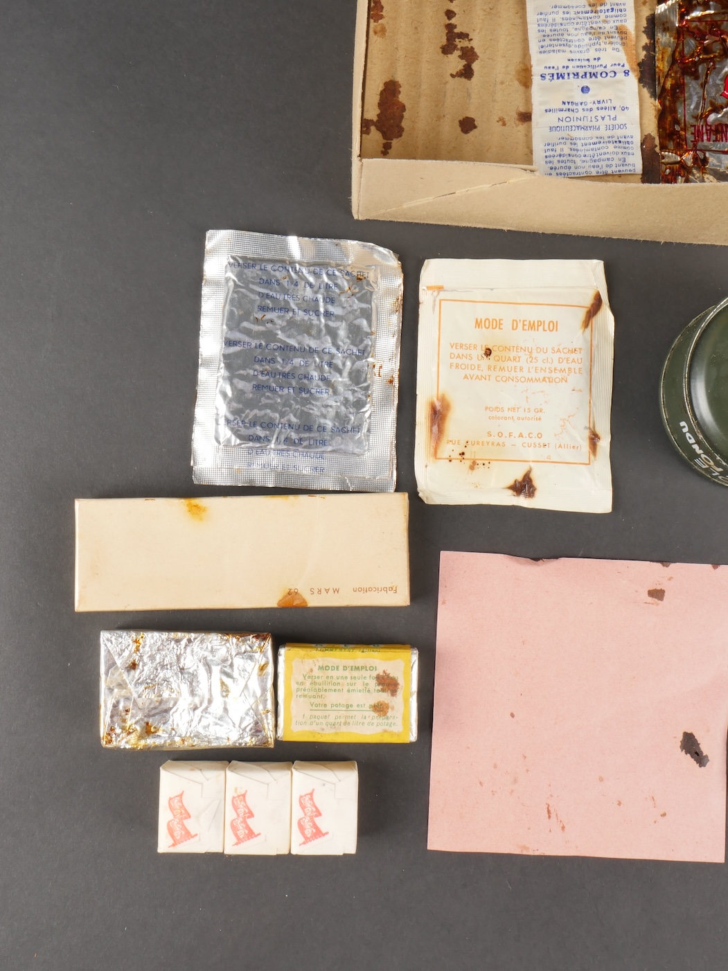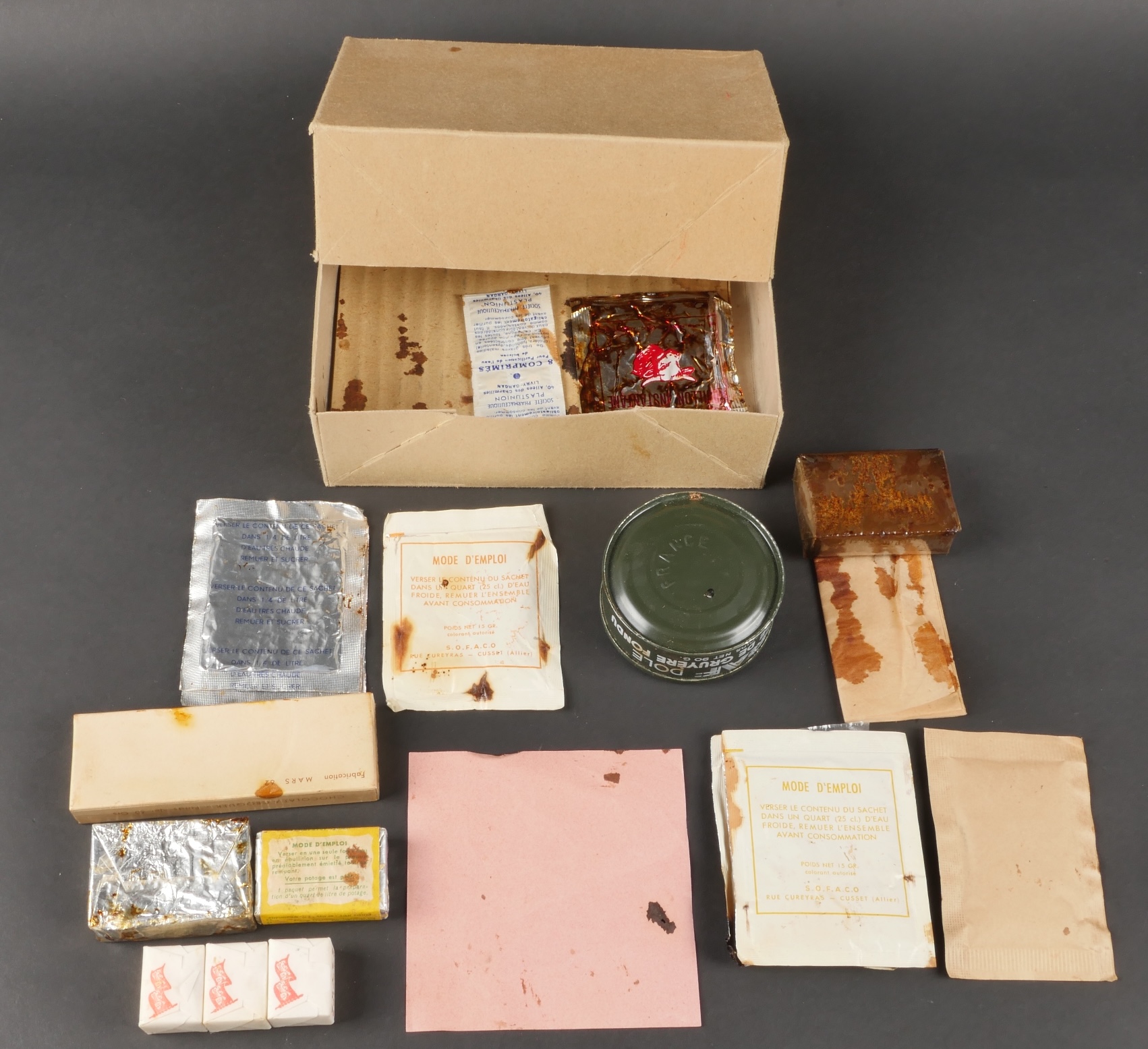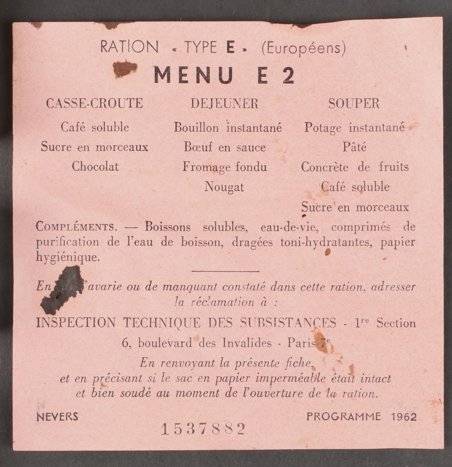 Contenu d’une ration Type E. Menu E2 indiquant la date 1962 comprenant un fromage gruyère fondu, un potage, trois sucres, du nougat, de la pâte de coin, un sachet déshydratant, deux... en savoir plus