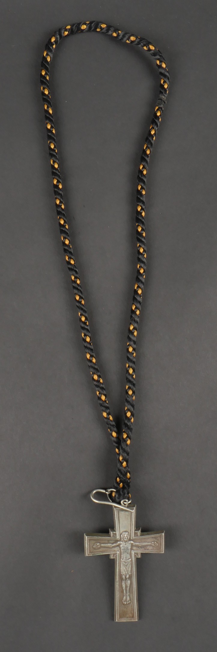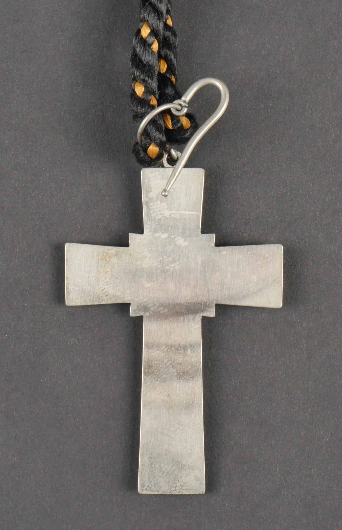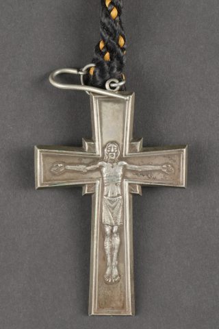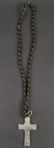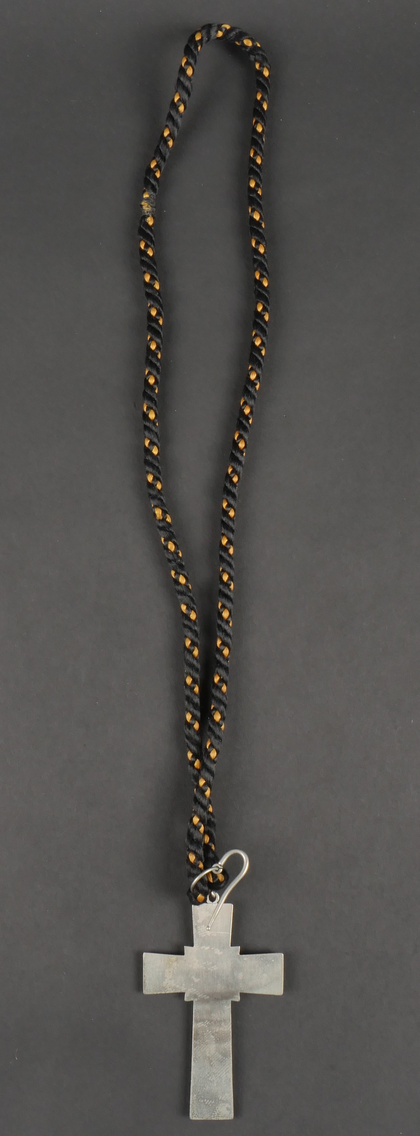 Croix pectorale d’Aumonier militaire catholique modèle 1953, fabriquée en maillechort blanc, anneau et crochet de boutonnière d’origine. Poinçons au revers corne d’abondance et Mchort pour maillechort. Cordon tressé en coton noir et orange. Pectoral cross for Catholic military chaplain model 1953 made of white nickel silver with original ring and buttonhole hook. Hallmarks on reverse with cornucopia and Mchort for maillechort. Braided cotton cord in black and orange.