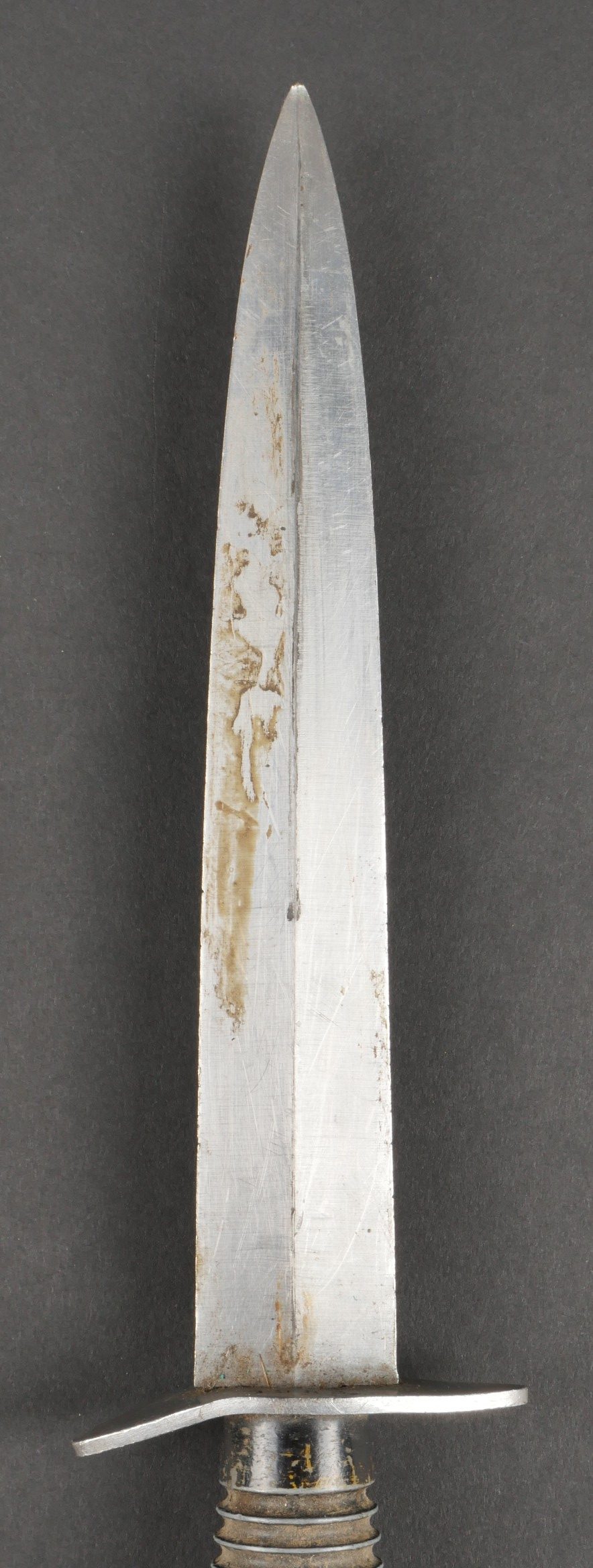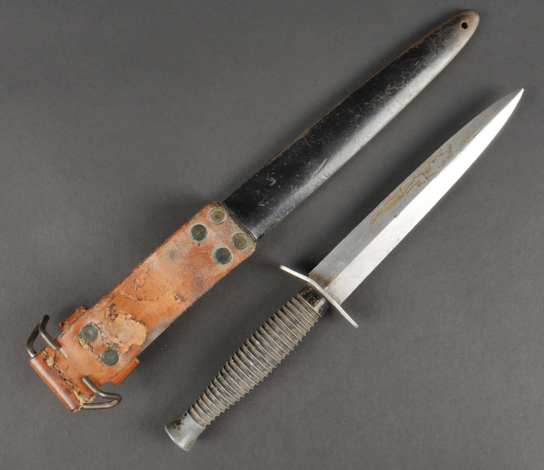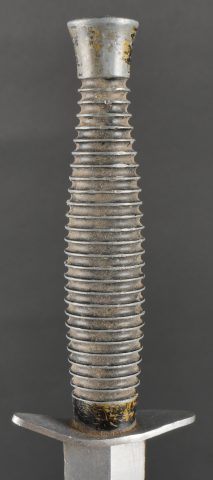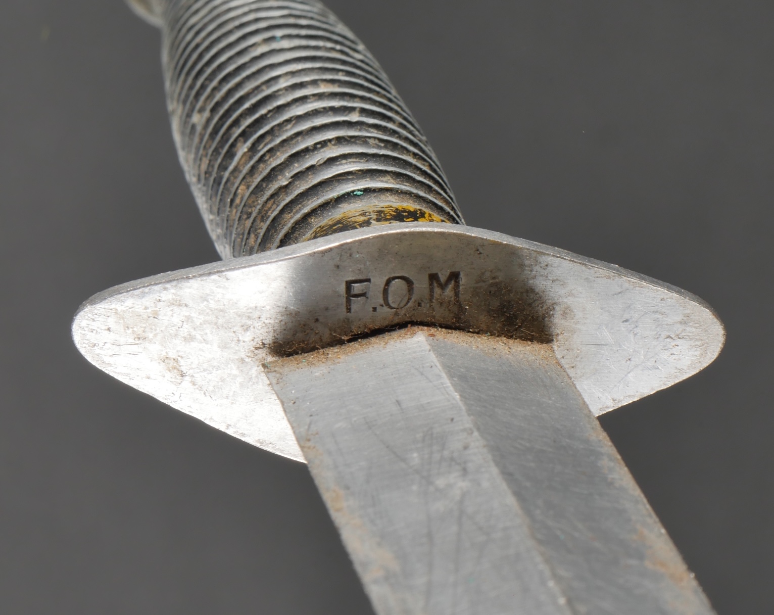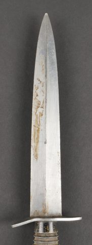 Dague Le Commando dite FOM. Poignée moulée en zamak comportant 26 cannelures, en peinture noire mat. Garde d’origine possédant un pan incliné, ainsi que le marquage FOM pour Force... en savoir plus