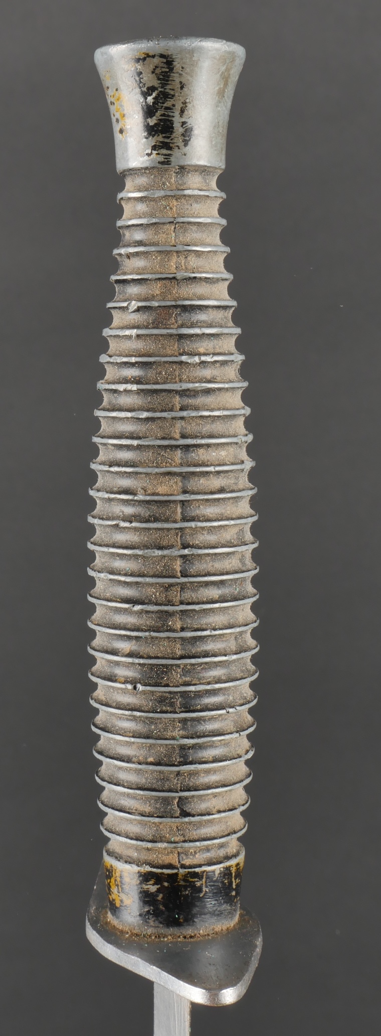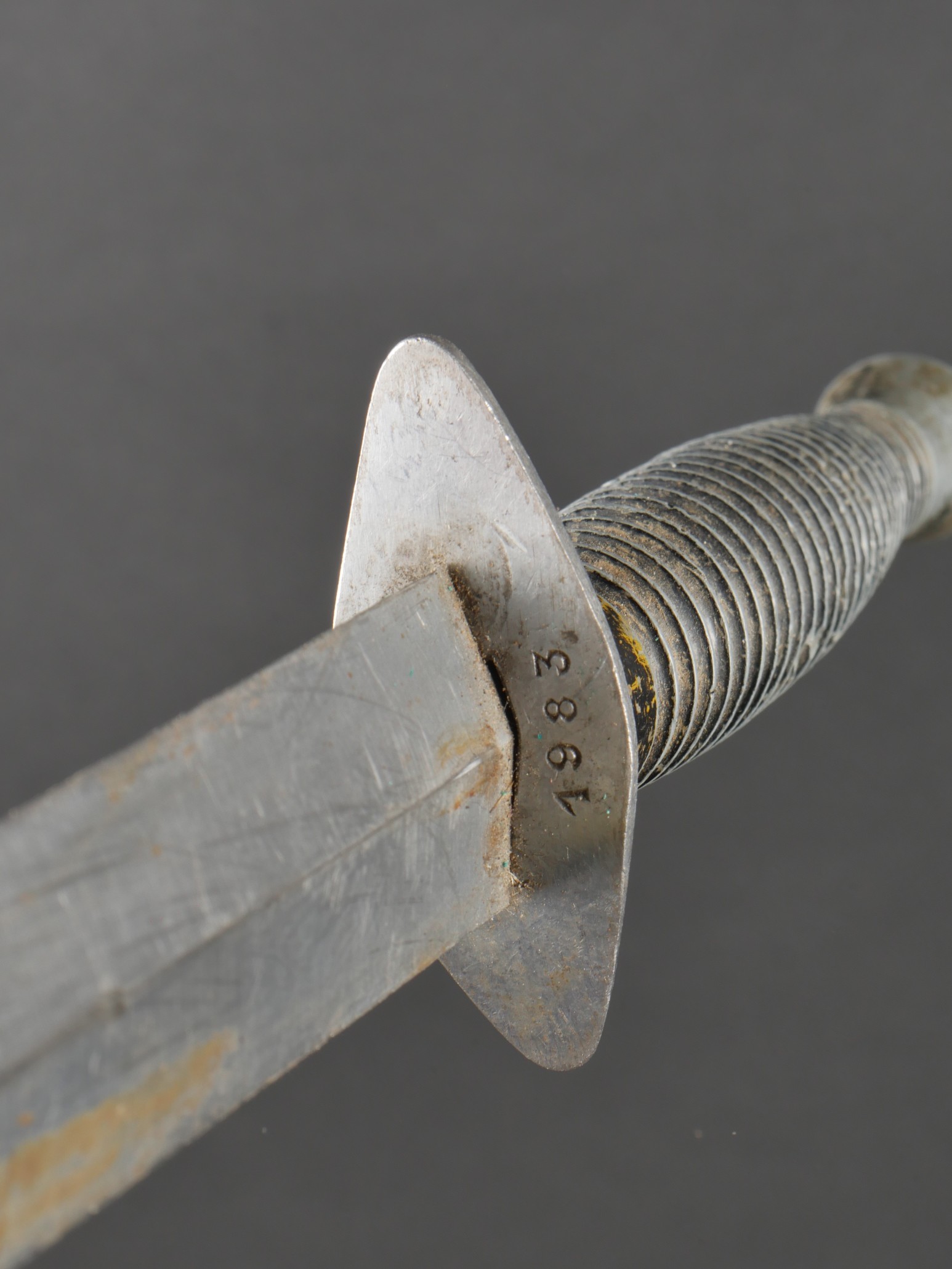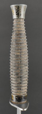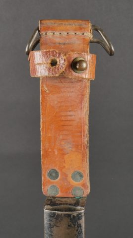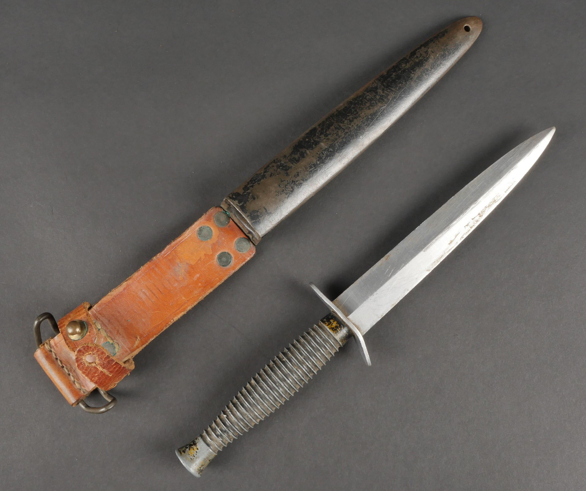 Dague Le Commando dite FOM. Poignée moulée en zamak comportant 26 cannelures, en peinture noire mat. Garde d’origine possédant un pan incliné, ainsi que le marquage FOM pour Force... en savoir plus