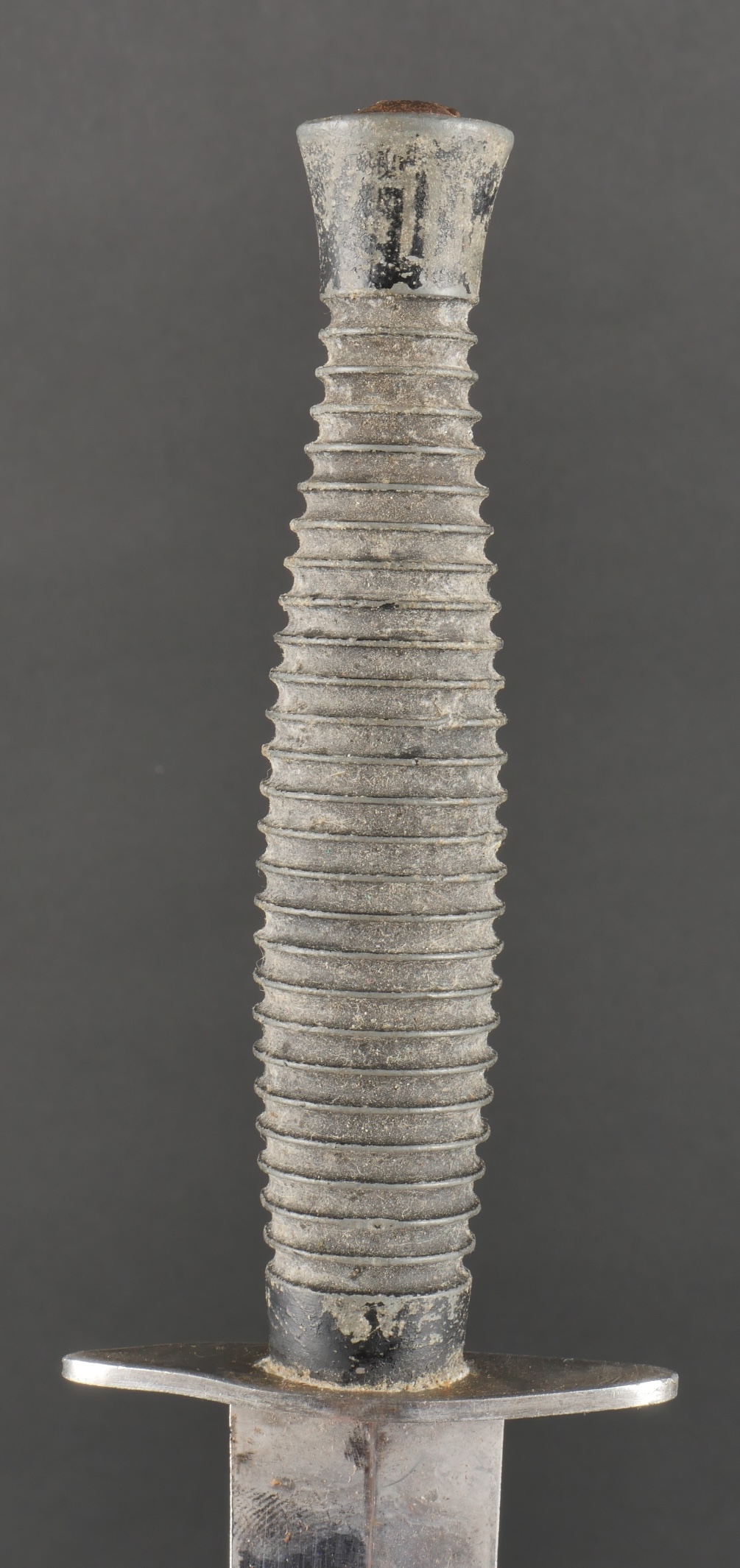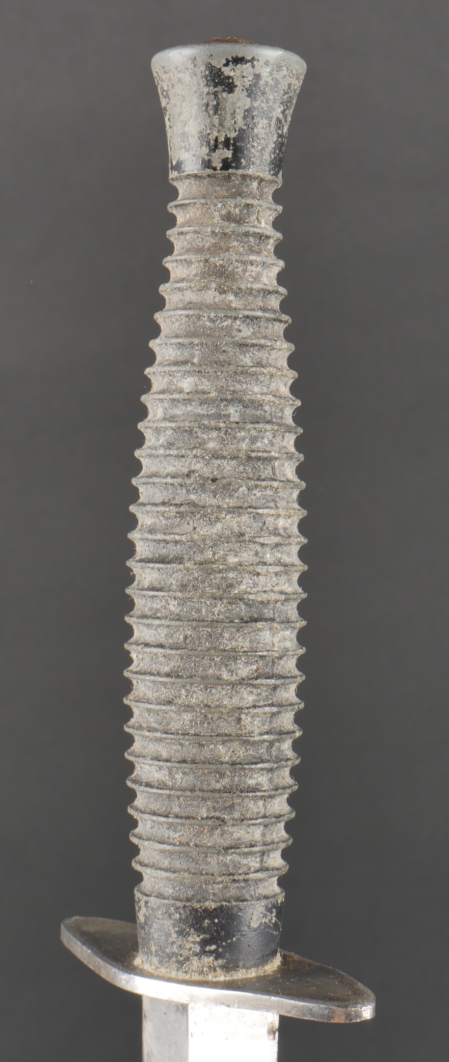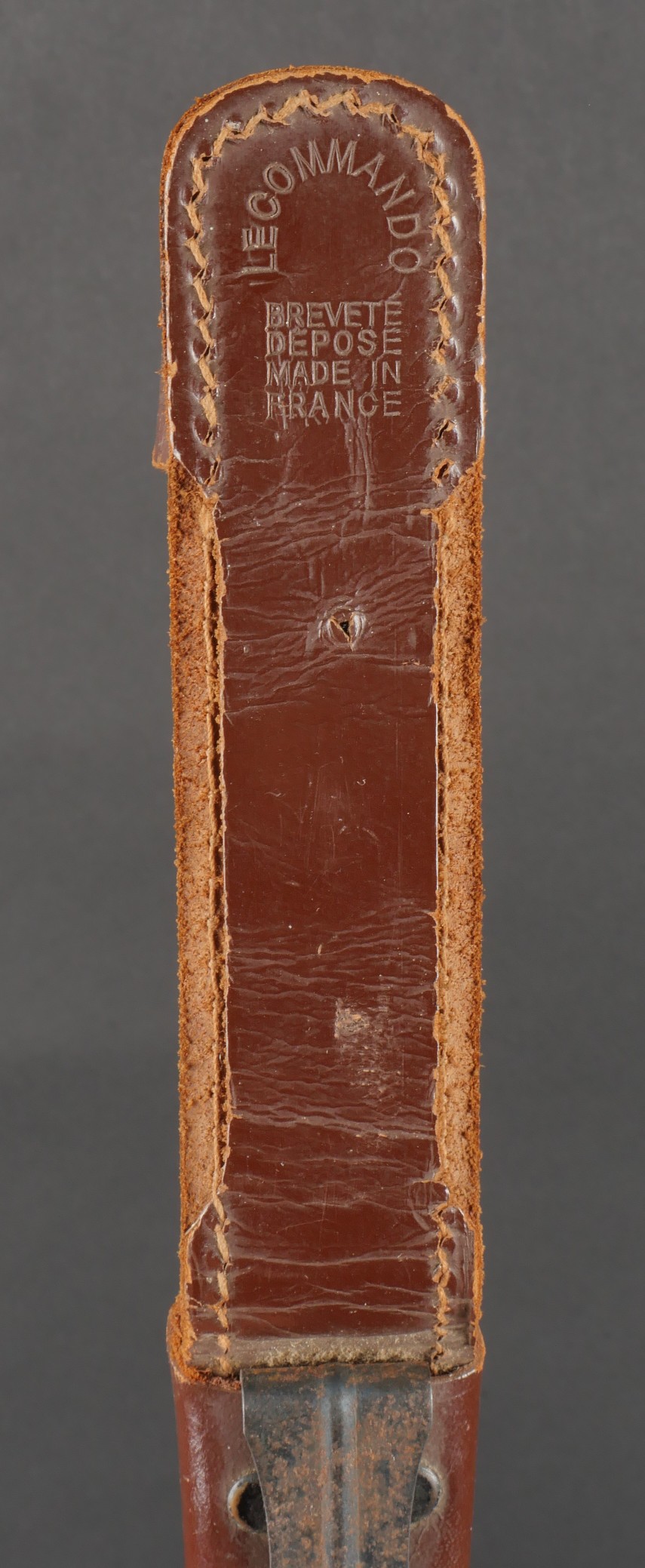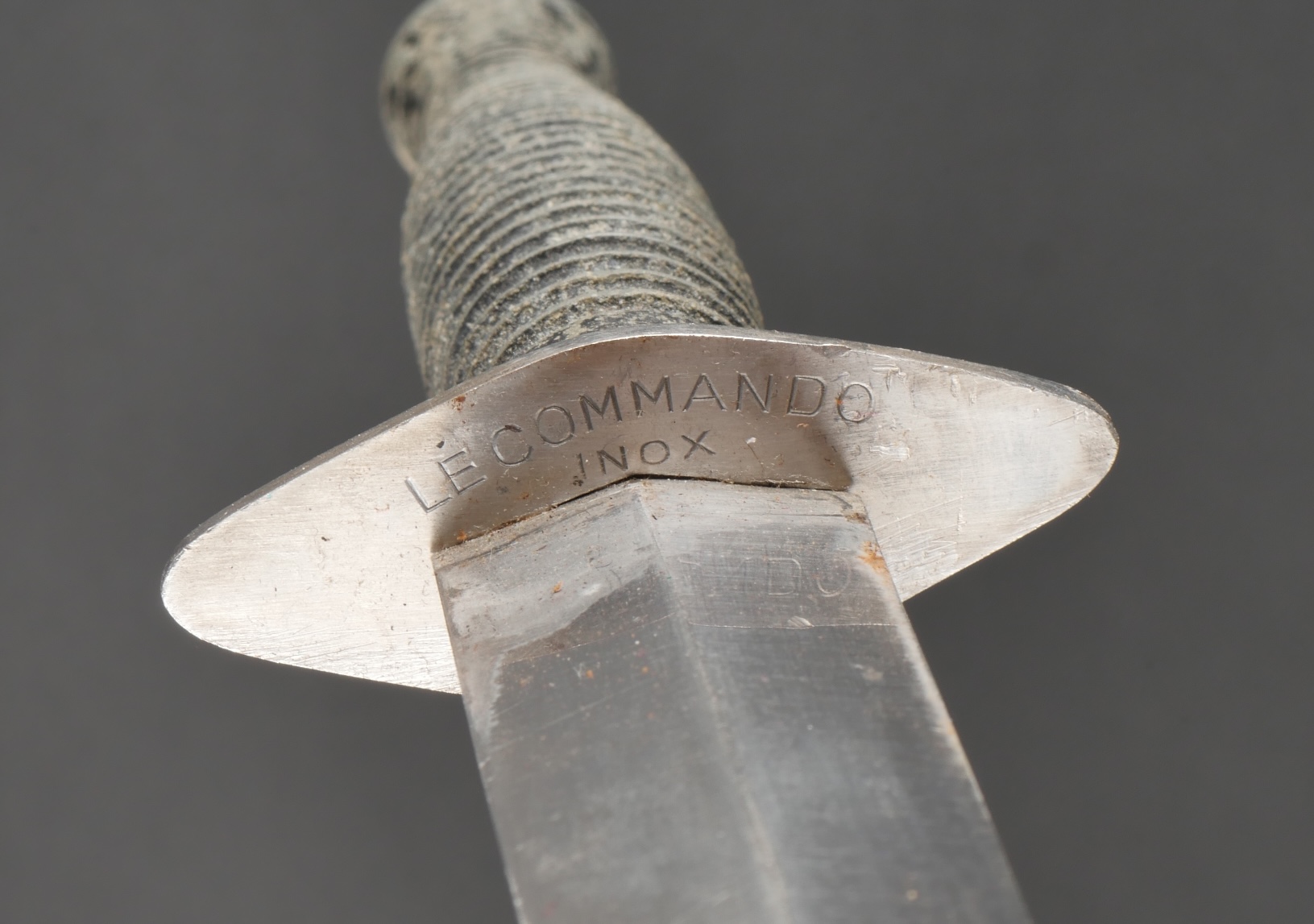 Dague Le Commando. Poignée moulée en zamak comportant 26 cannelures, avec de restes de peinture noire mat. Garde d’origine possédant le marquage Le Commando Inox Marque & modèle... en savoir plus