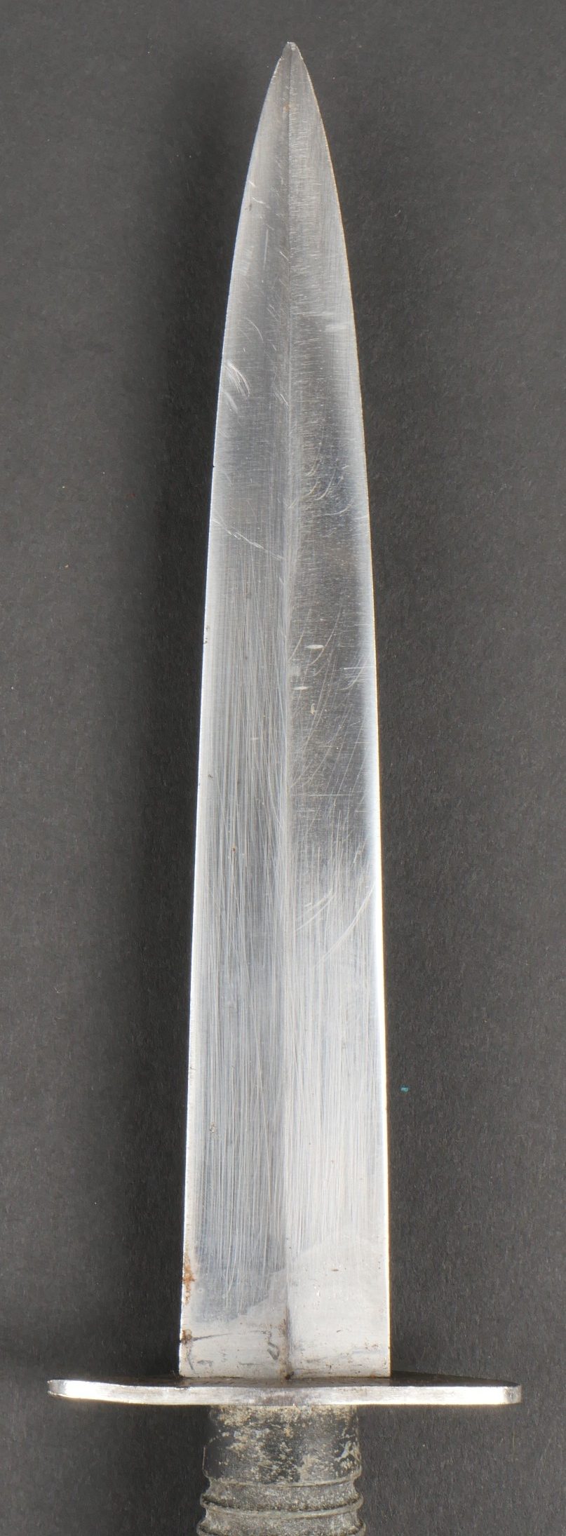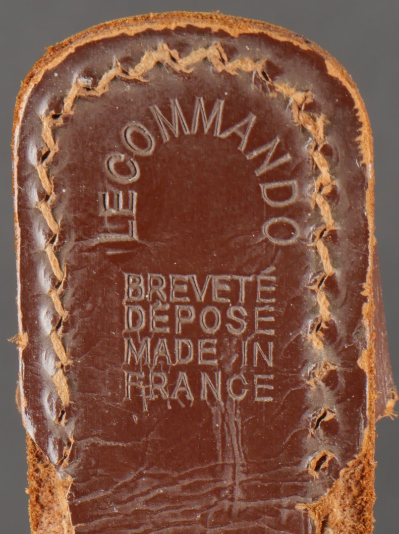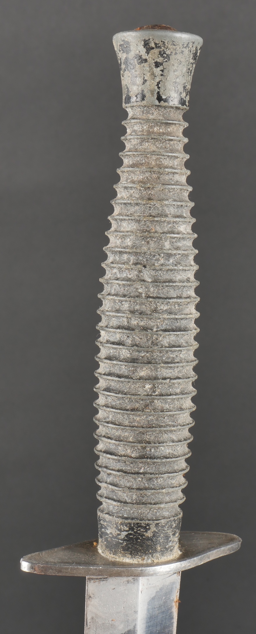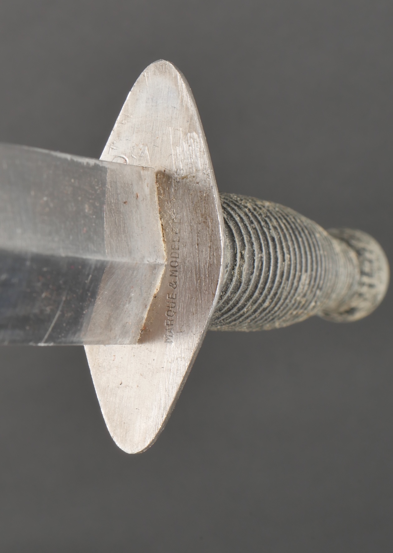 Dague Le Commando. Poignée moulée en zamak comportant 26 cannelures, avec de restes de peinture noire mat. Garde d’origine possédant le marquage Le Commando Inox Marque & modèle... en savoir plus