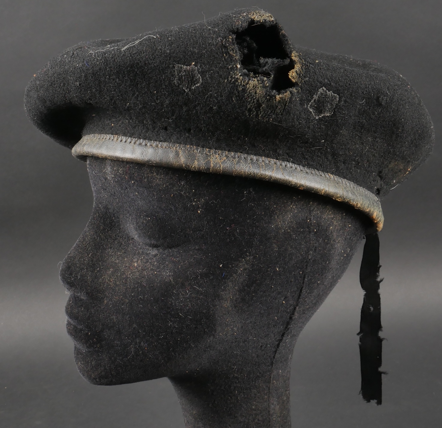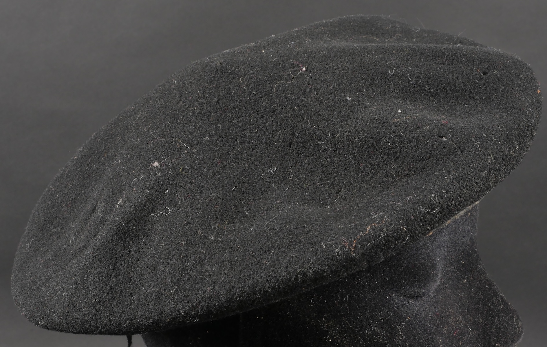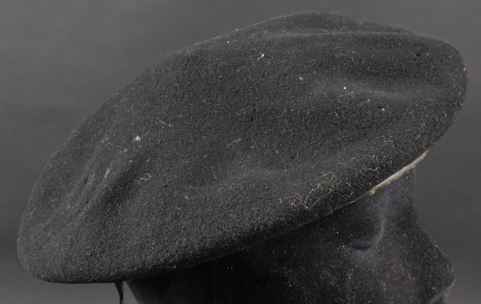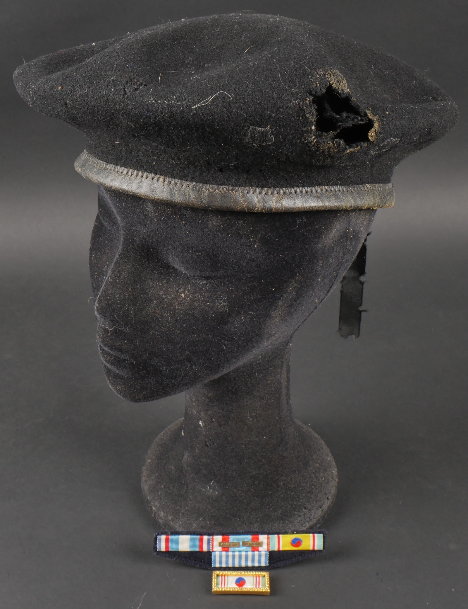 Ensemble Bataillon de Corée. Comprenant un béret spécifique à l’unité du bataillon français en Corée, confectionné e laine noire, deux gros œillets en aluminium, taille 57. A noter... en savoir plus