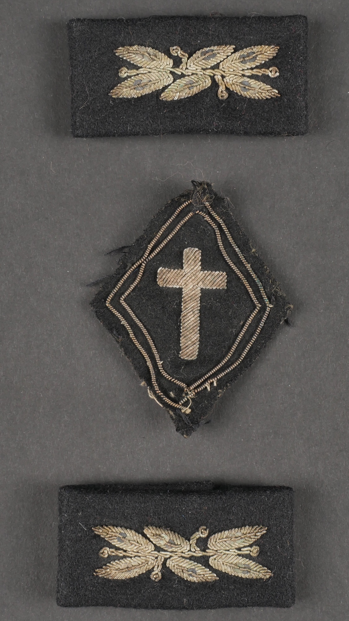 Ensemble comprenant une paire d’insigne de fonction en drap noir passants d’épaule pour Aumônier militaires Auxiliaires ainsi que pour les Aumôniers desservants locaux territoriaux,... en savoir plus