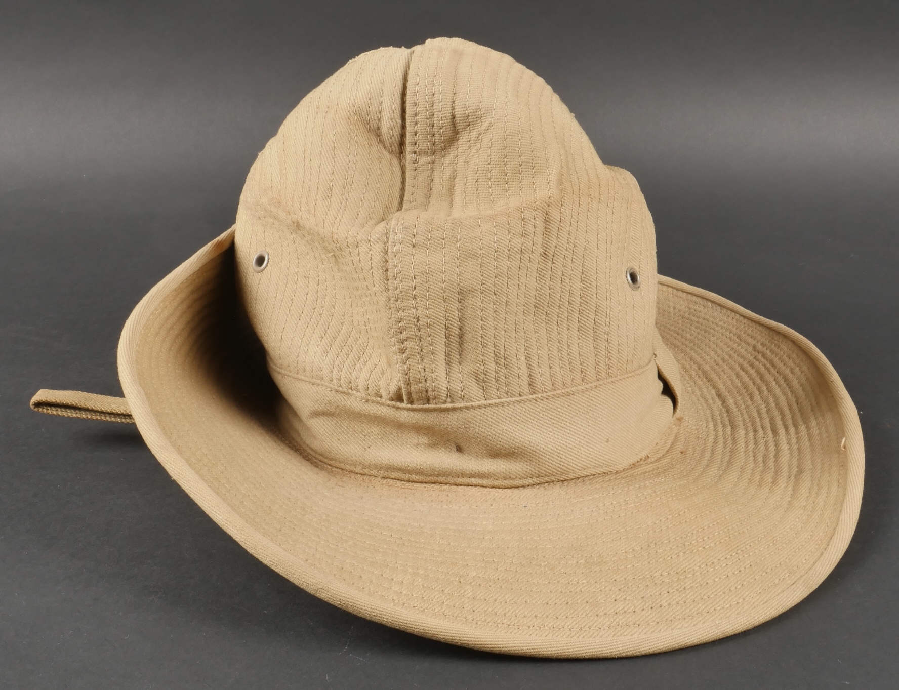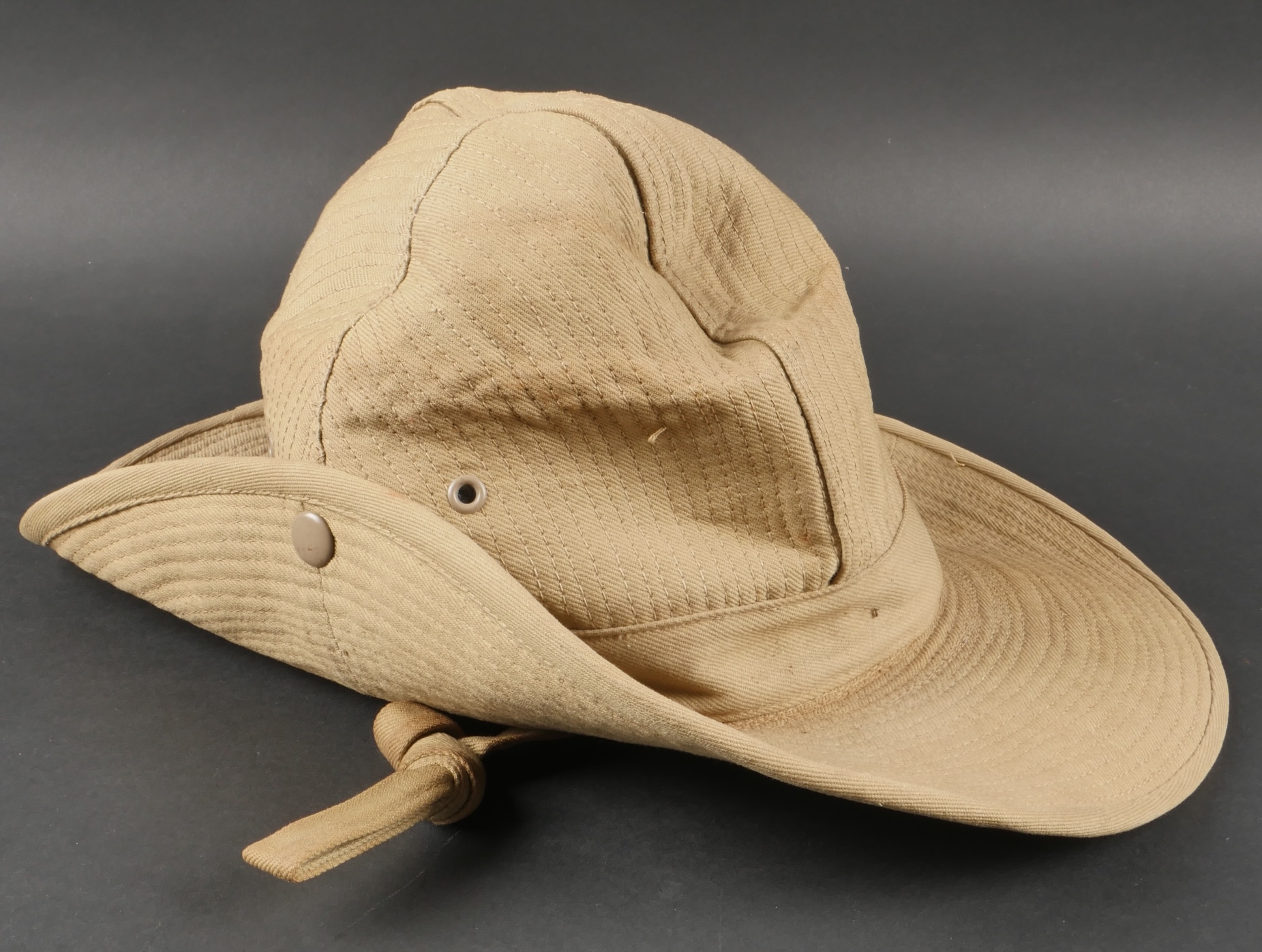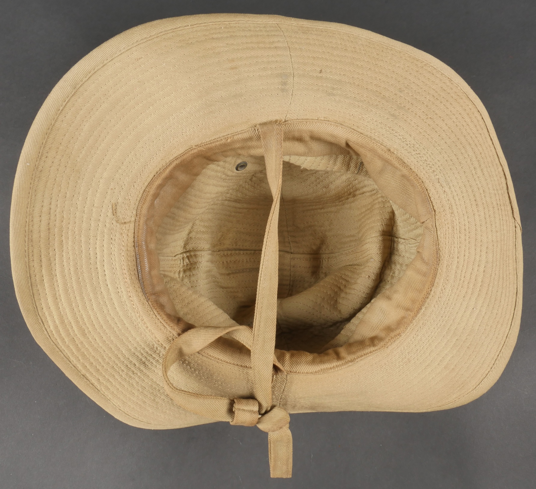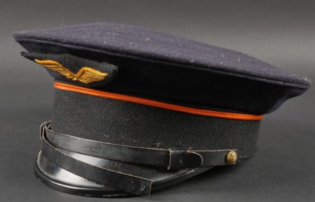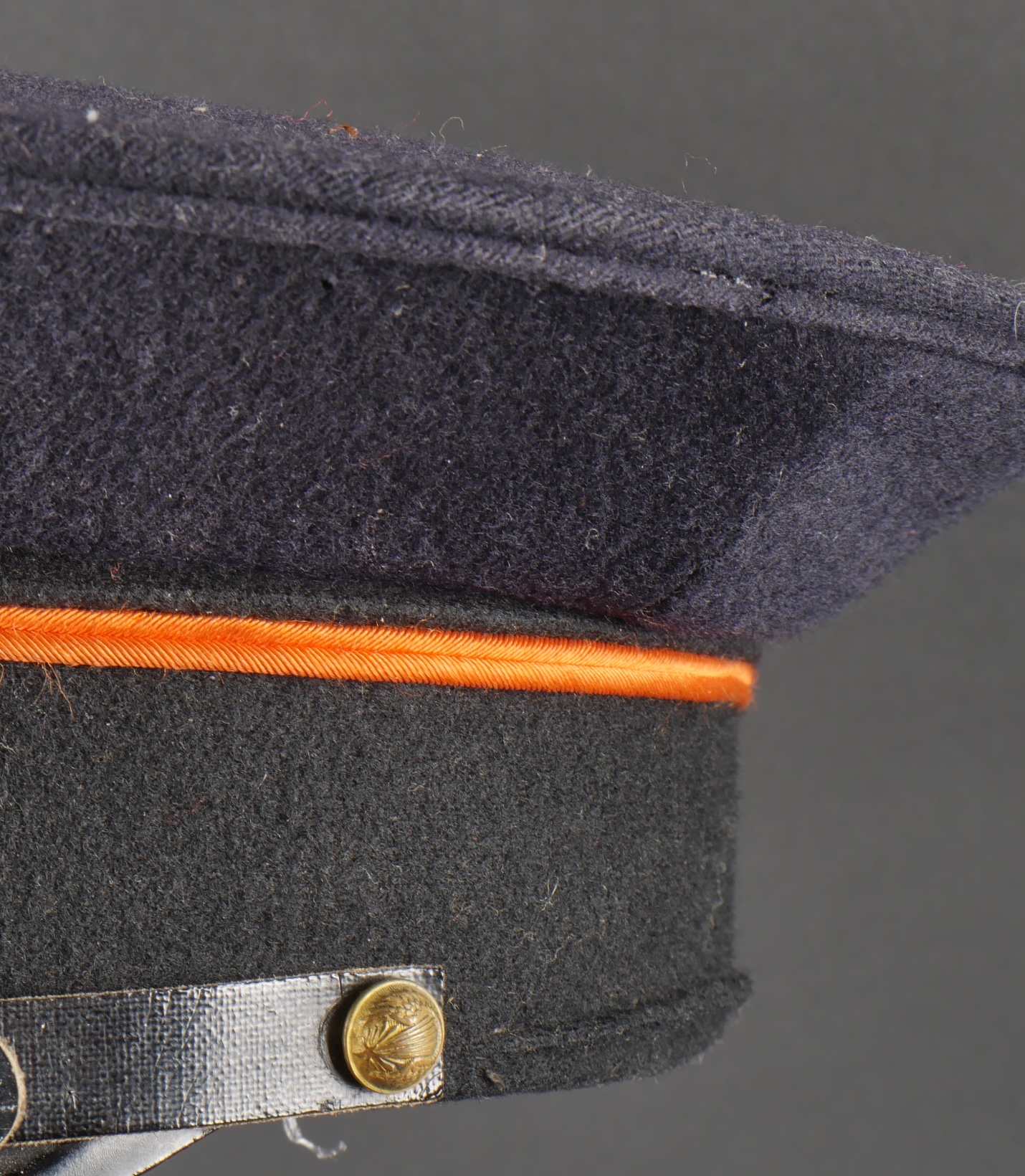 Ensemble comprenant une casquette de l’Armée de l’air modèle 35. Confectionnée en drap de laine bleu, passepoil orange, petits boutons ornés de l’insigne de l’Armée de l’Air retenant une fausse jugulaire. Insigne frontale en tissu, avec ailes du type Troupe. Visière en matériaux composites, bandeau en cuir Noir, étiquette au fond de la coiffe d’un tailleur à Albi. On y joint un chapeau de brousse réglementaire de type Métropole, en toile beige, pression en peinture, tampon du fabricant SEMA ainsi que celui de taille 56. Set including Air Force cap model 35 blue wool with orange piping small buttons bearing Air Force insignia holding false chinstrap cloth badge with wings troop type composite visor black leather sweatband label from tailor in Albi. With it a regulation metropolitan bush hat beige canvas painted snap SEMA maker size 56.