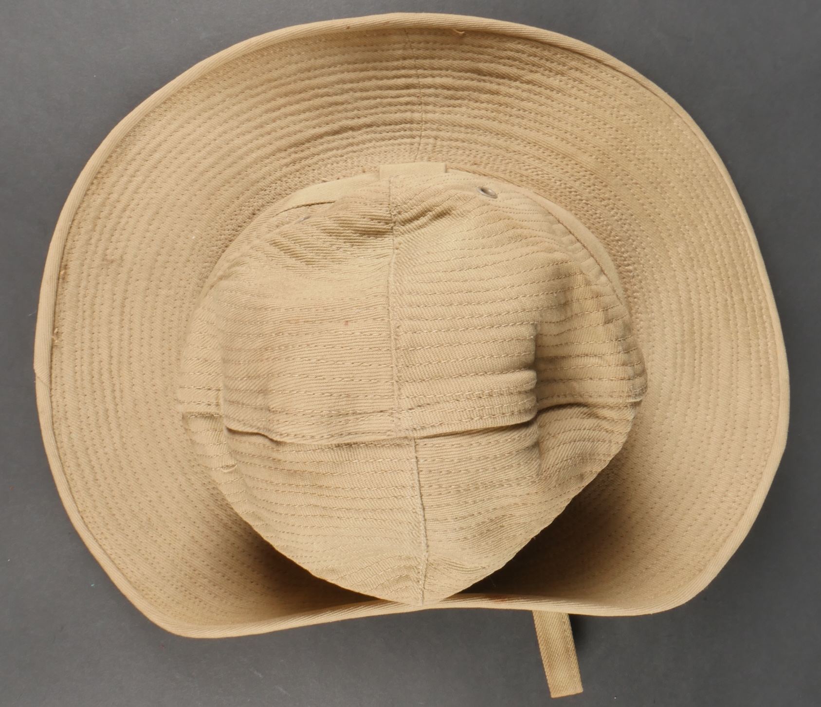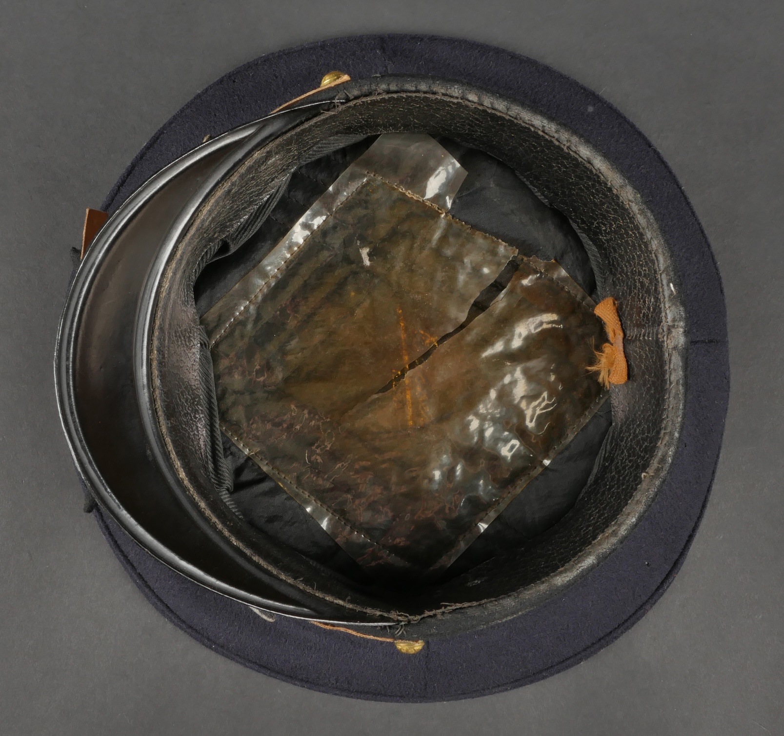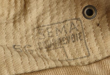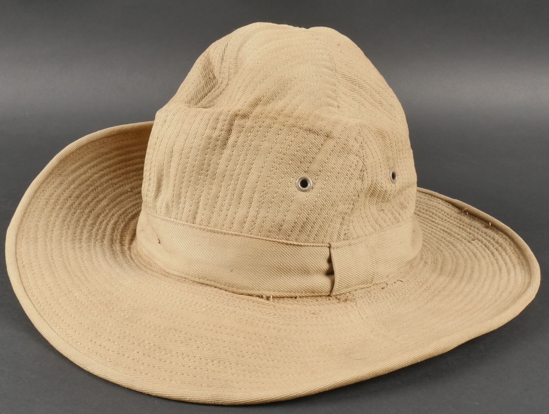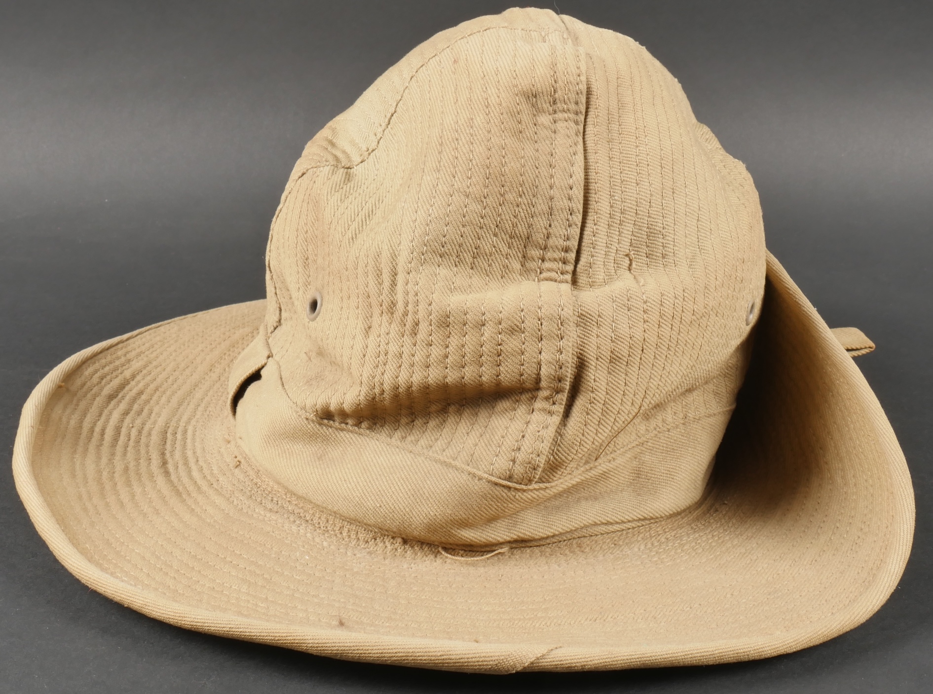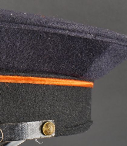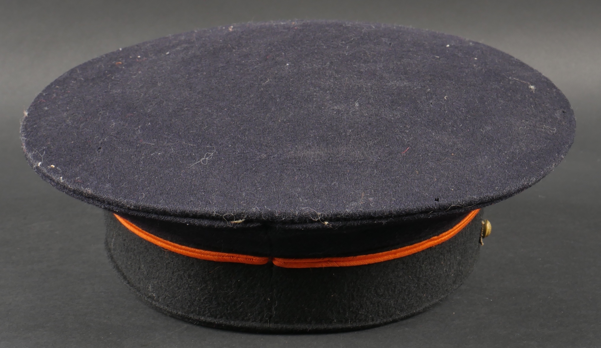 Ensemble comprenant une casquette de l’Armée de l’air modèle 35. Confectionnée en drap de laine bleu, passepoil orange, petits boutons ornés de l’insigne de l’Armée de l’Air retenant une fausse jugulaire. Insigne frontale en tissu, avec ailes du type Troupe. Visière en matériaux composites, bandeau en cuir Noir, étiquette au fond de la coiffe d’un tailleur à Albi. On y joint un chapeau de brousse réglementaire de type Métropole, en toile beige, pression en peinture, tampon du fabricant SEMA ainsi que celui de taille 56. Set including Air Force cap model 35 blue wool with orange piping small buttons bearing Air Force insignia holding false chinstrap cloth badge with wings troop type composite visor black leather sweatband label from tailor in Albi. With it a regulation metropolitan bush hat beige canvas painted snap SEMA maker size 56.
