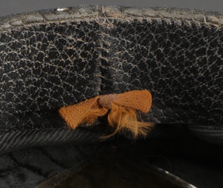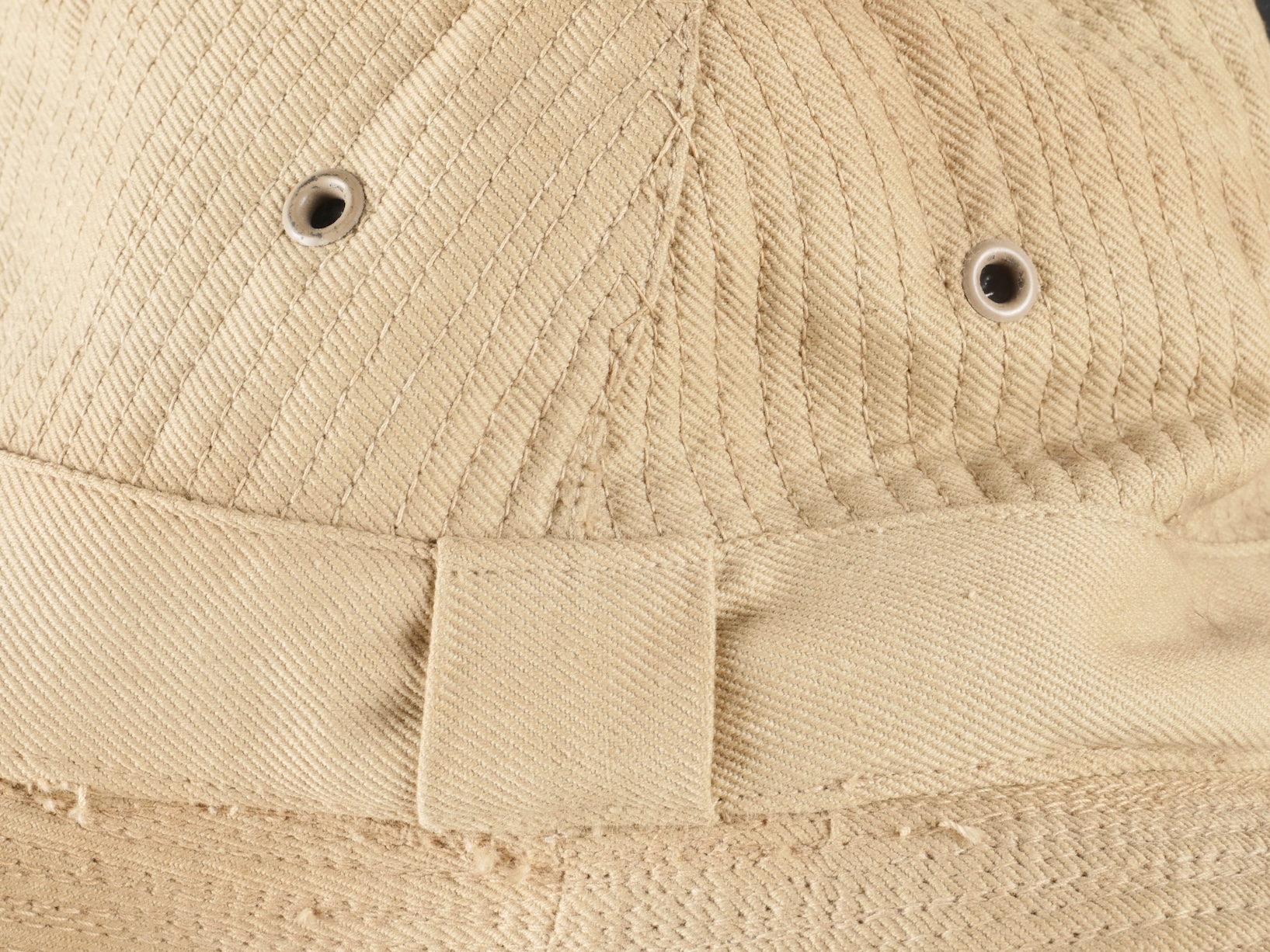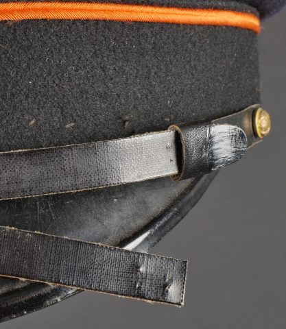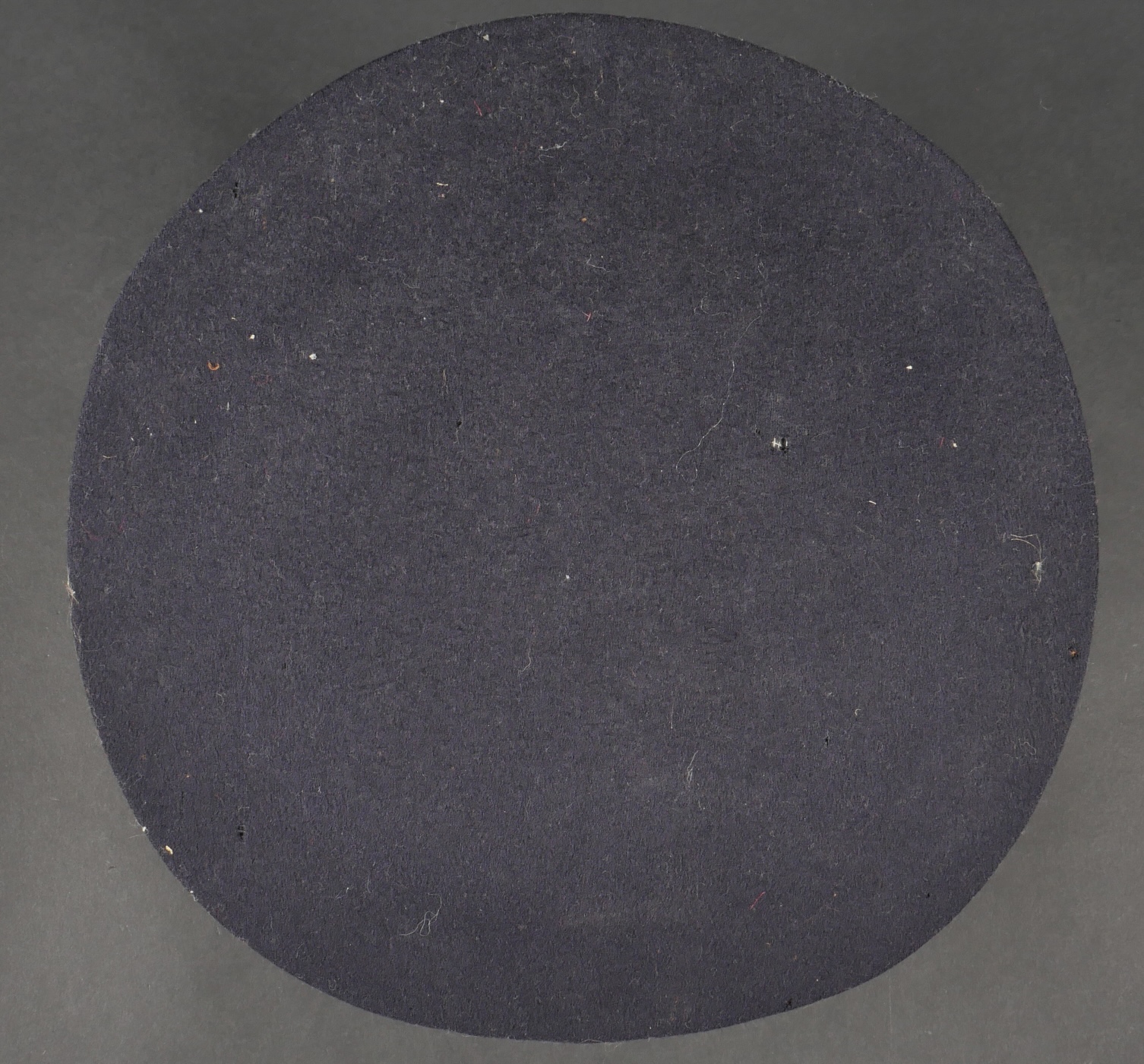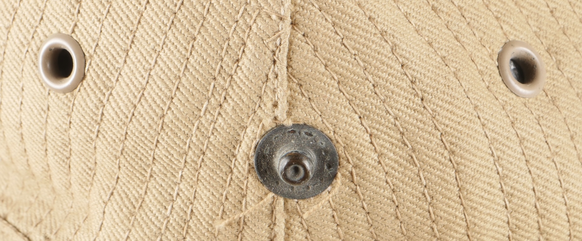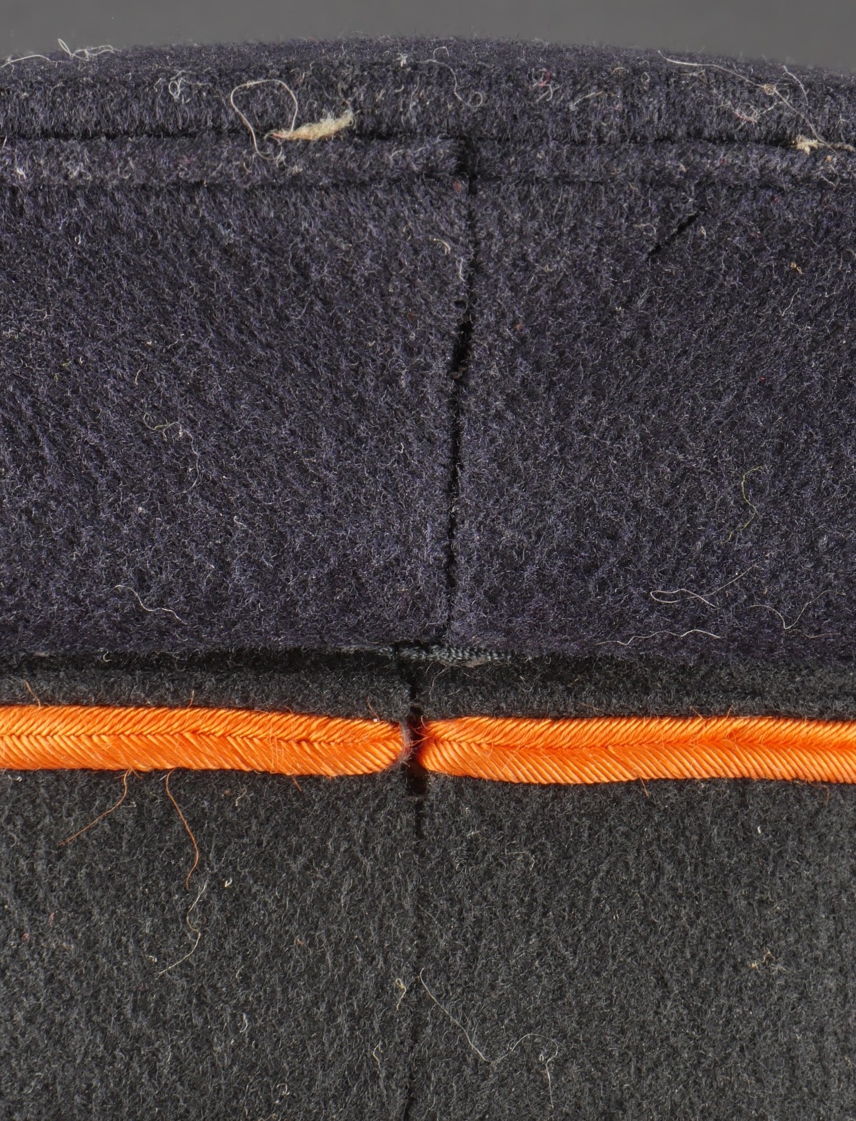 Ensemble comprenant une casquette de l’Armée de l’air modèle 35. Confectionnée en drap de laine bleu, passepoil orange, petits boutons ornés de l’insigne de l’Armée de l’Air retenant une fausse jugulaire. Insigne frontale en tissu, avec ailes du type Troupe. Visière en matériaux composites, bandeau en cuir Noir, étiquette au fond de la coiffe d’un tailleur à Albi. On y joint un chapeau de brousse réglementaire de type Métropole, en toile beige, pression en peinture, tampon du fabricant SEMA ainsi que celui de taille 56. Set including Air Force cap model 35 blue wool with orange piping small buttons bearing Air Force insignia holding false chinstrap cloth badge with wings troop type composite visor black leather sweatband label from tailor in Albi. With it a regulation metropolitan bush hat beige canvas painted snap SEMA maker size 56.